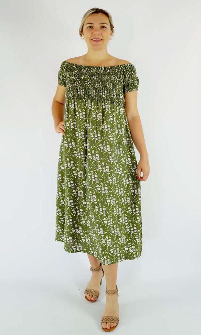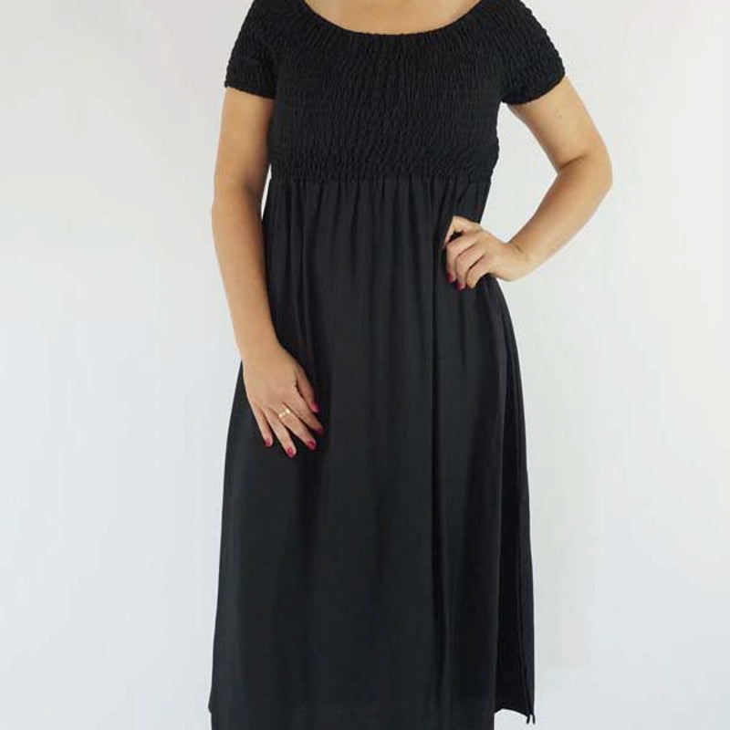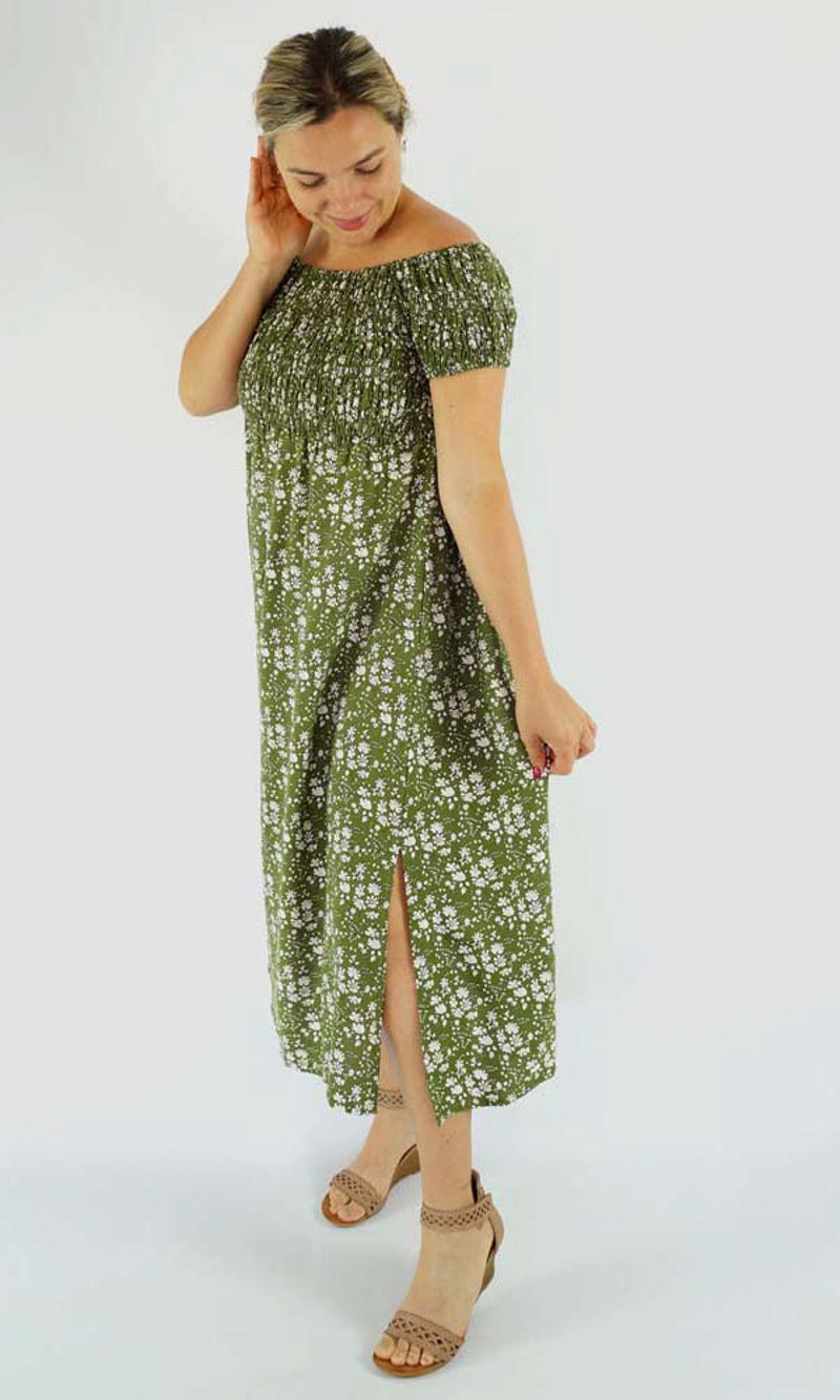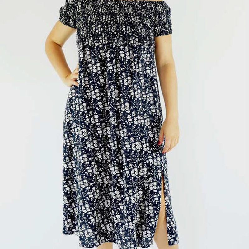 This Middie Dress is made from 100% Rayon. This is an off the shoulder mid length dress that features shirred elastic bodice, short sleeves. This dress has splits on the sides and can be dressed up or down.