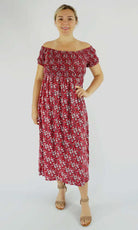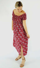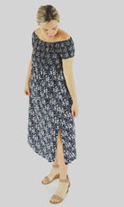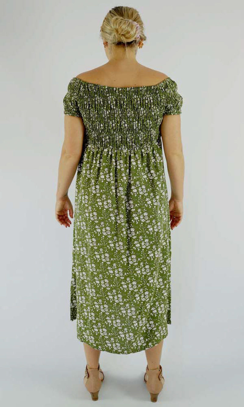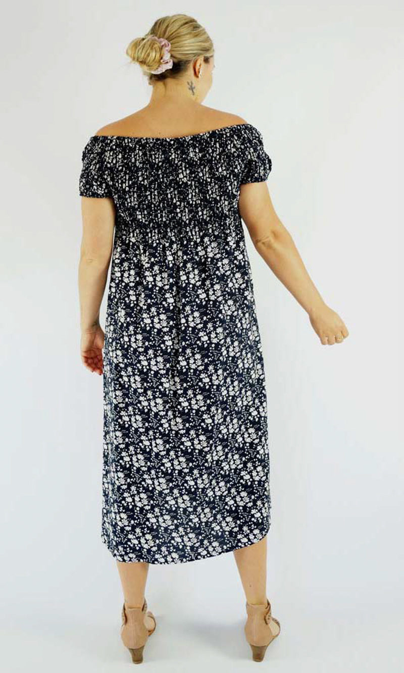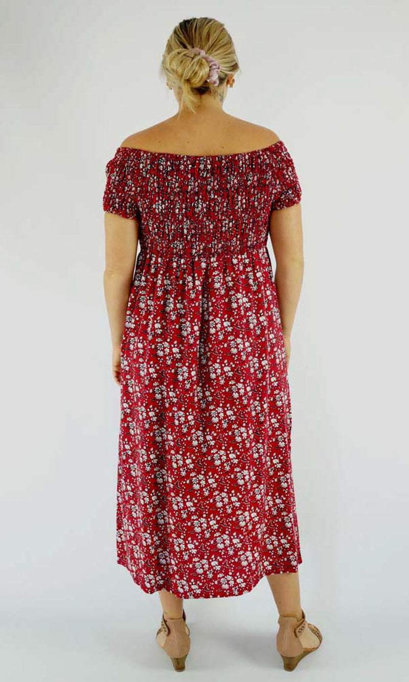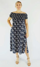 This Middie Dress is made from 100% Rayon. This is an off the shoulder mid length dress that features shirred elastic bodice, short sleeves. This dress has splits on the sides and can be dressed up or down.