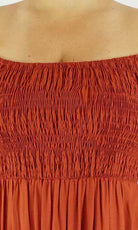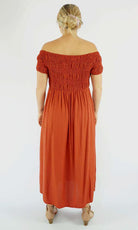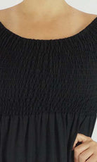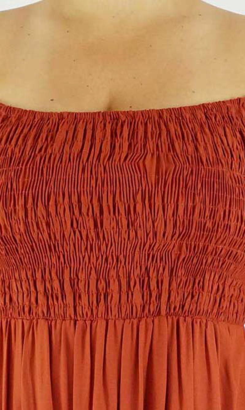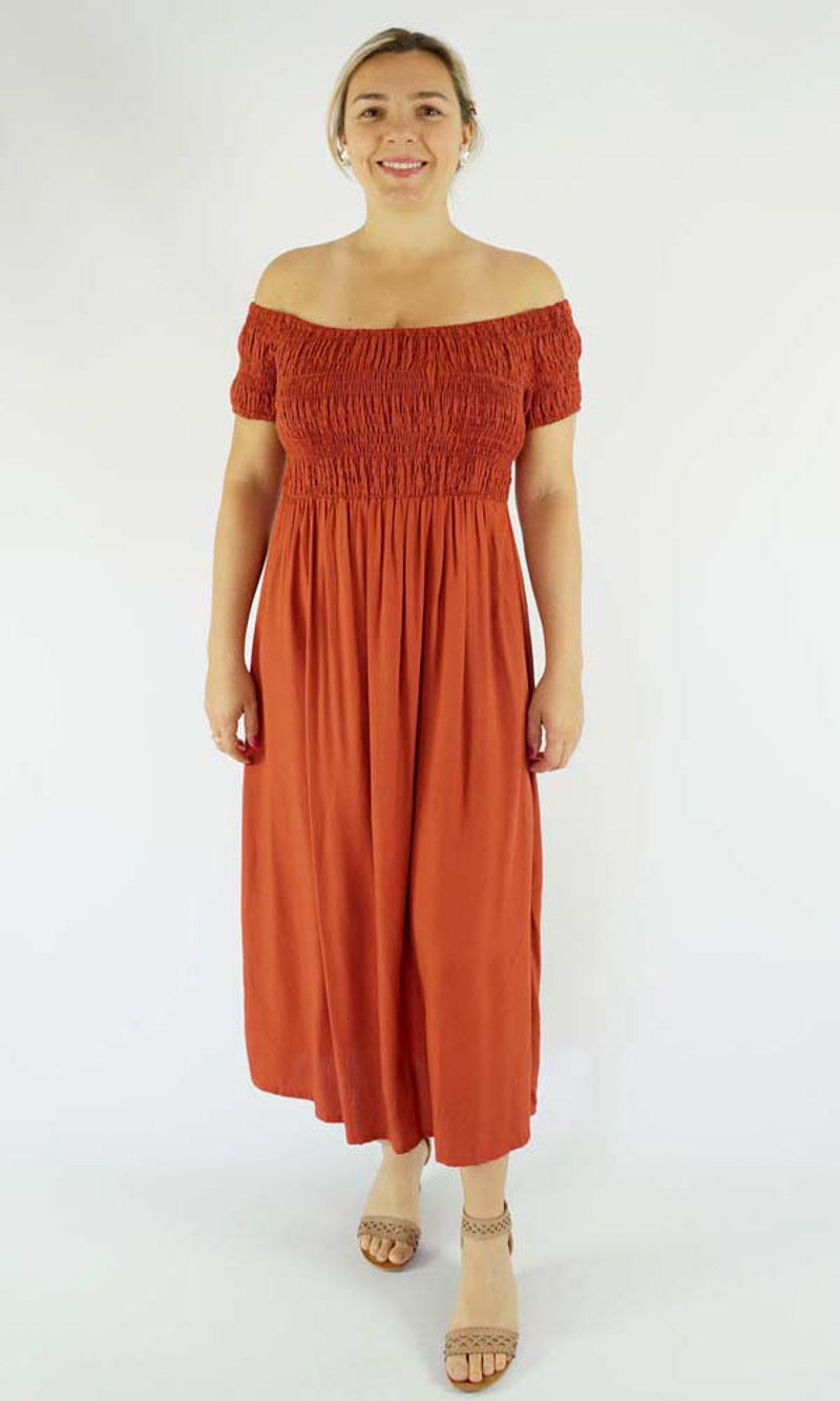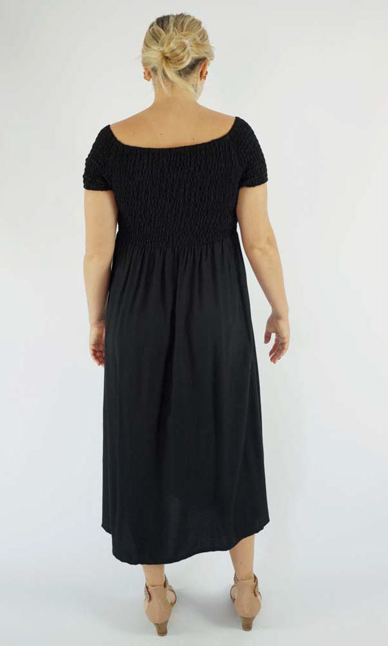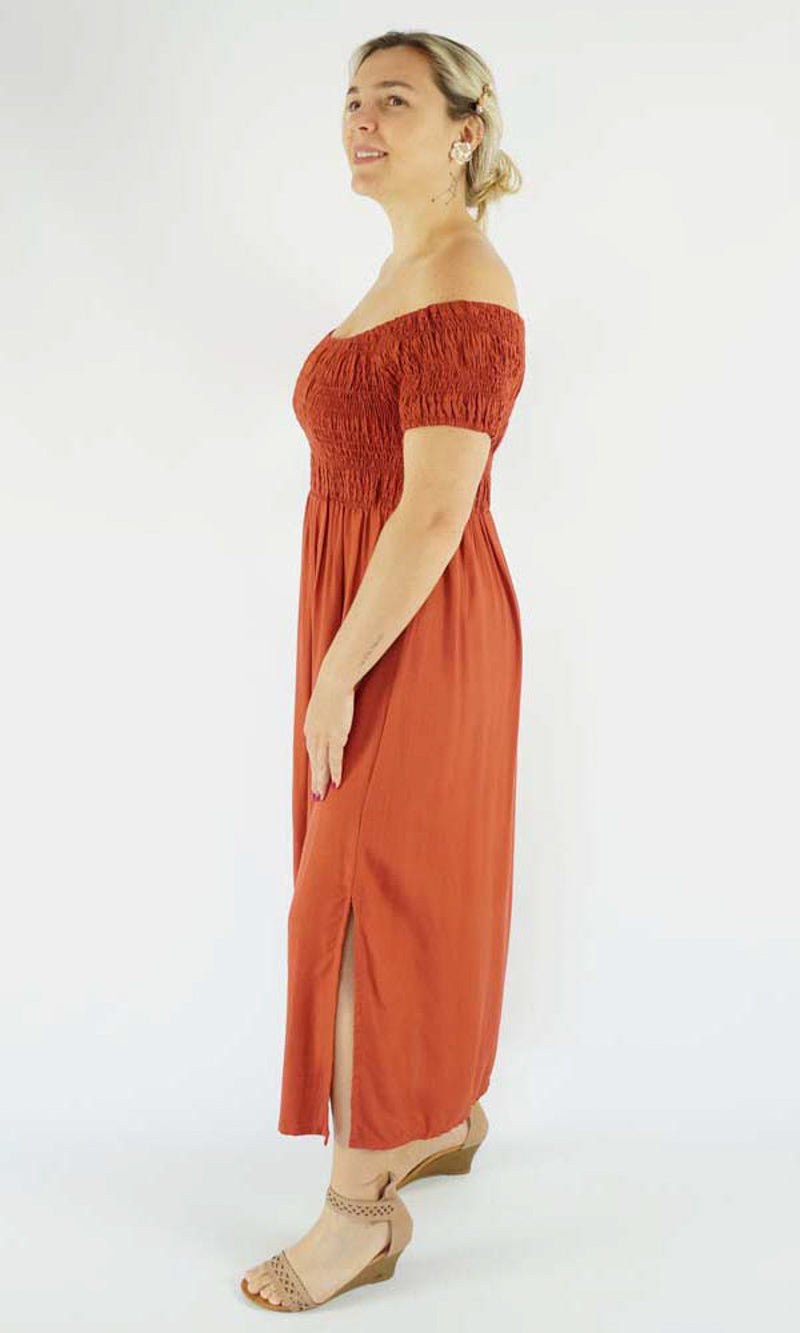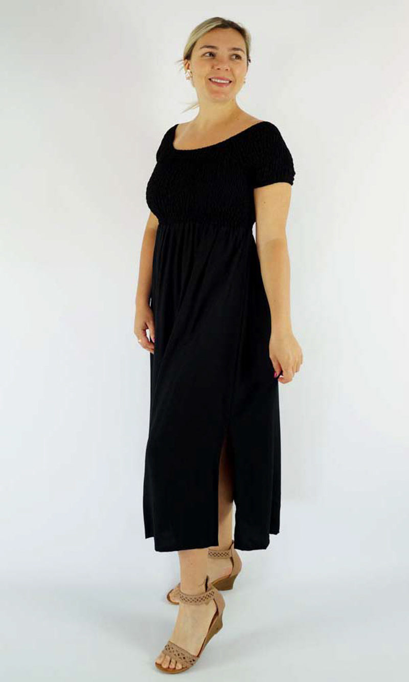 This Middie Dress is made from 100% Rayon. This is an off the shoulder mid length dress that features shirred elastic bodice, short sleeves. This dress has splits on the sides and can be dressed up or down.