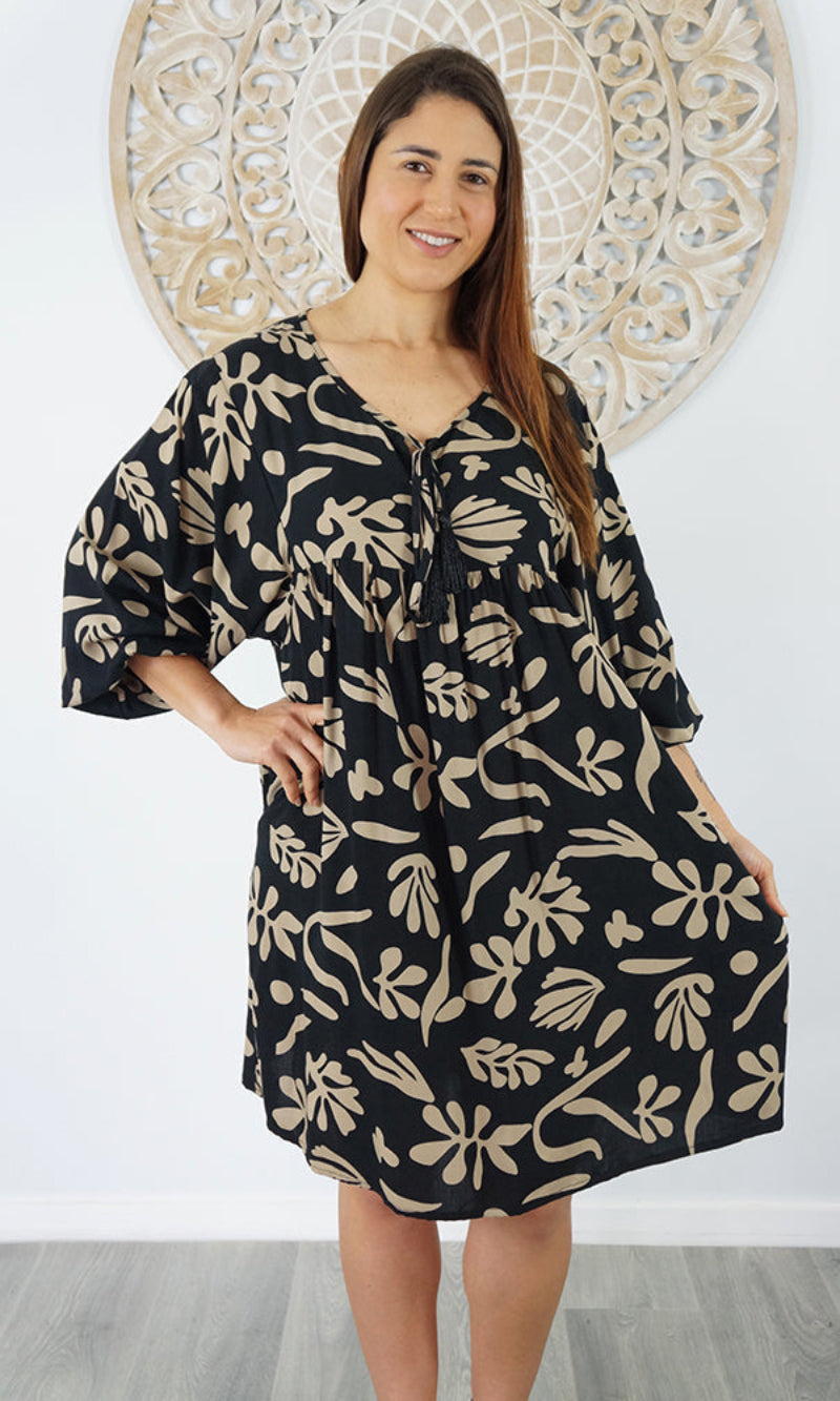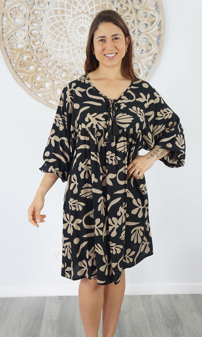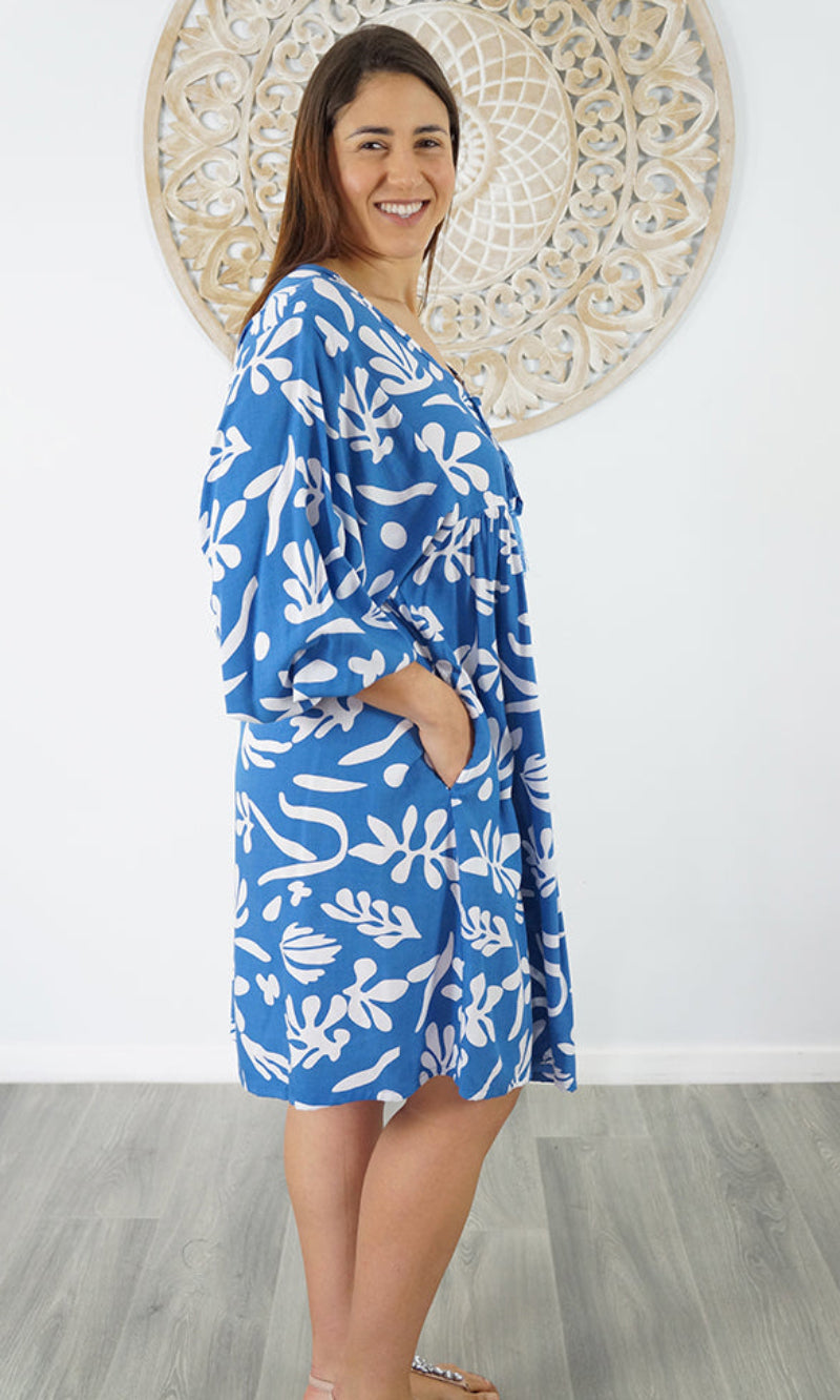 The Avocado Dress is a versatile choice for any wardrobe, providing both style and comfort. With a tie-up V-neckline and mid-length puff elastic arms, this dress also includes convenient side pockets. You will look and feel fabulous in this fabulous piece.
