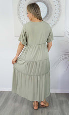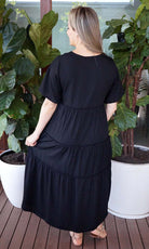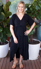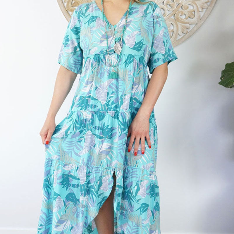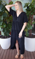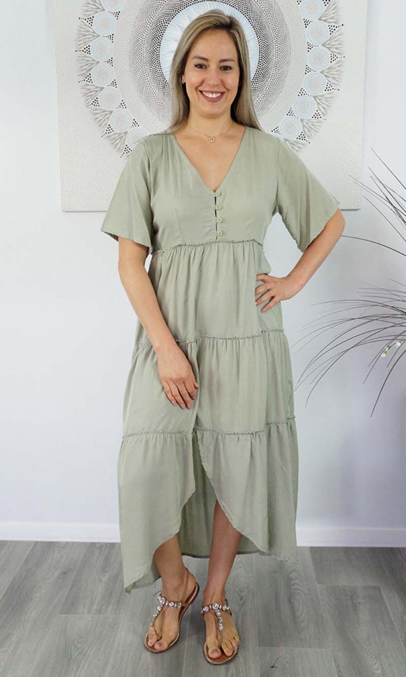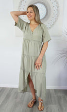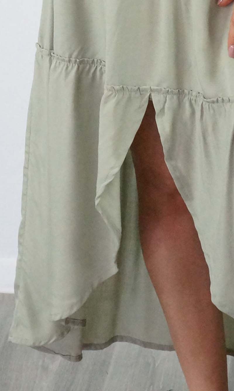 Featuring a V-neckline, relaxed sleeves & tiered gathered layers down to a front split.