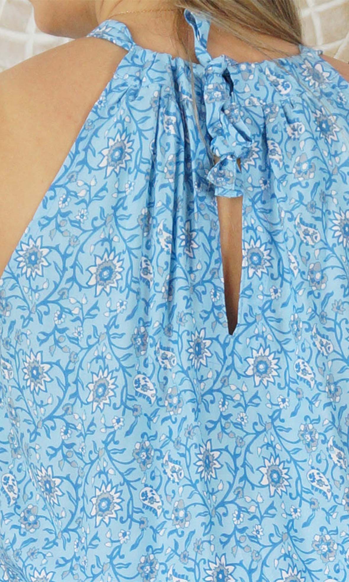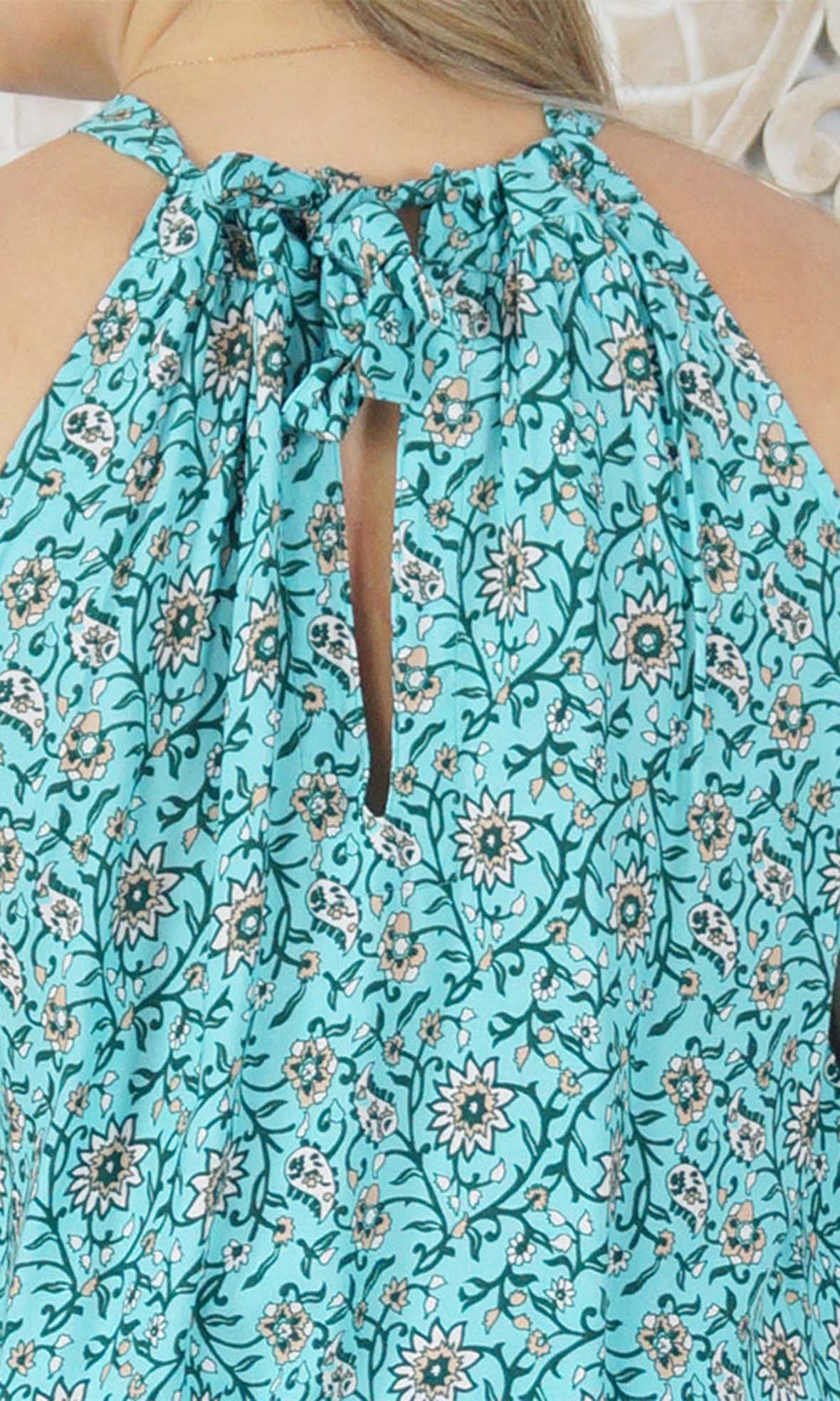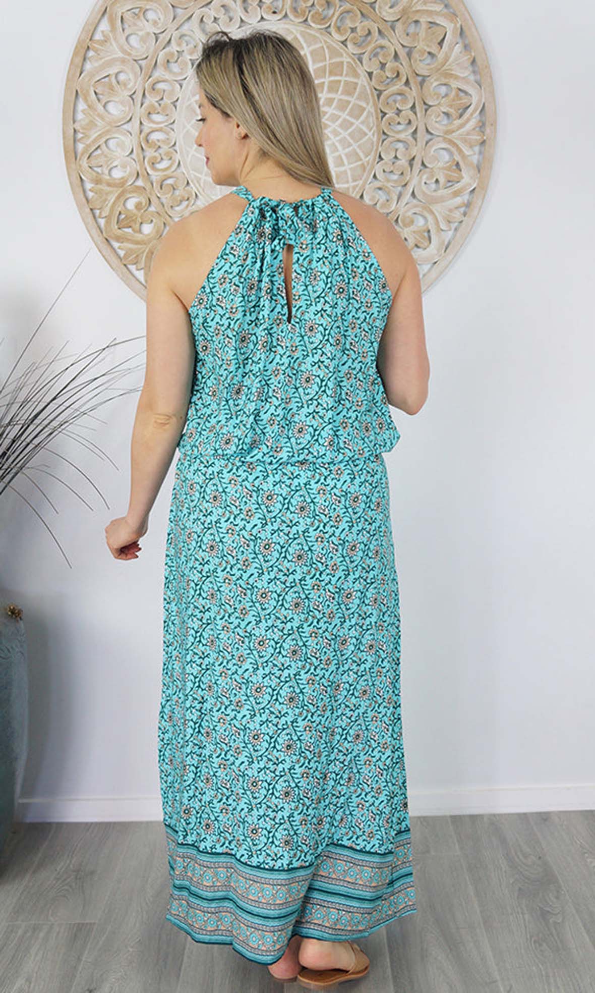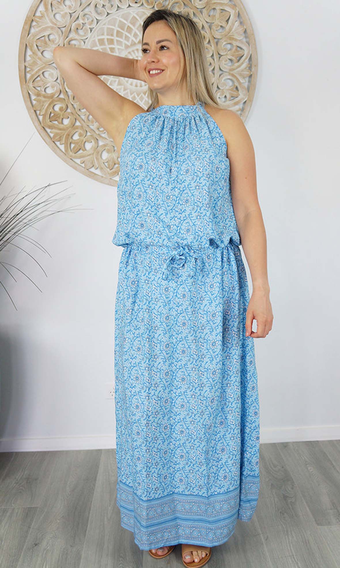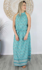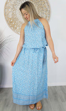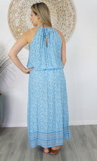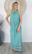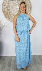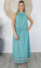 The Long Chloe Dress features a high halter neck design, elastic drawstring tie waist which allows this rayon maxi to fall beautifully on any body shape.