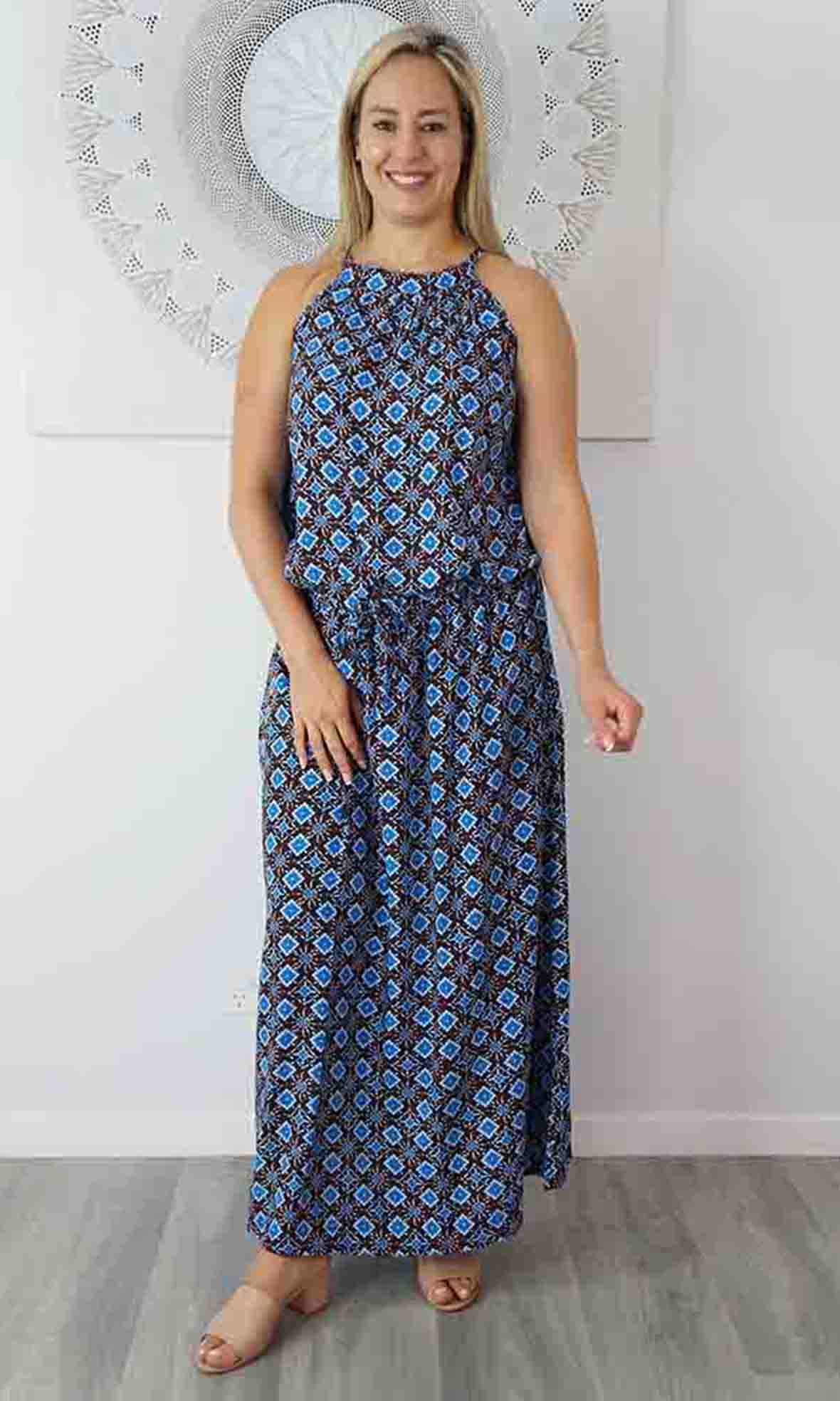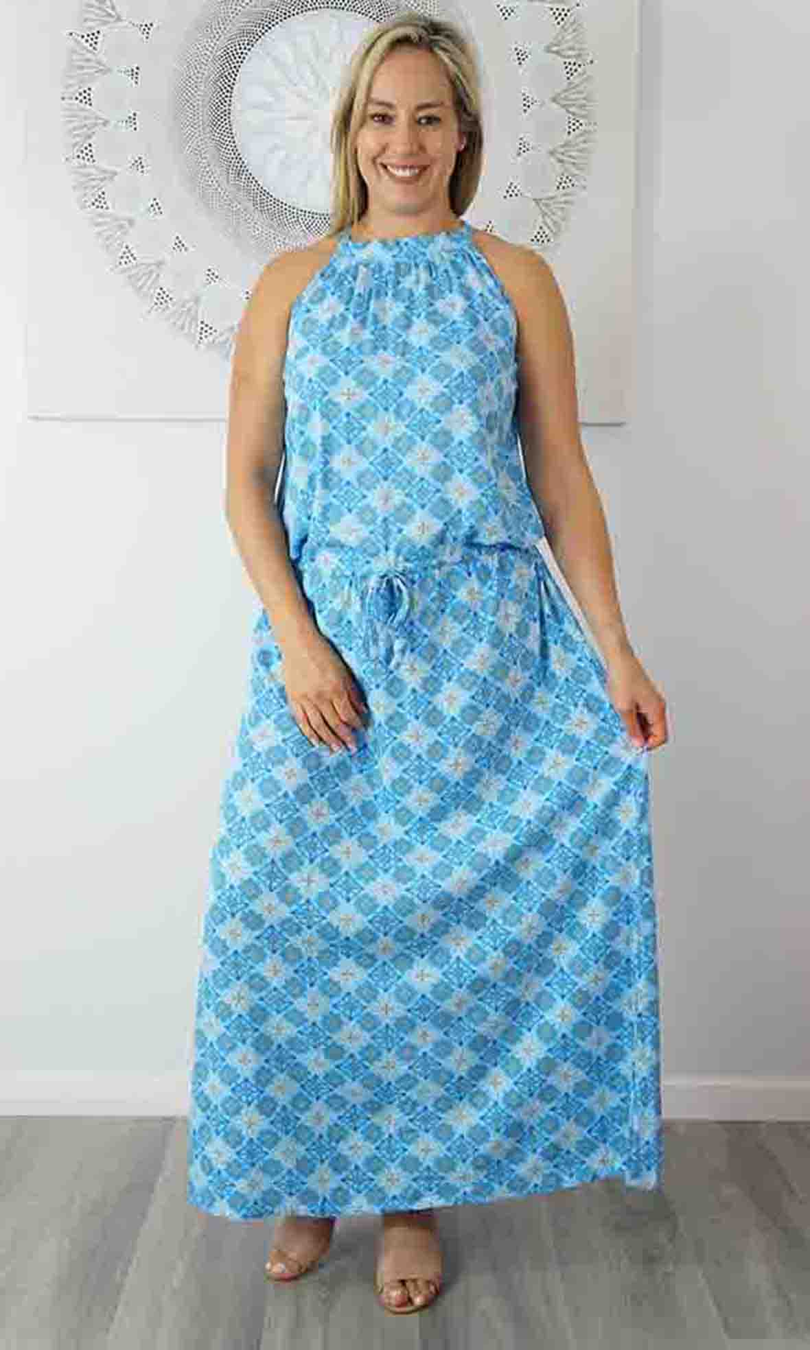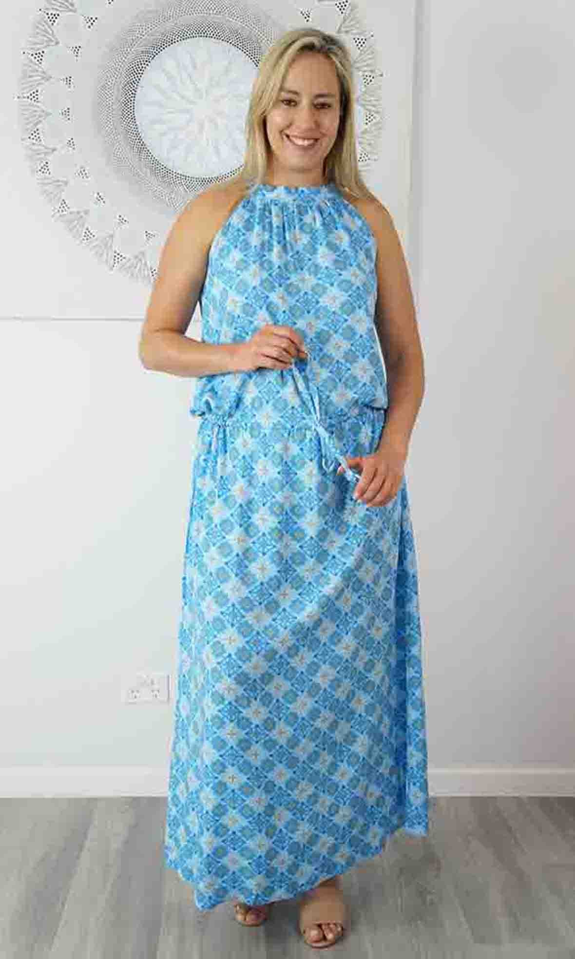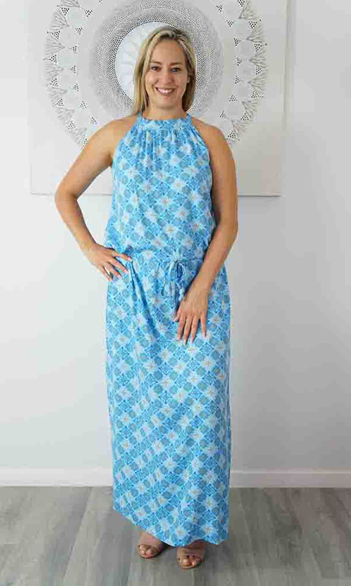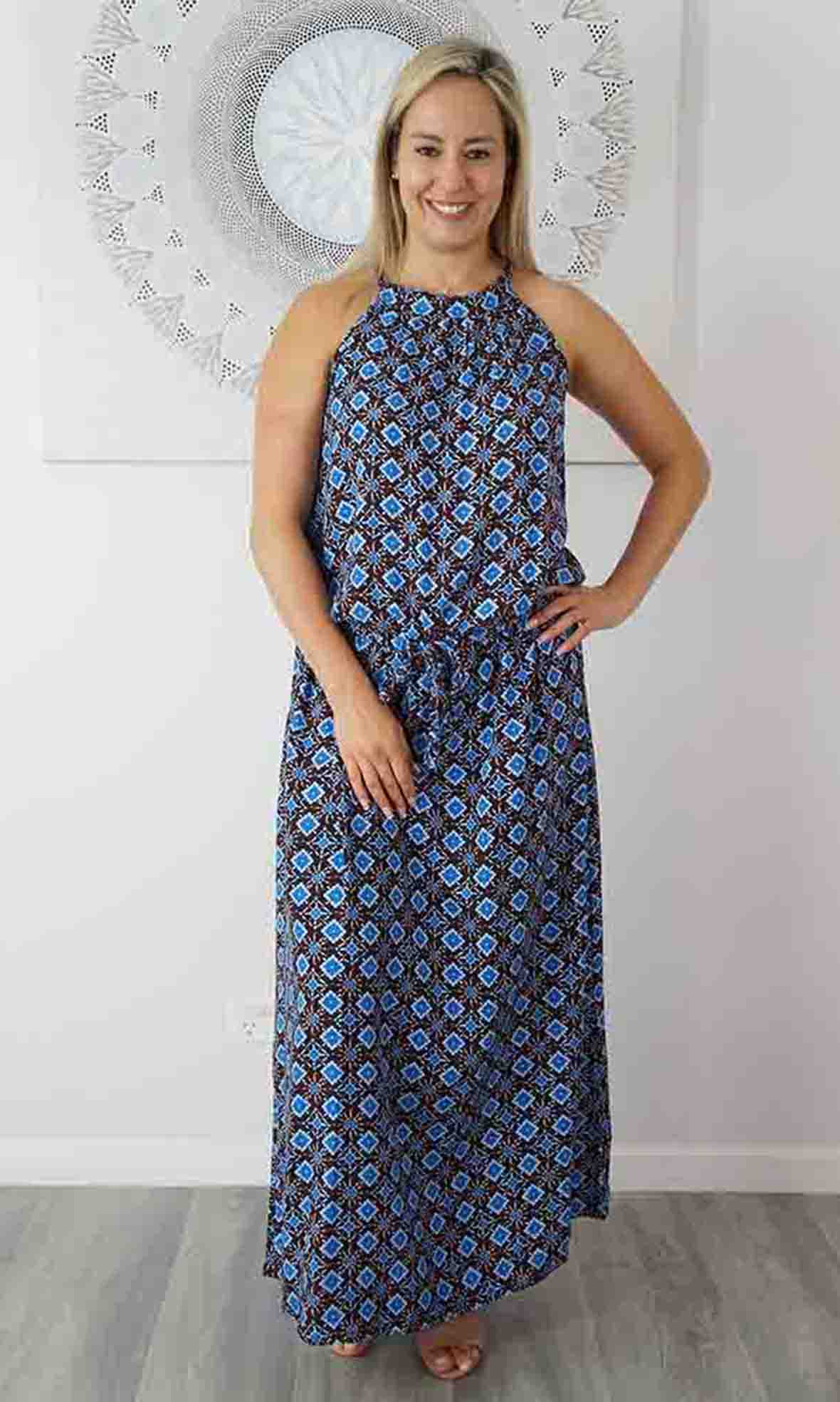 The Long Chloe Dress features a high halter neck design, elastic drawstring tie waist which allows this rayon maxi to fall beautifully on any body shape.
