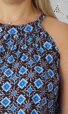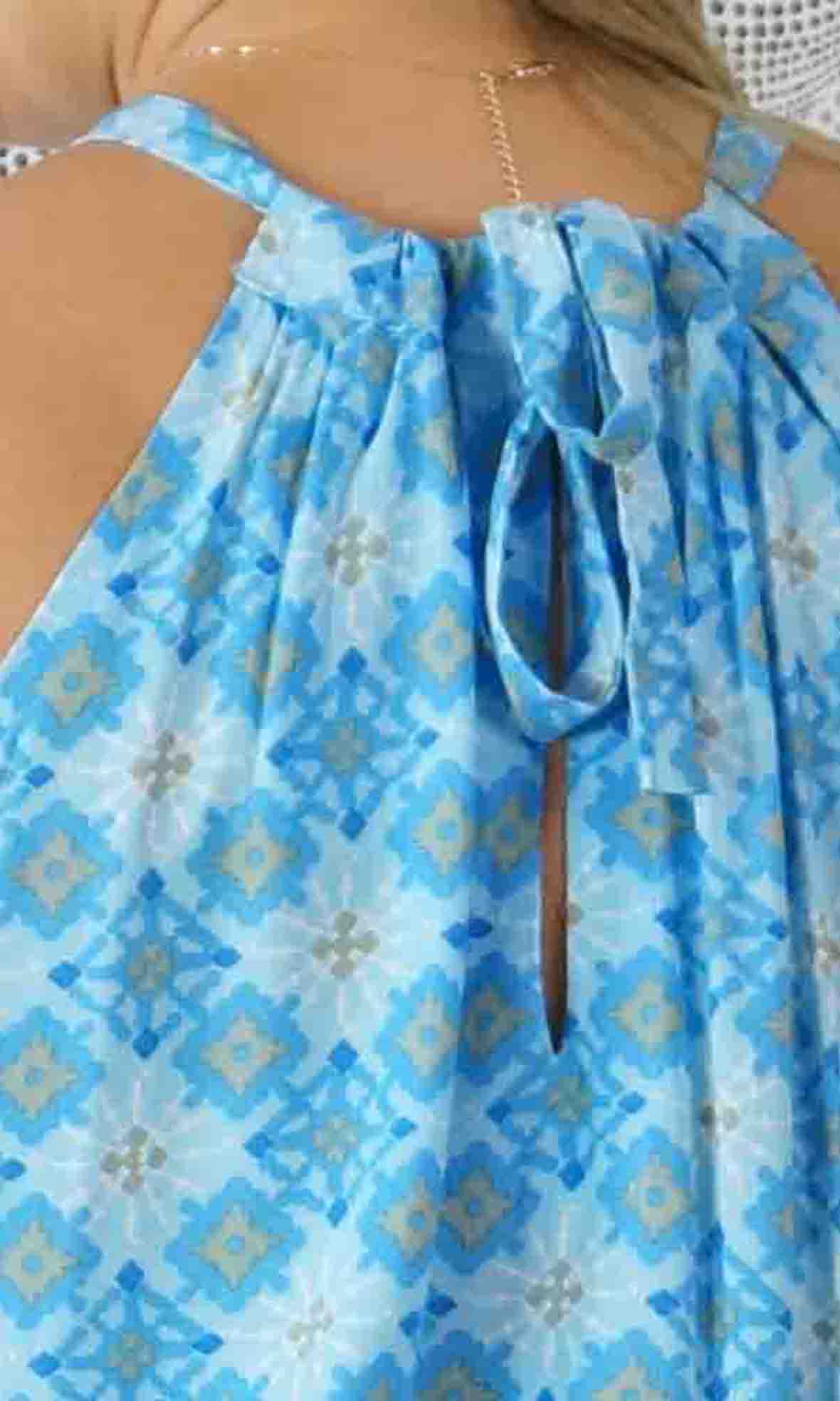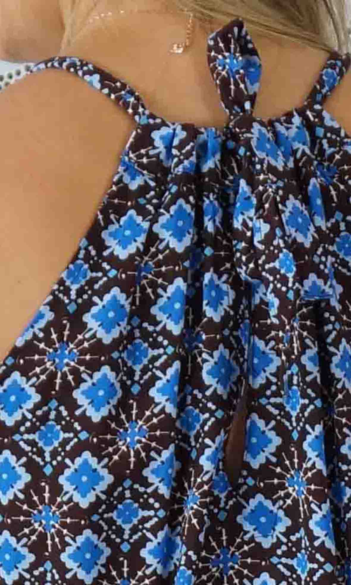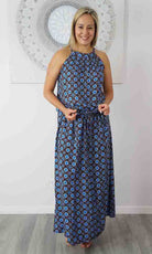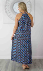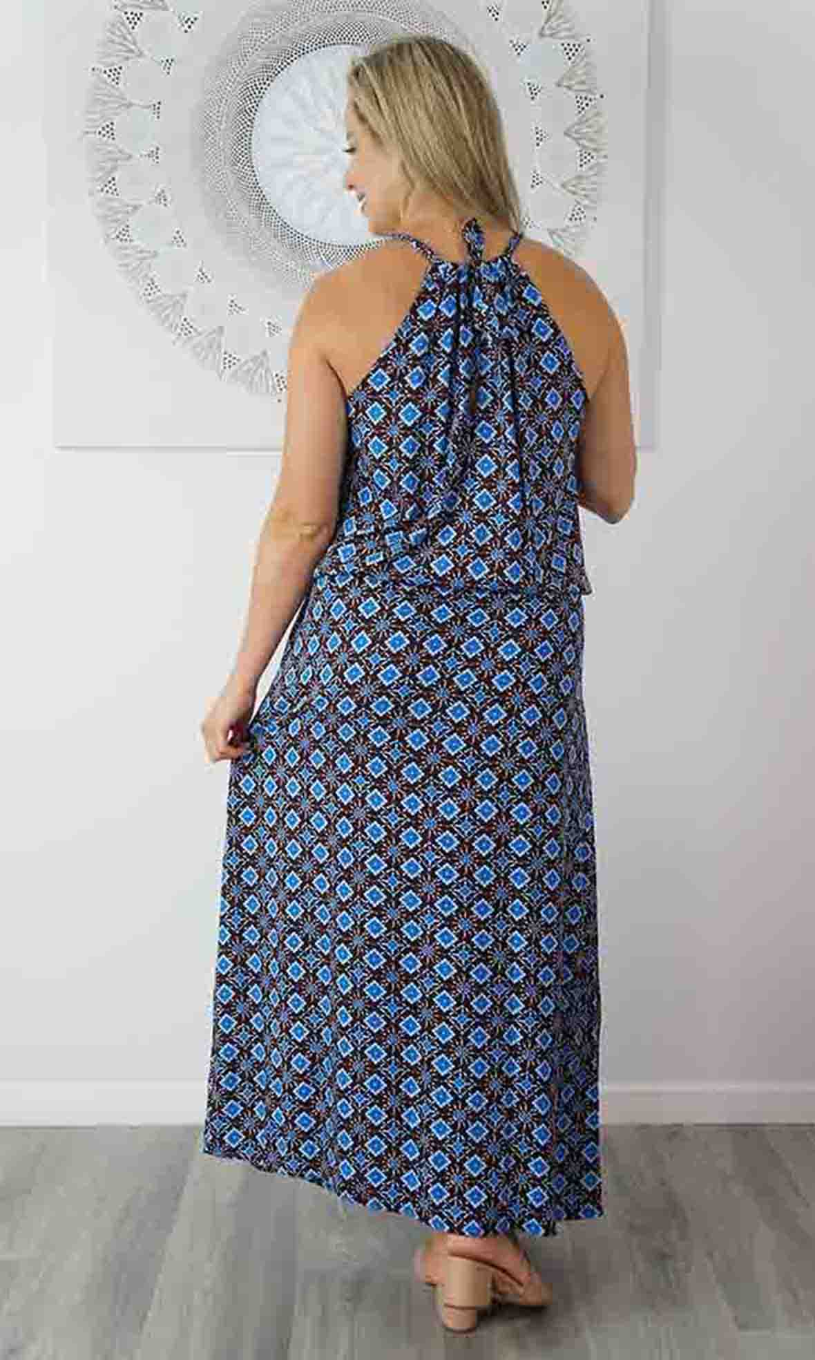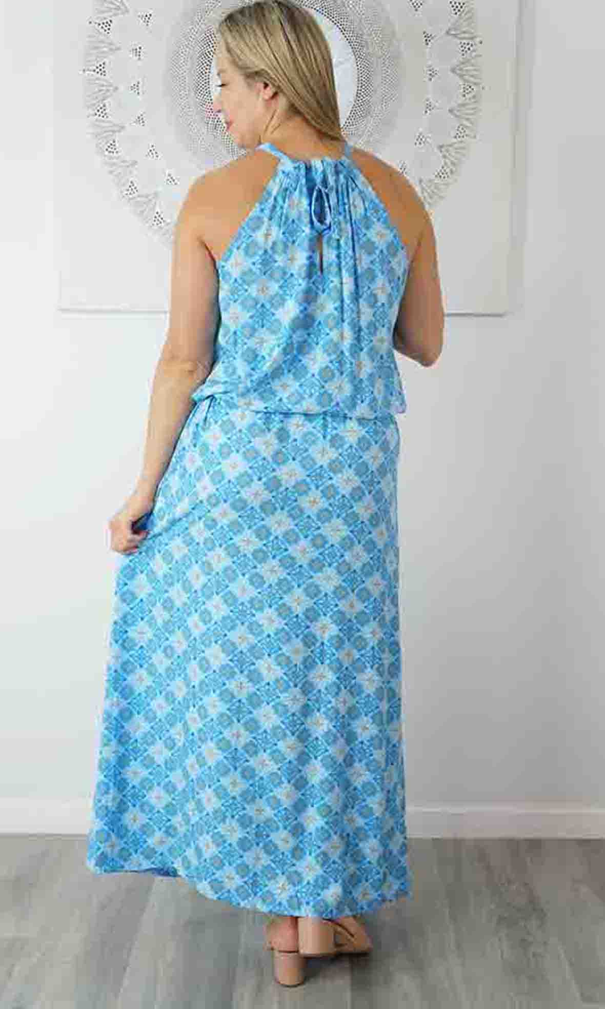The Long Chloe Dress features a high halter neck design, elastic drawstring tie waist which allows this rayon maxi to fall beautifully on any body shape.