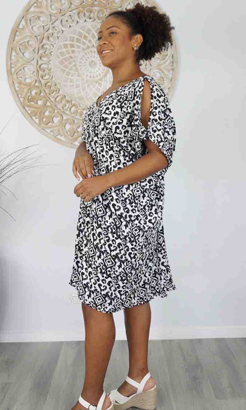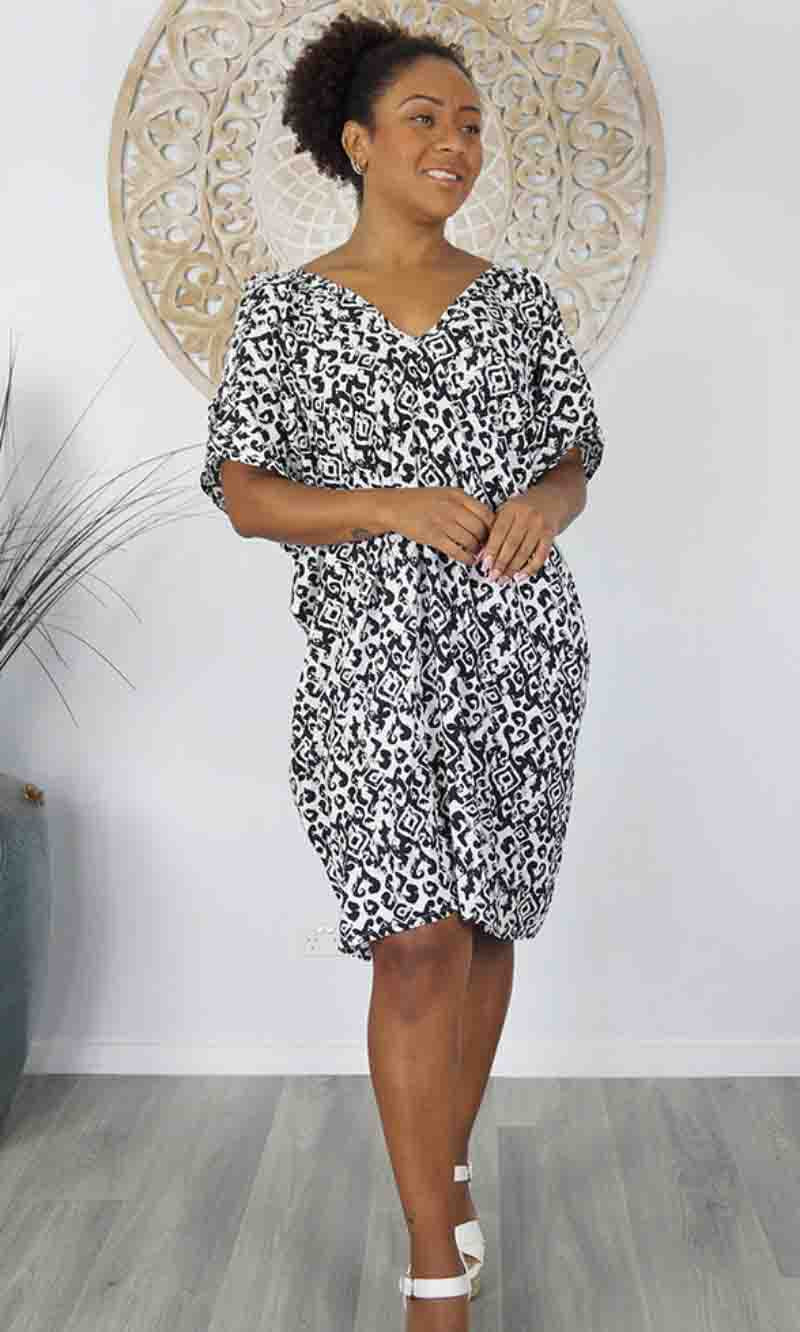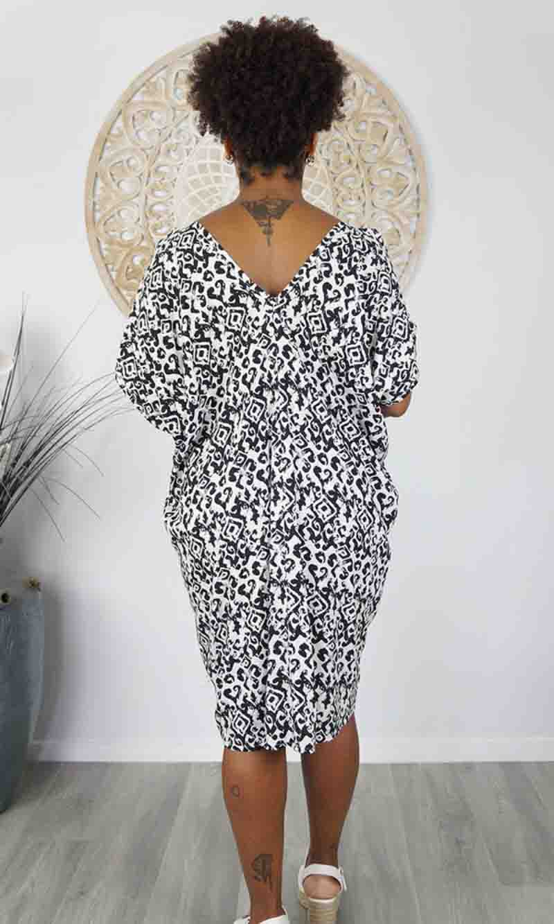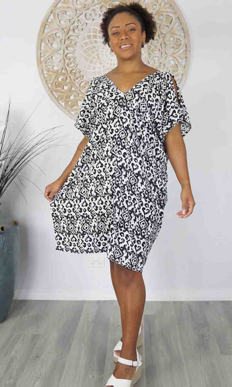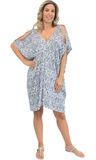 A simple and comfortable dress or tunic for those warm summer days. This rayon garment features a v-neck line, front and back, cut out elbow length sleeves with a button that can be optional to wear undone.