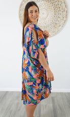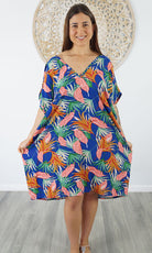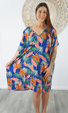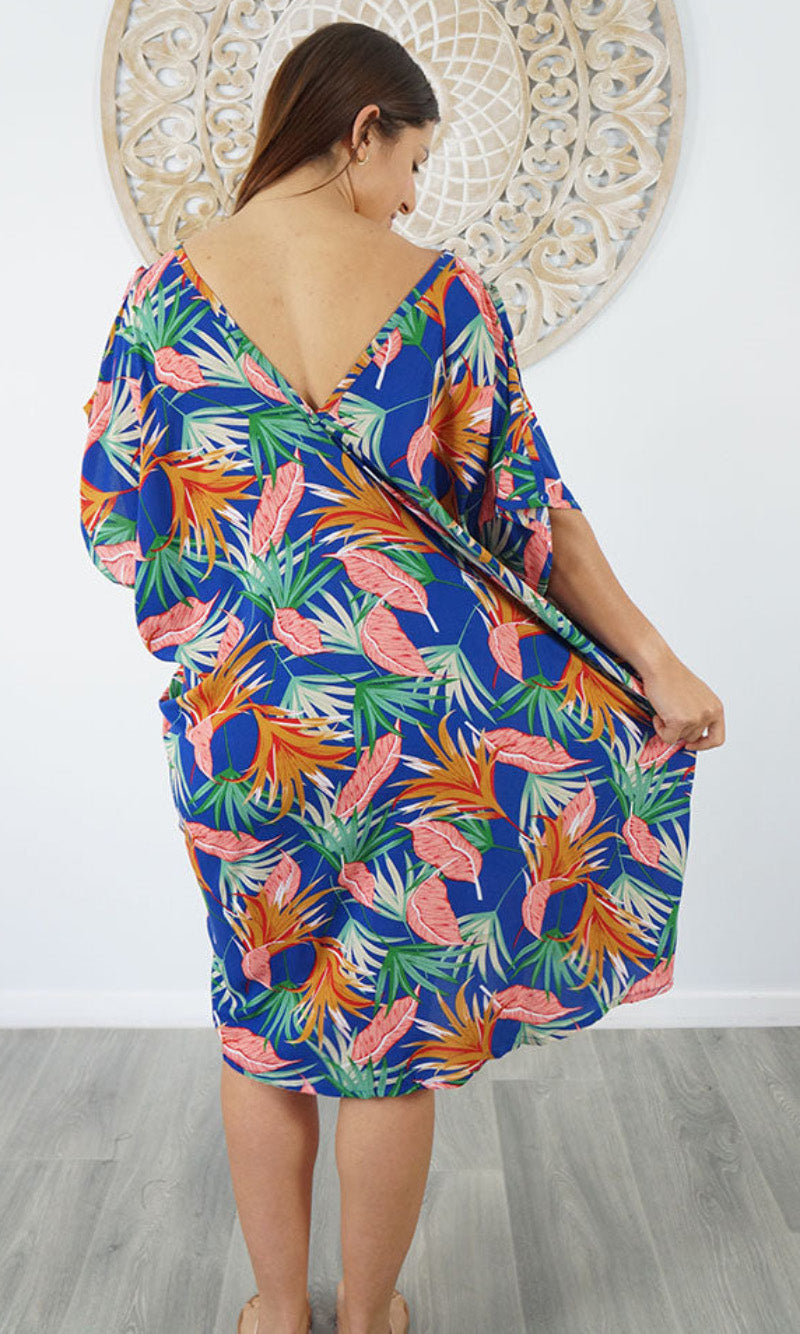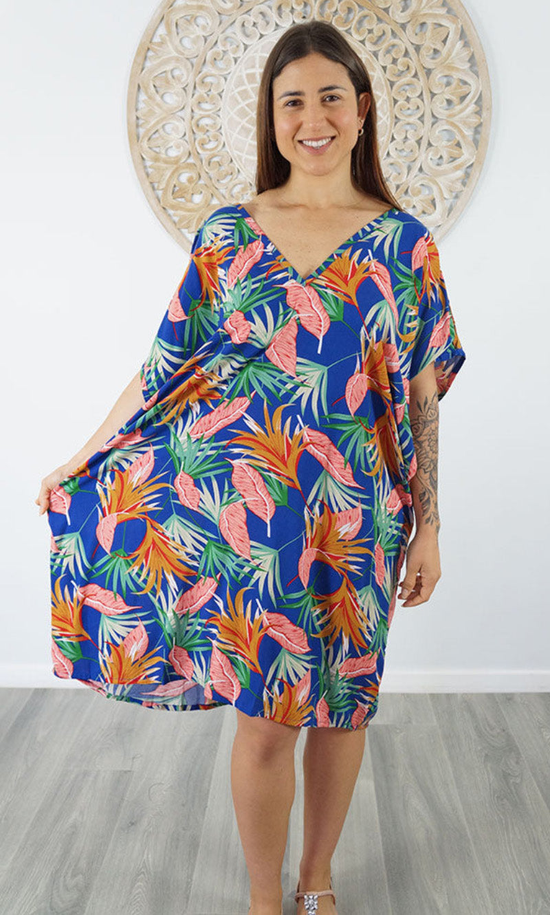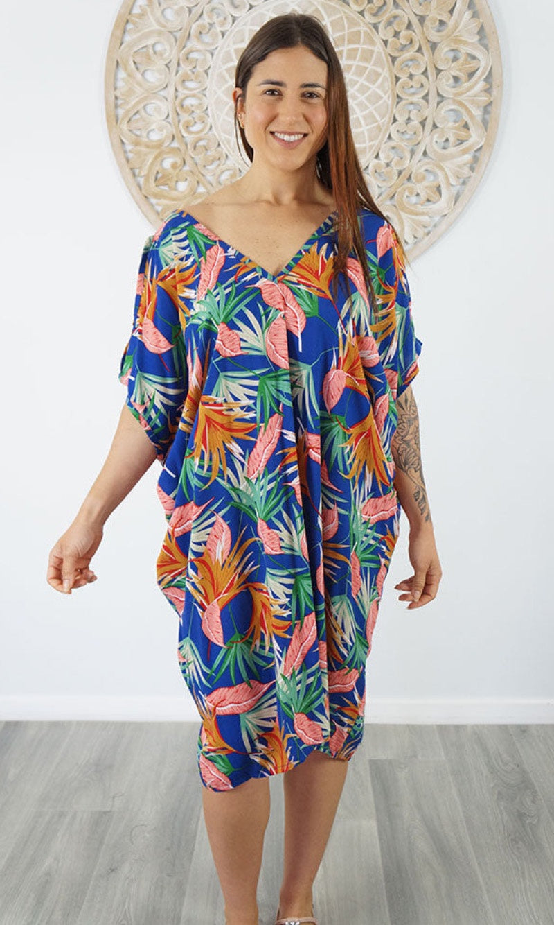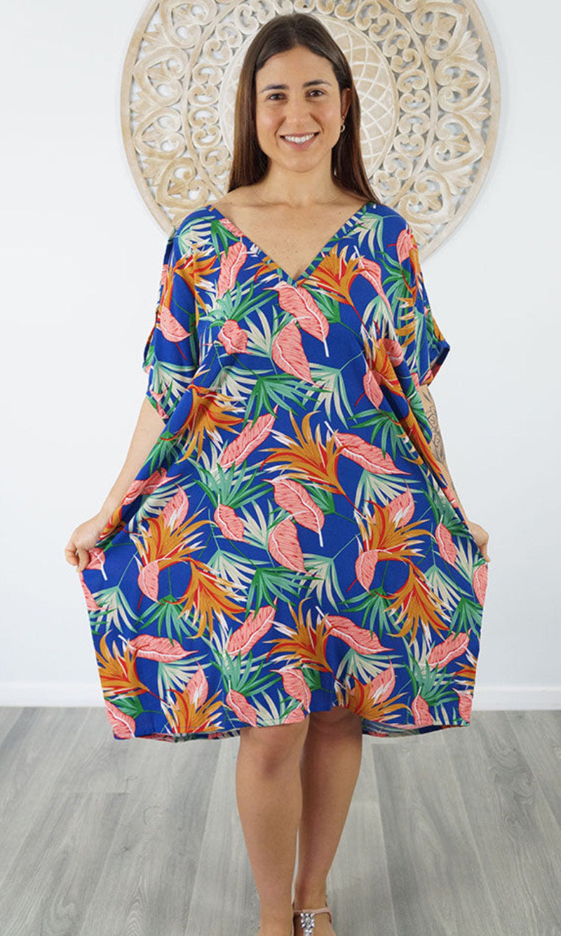 A simple and comfortable dress or tunic for those warm summer days. This rayon garment features a v-neck line, front and back, cut out elbow length sleeves with a button that can be optional to wear undone.