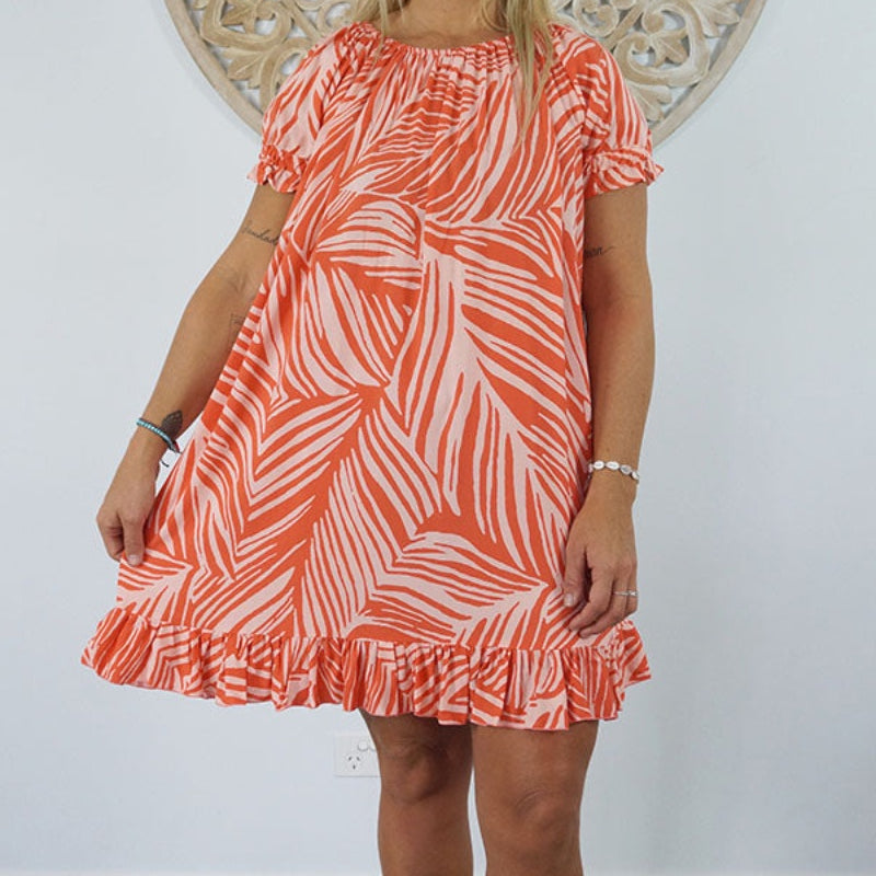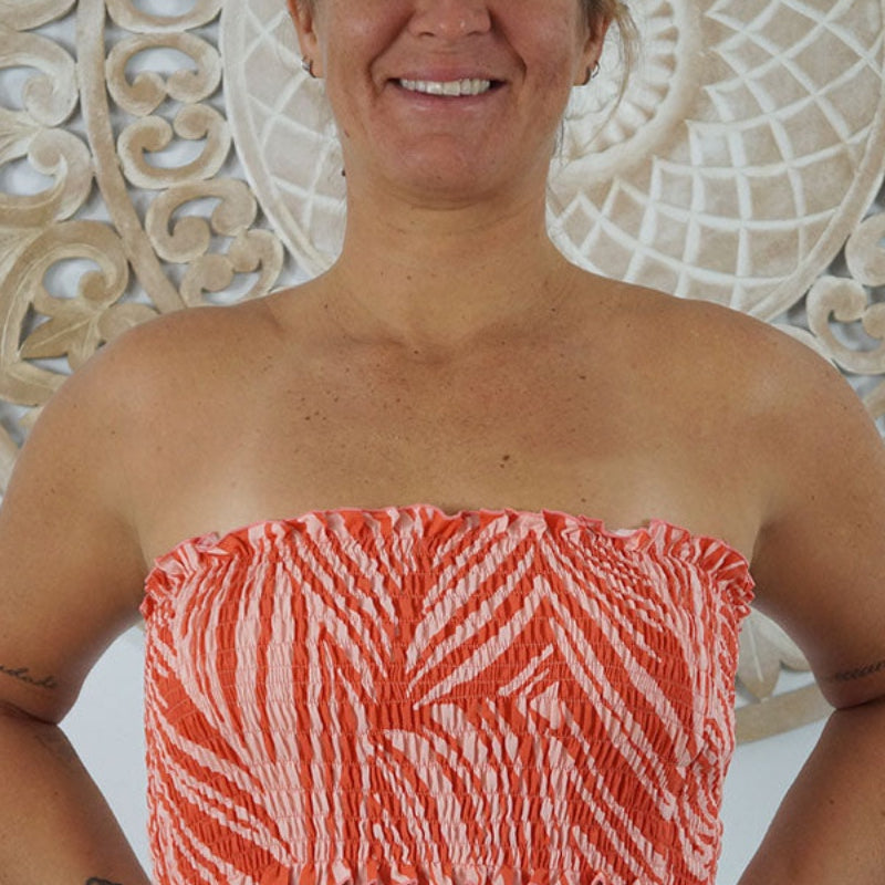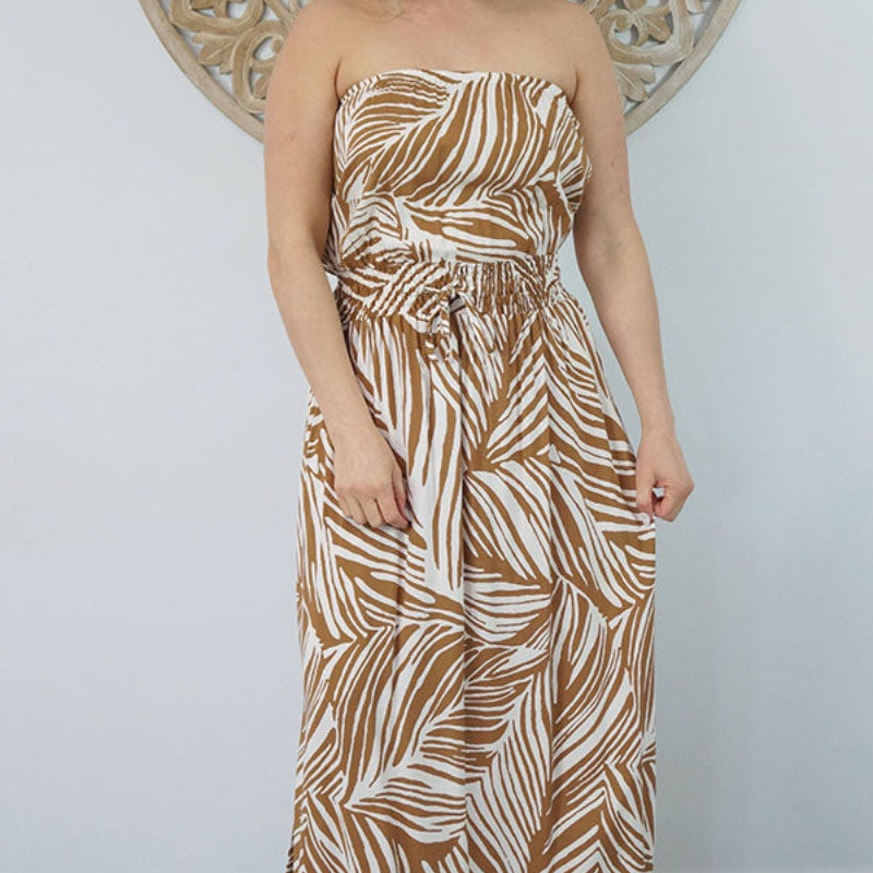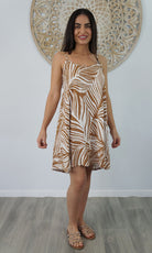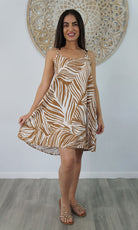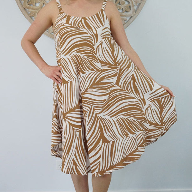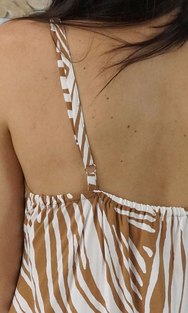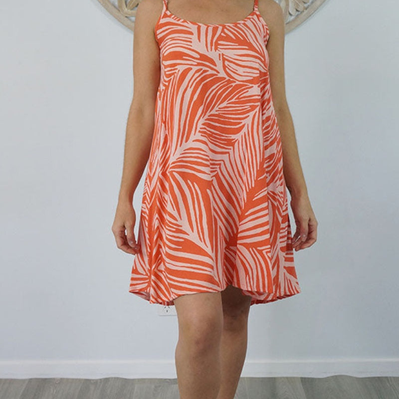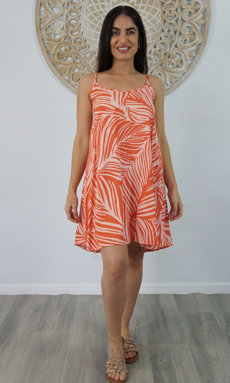 This is a lightweight mini dress that features thin adjustable straps with elastic on the back.