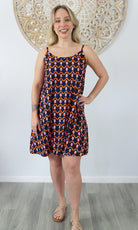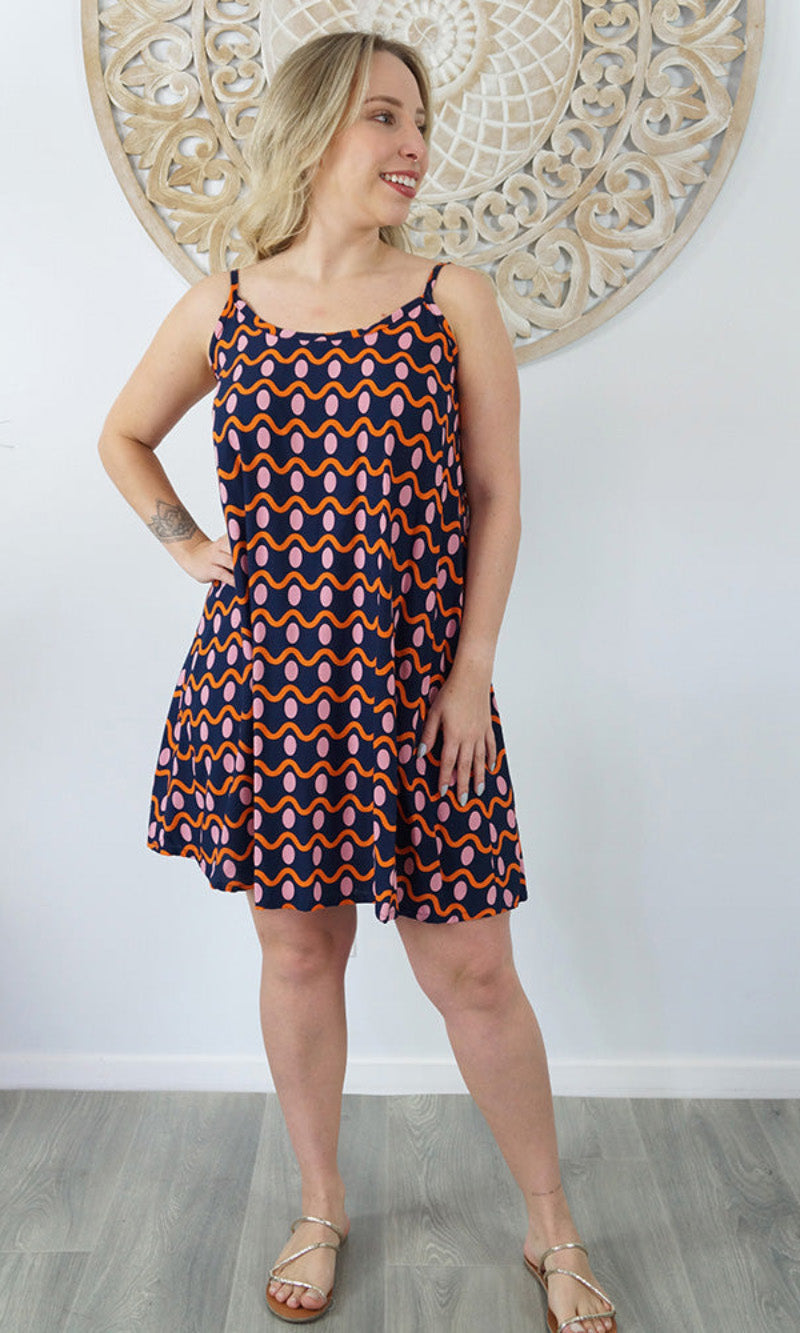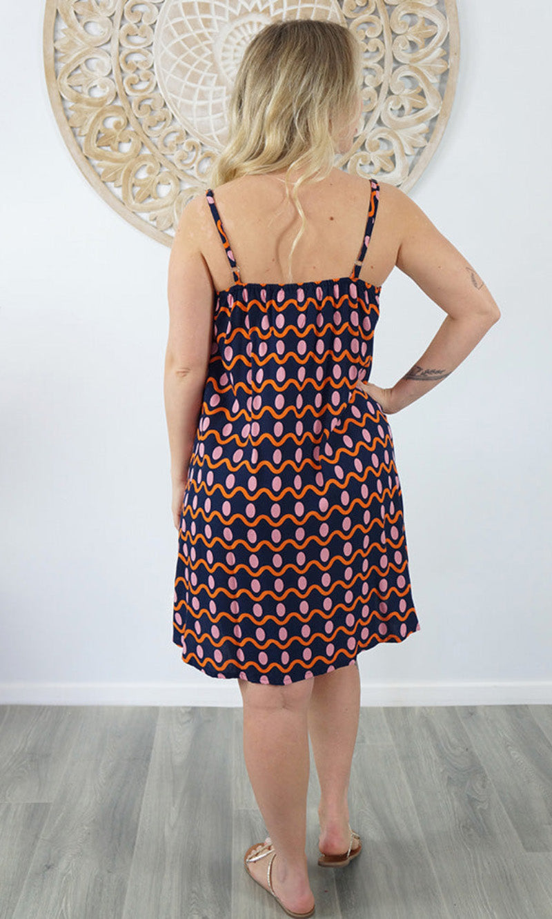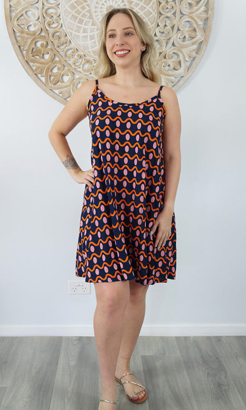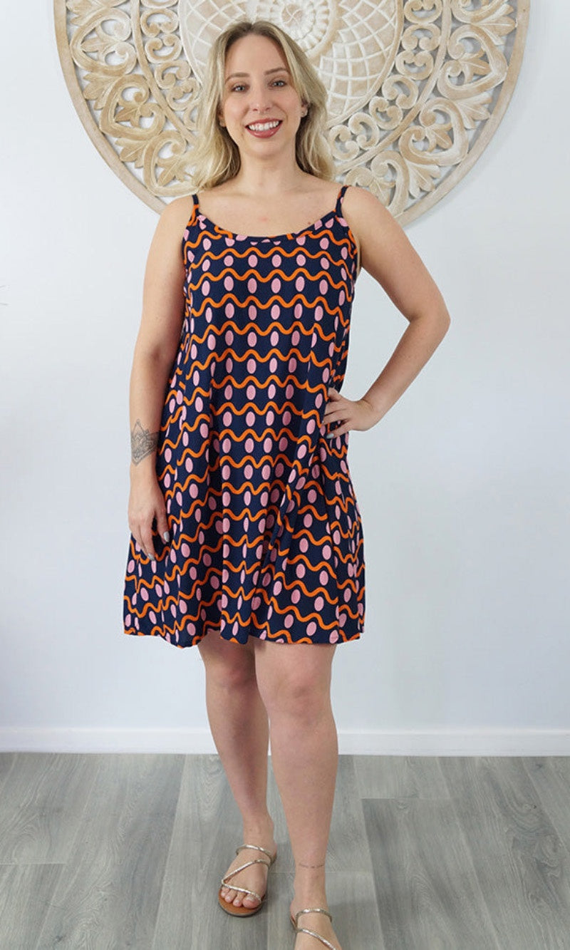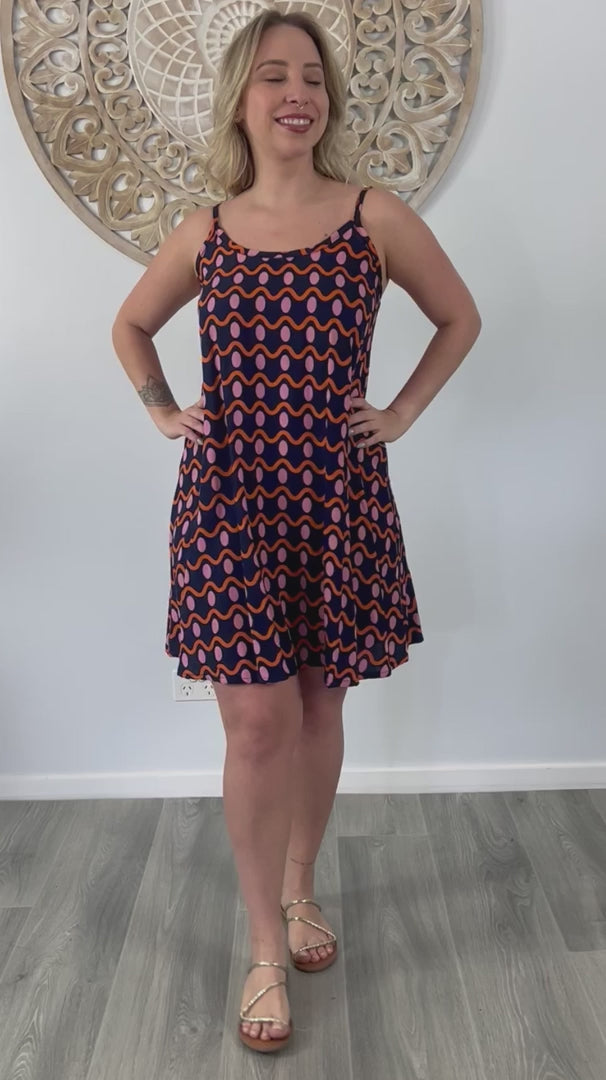 This is a lightweight mini dress that features thin adjustable straps with elastic on the back.