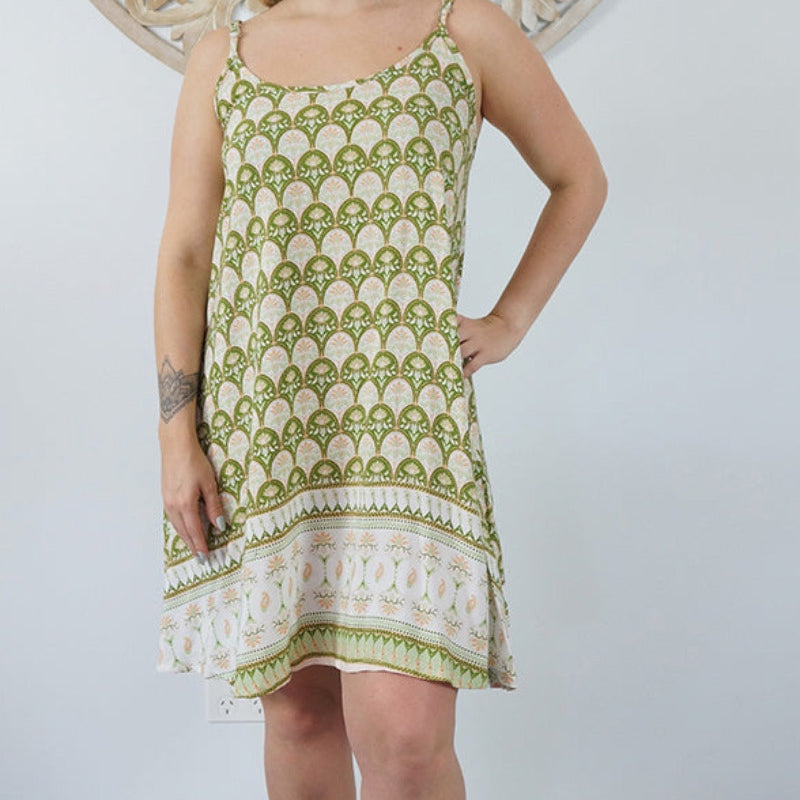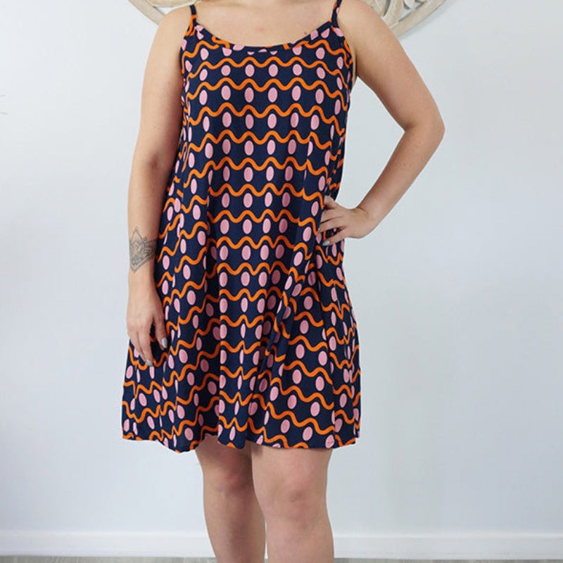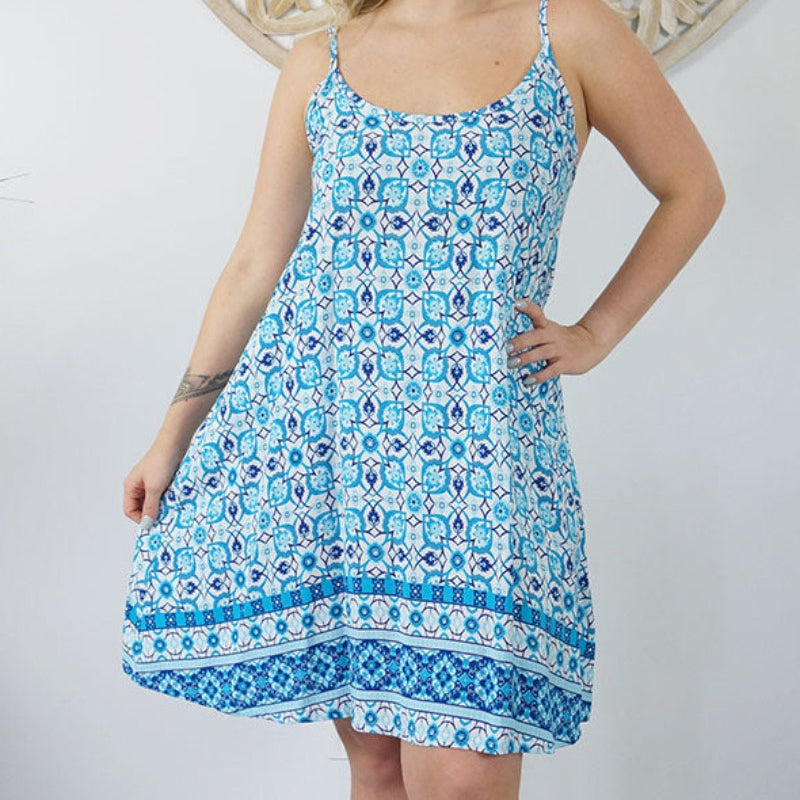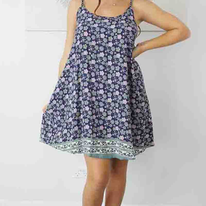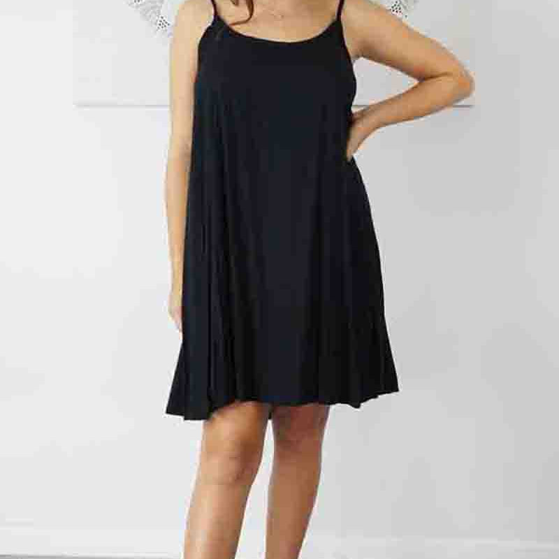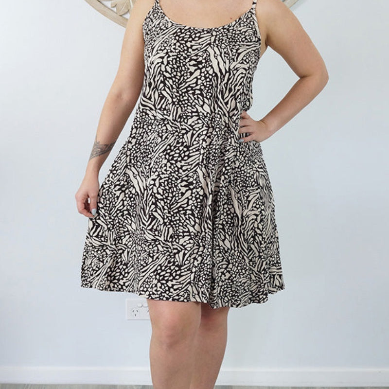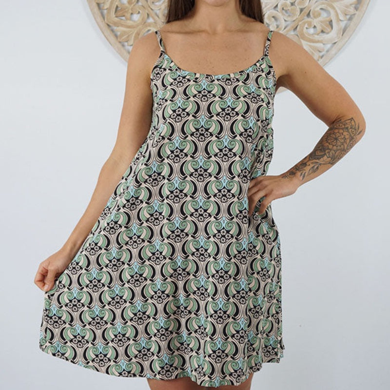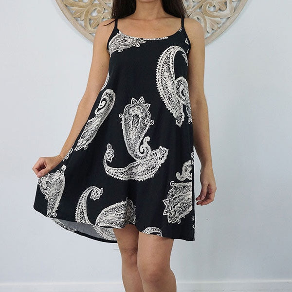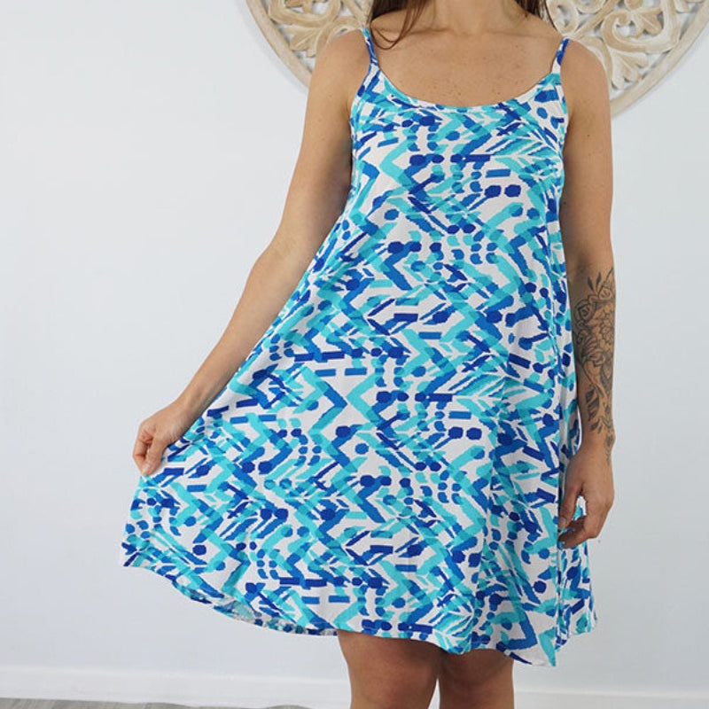 This is a lightweight mini dress that features thin adjustable straps with elastic on the back.