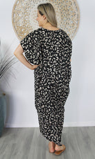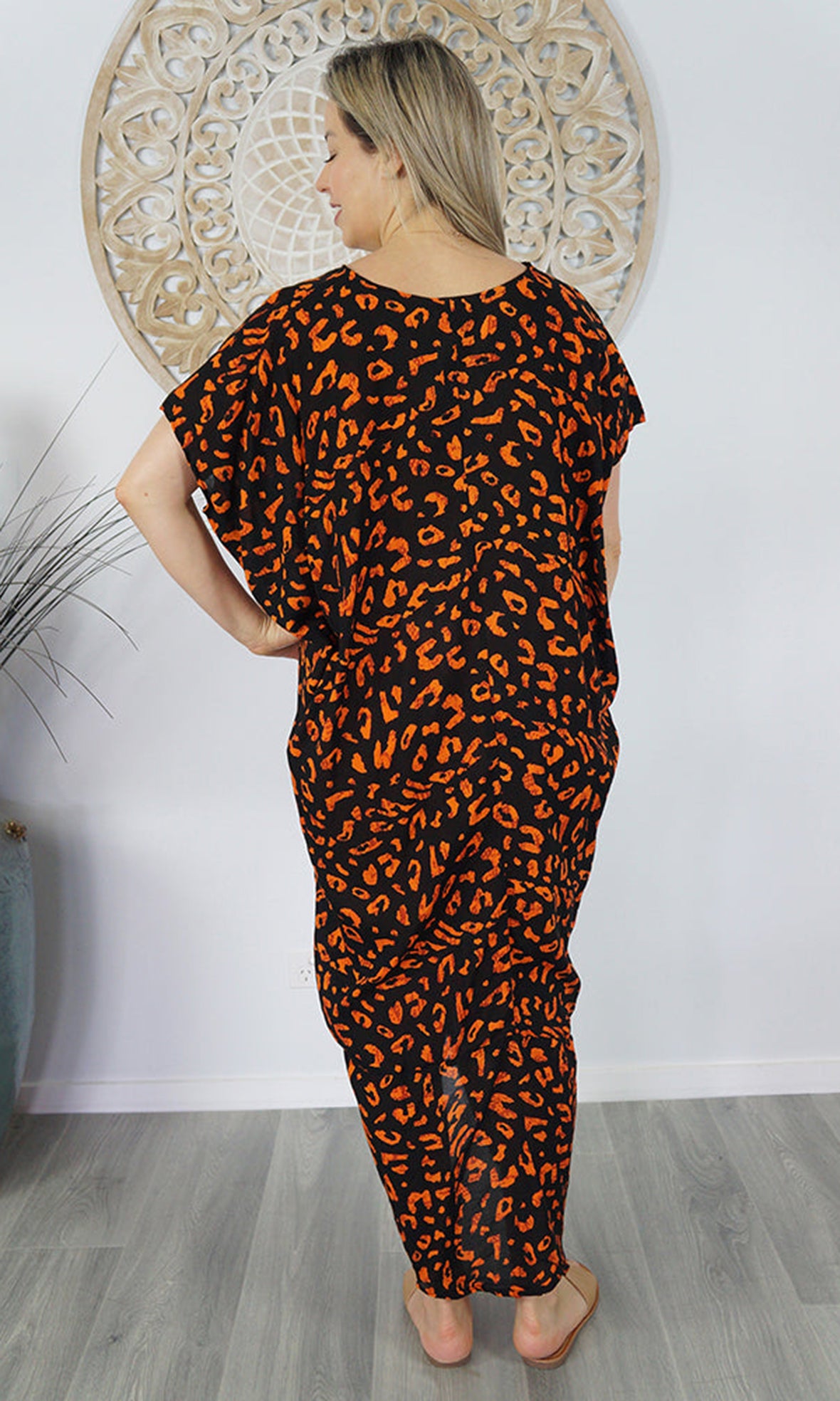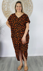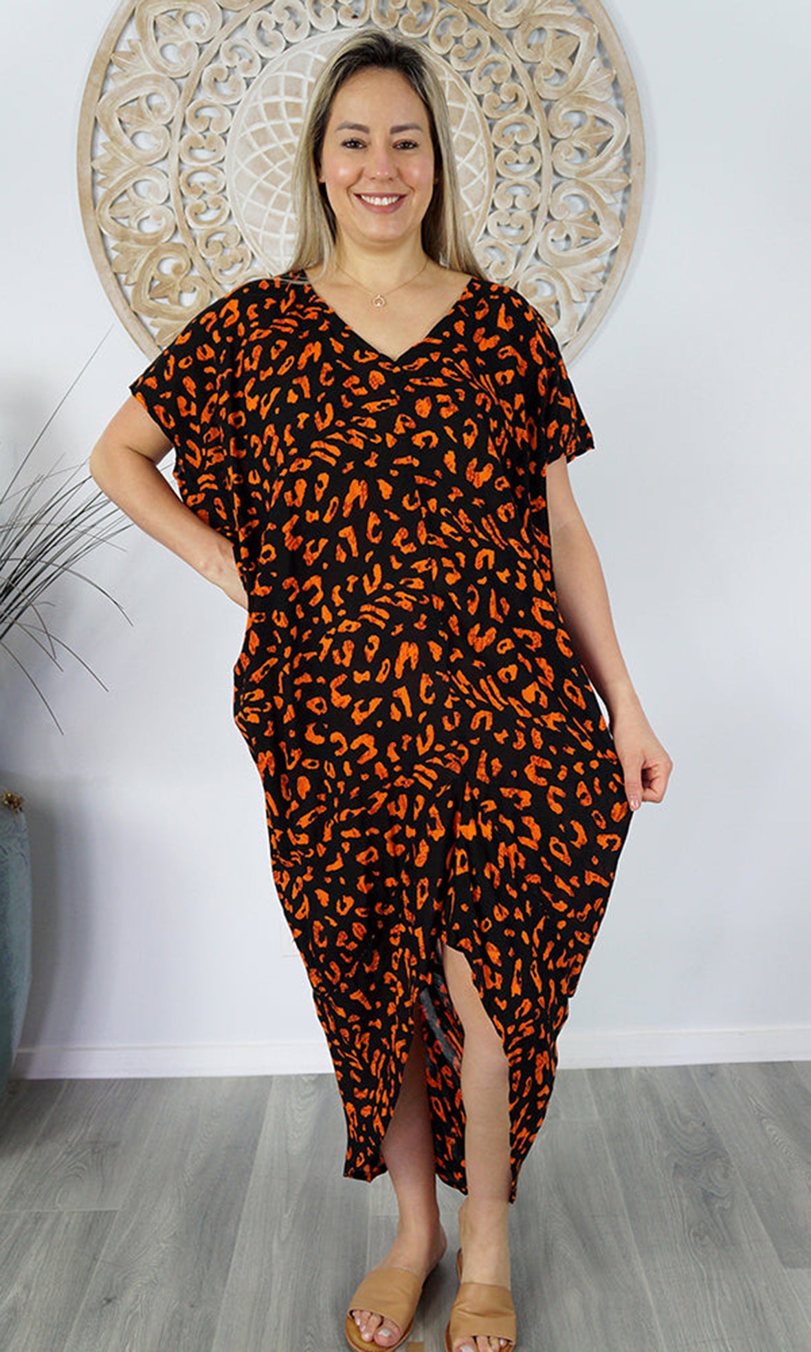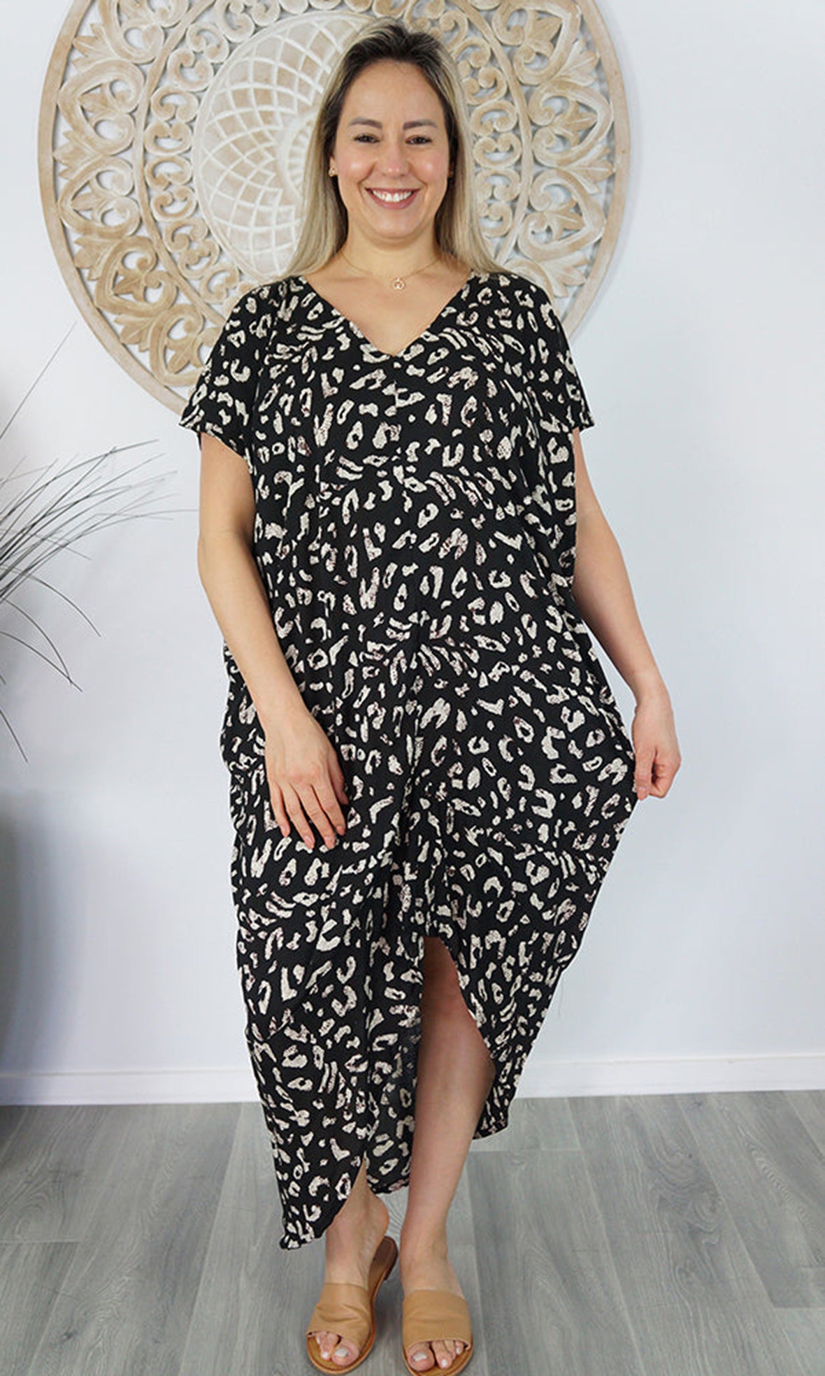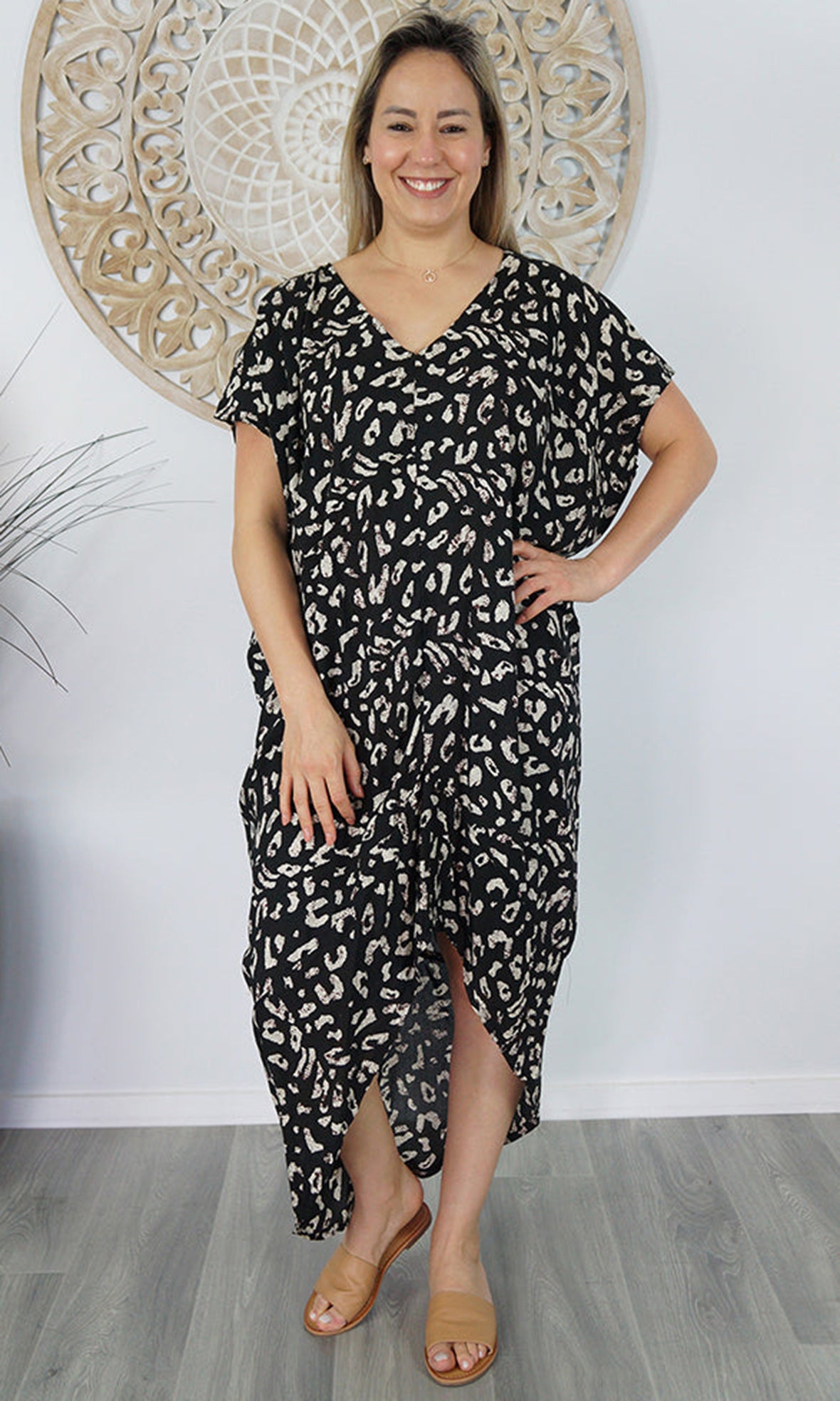 Comfortable day dress with short sleeves. Rising up in the front to a comfortable knee length. Free falling style to suit most body shapes.