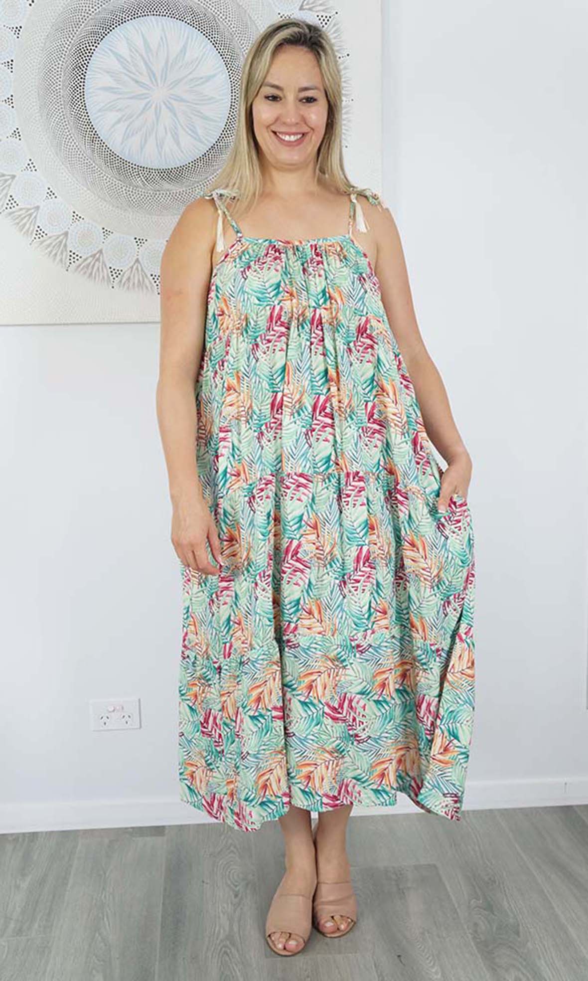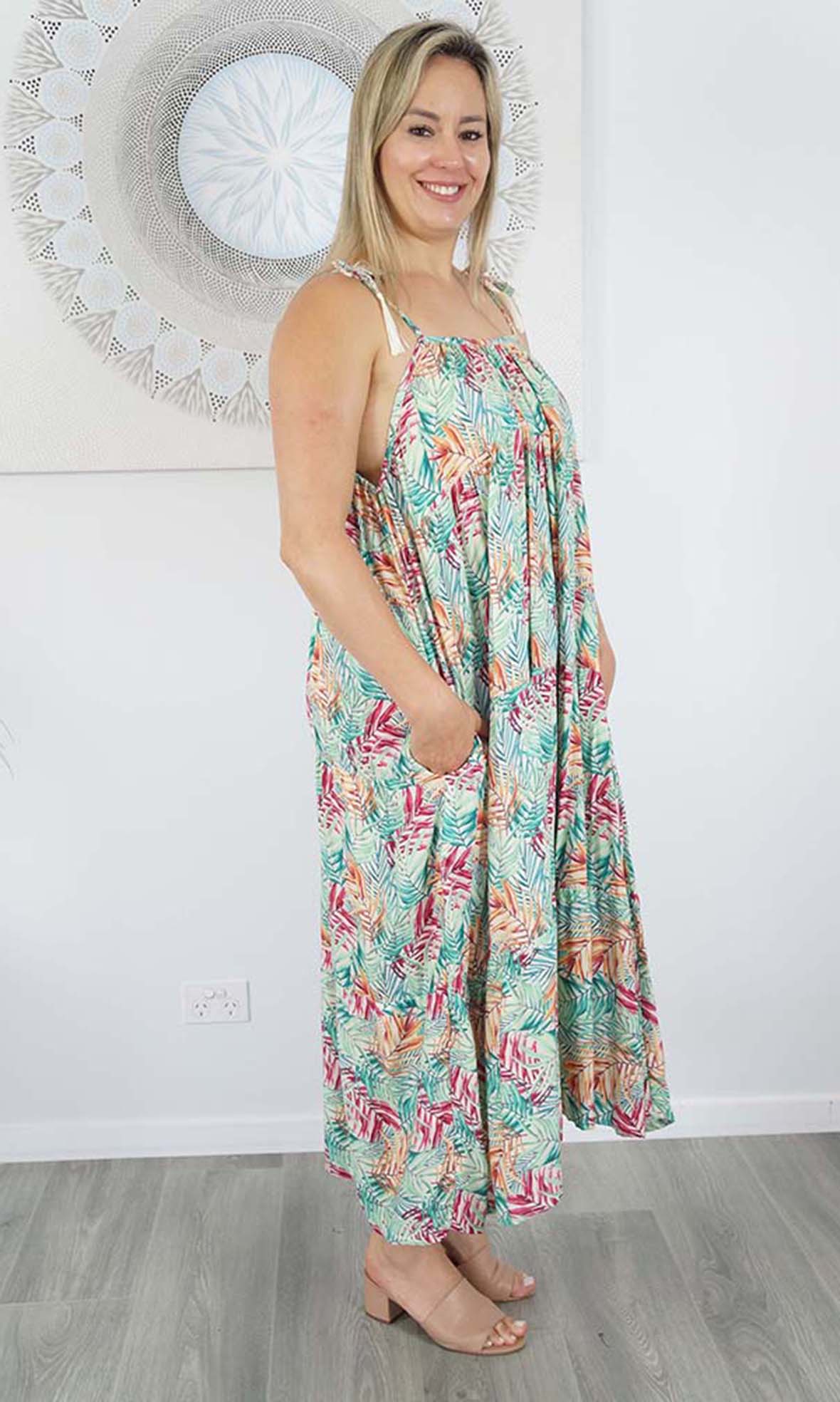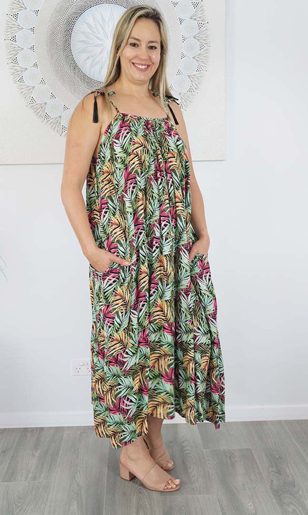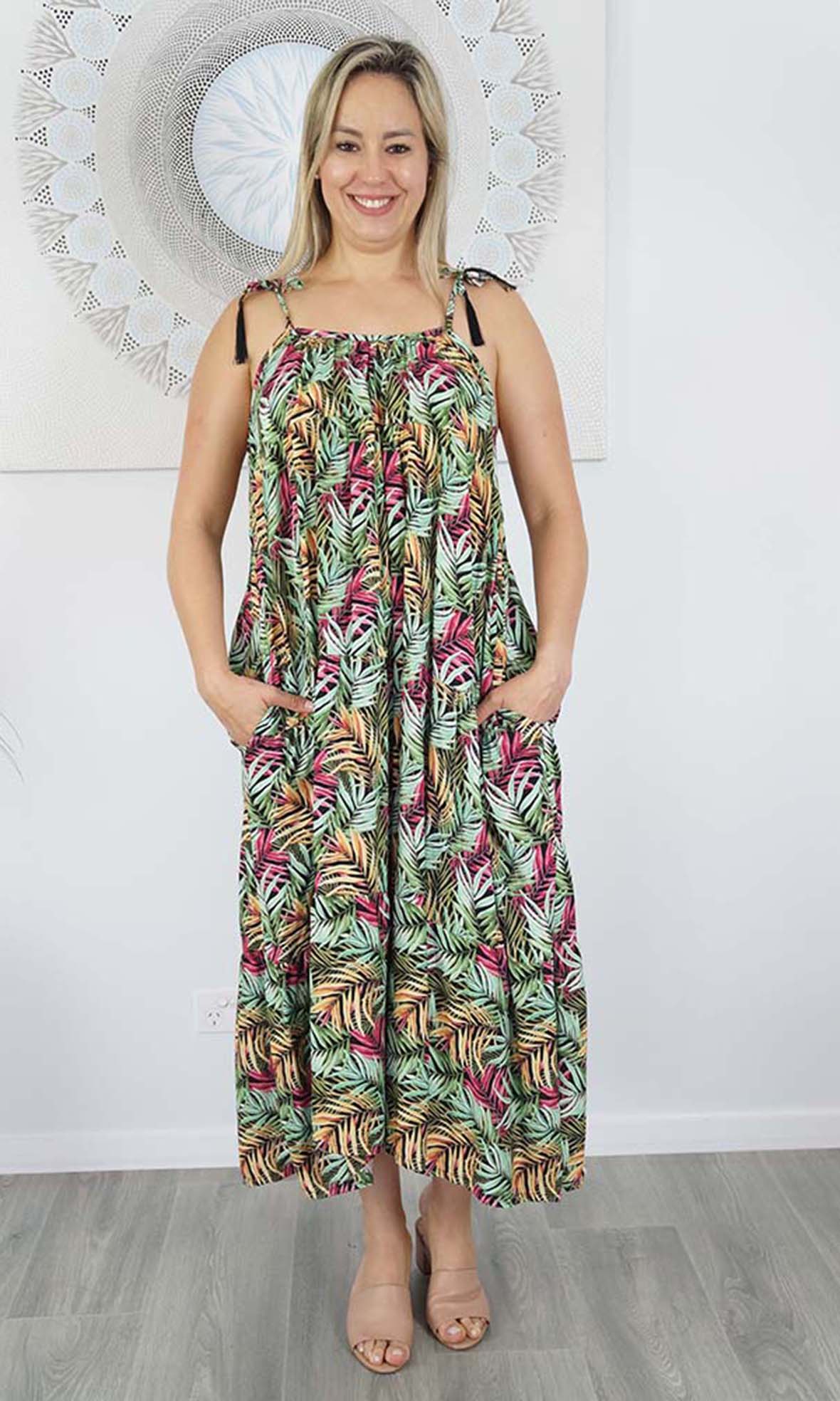Features include 3-panel construction, elastic underarms for a snug fit for all sizes up to size 18, and side pockets. Tassles on the straps complete this beautifully made dress.