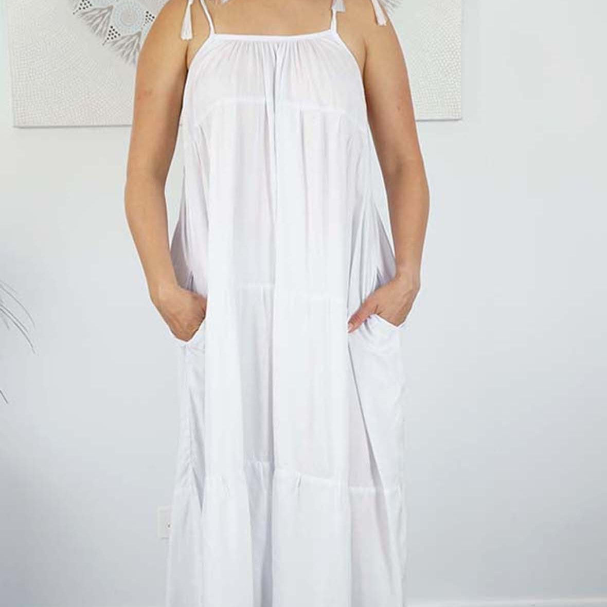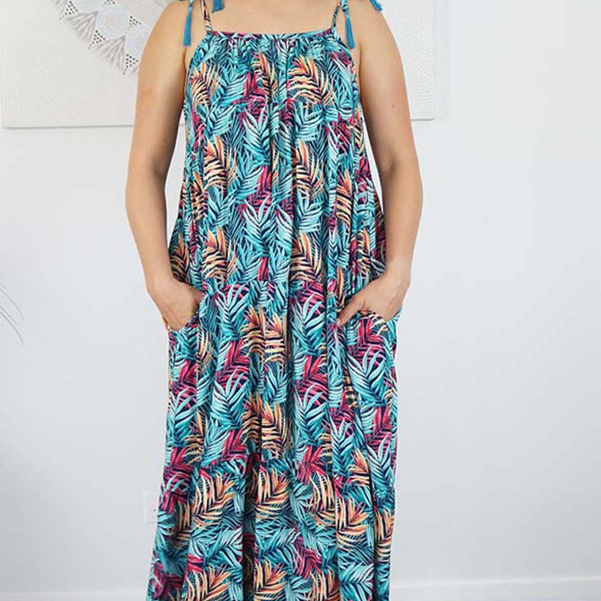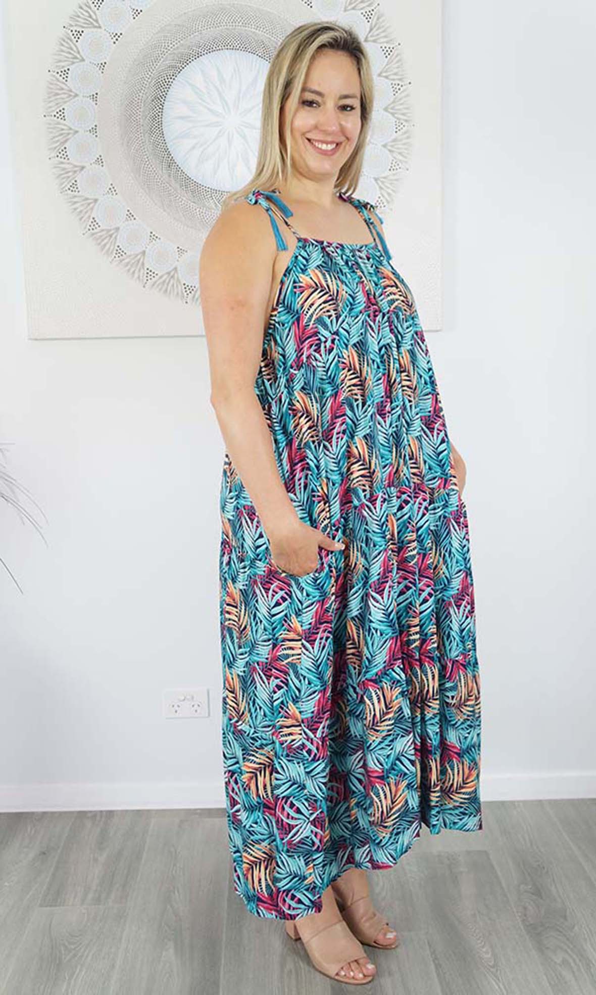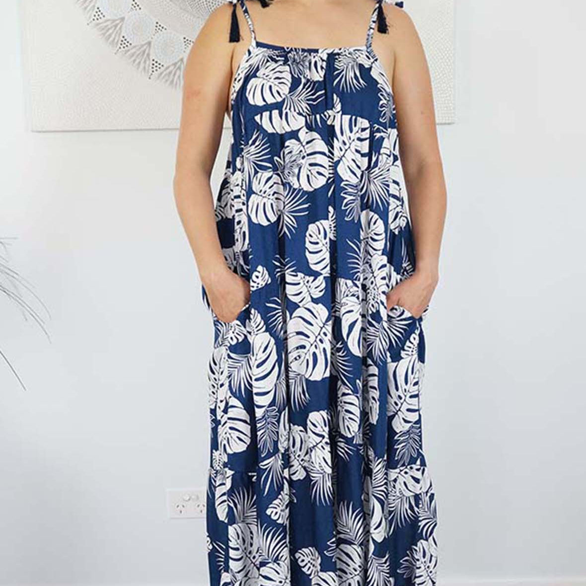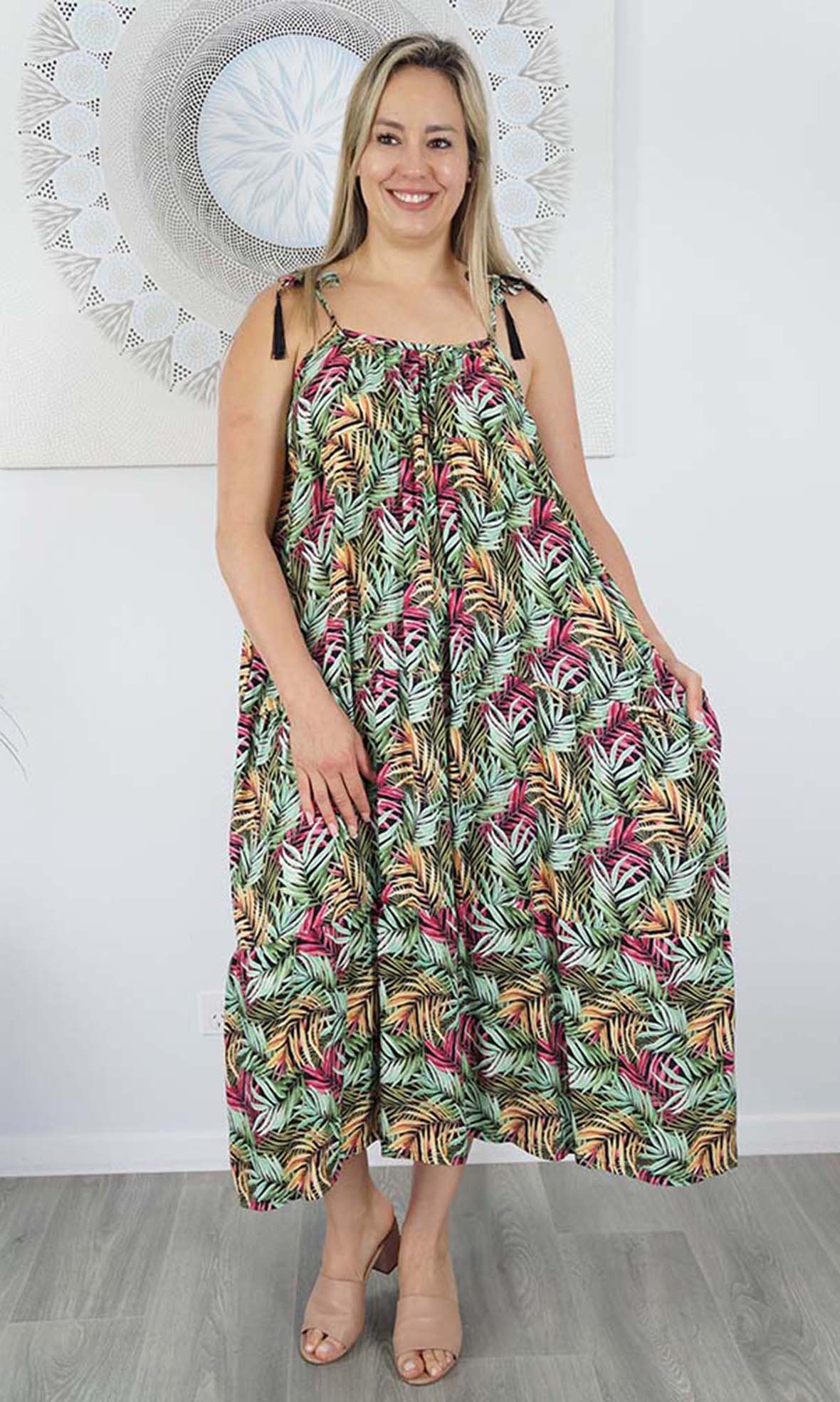 Features include 3-panel construction, elastic underarms for a snug fit for all sizes up to size 18, and side pockets. Tassles on the straps complete this beautifully made dress.