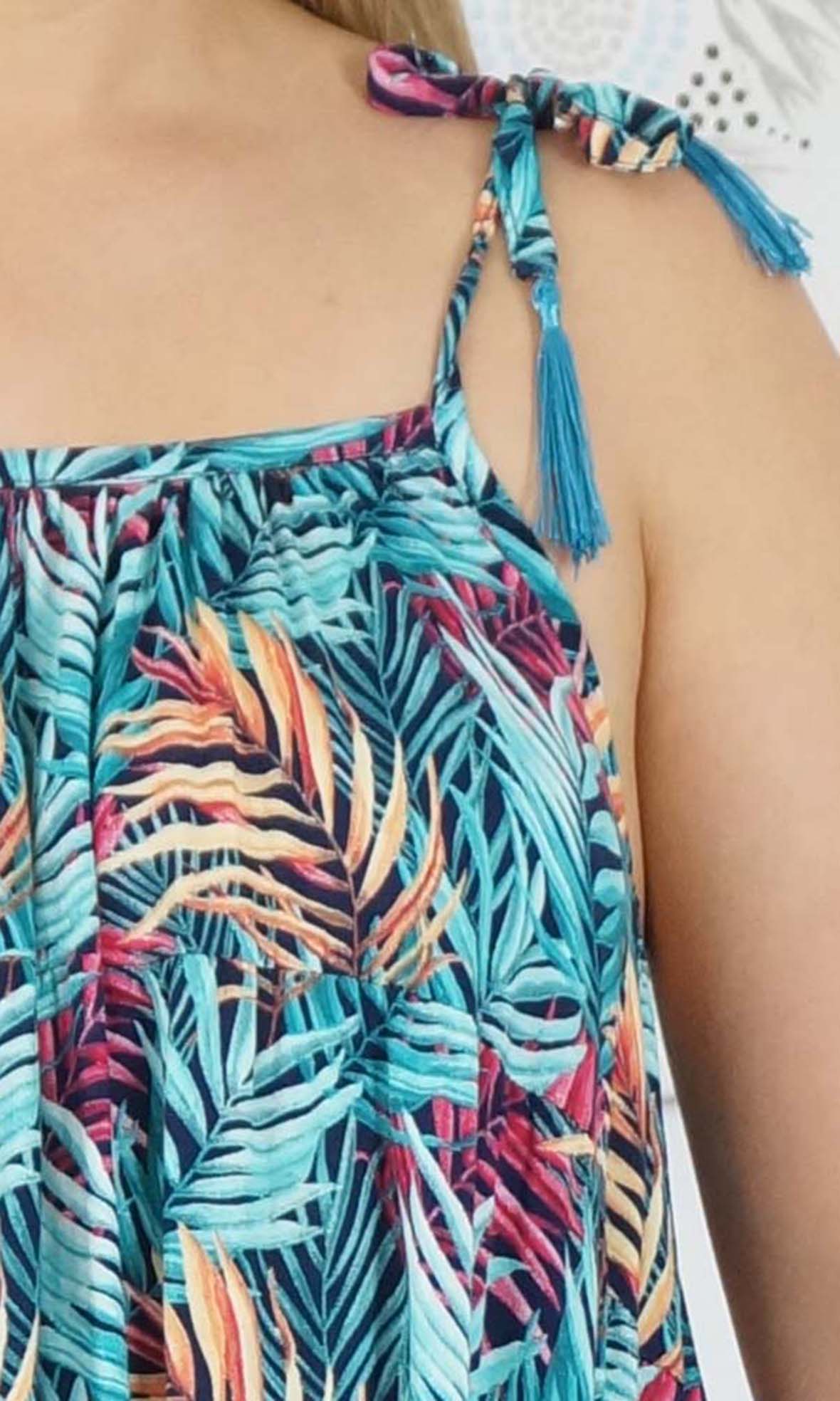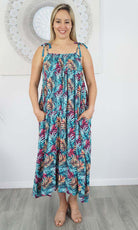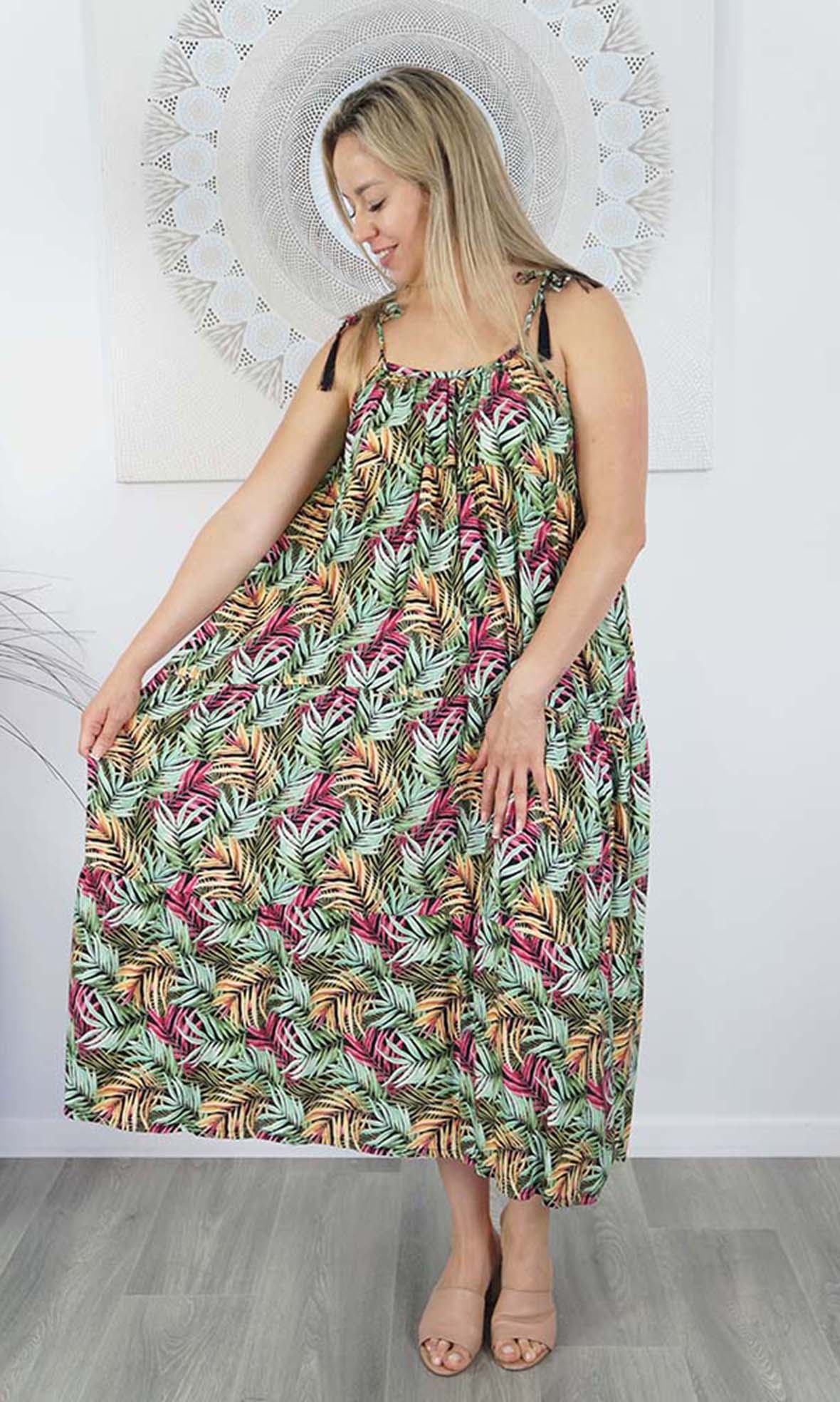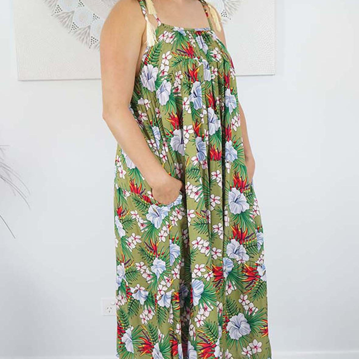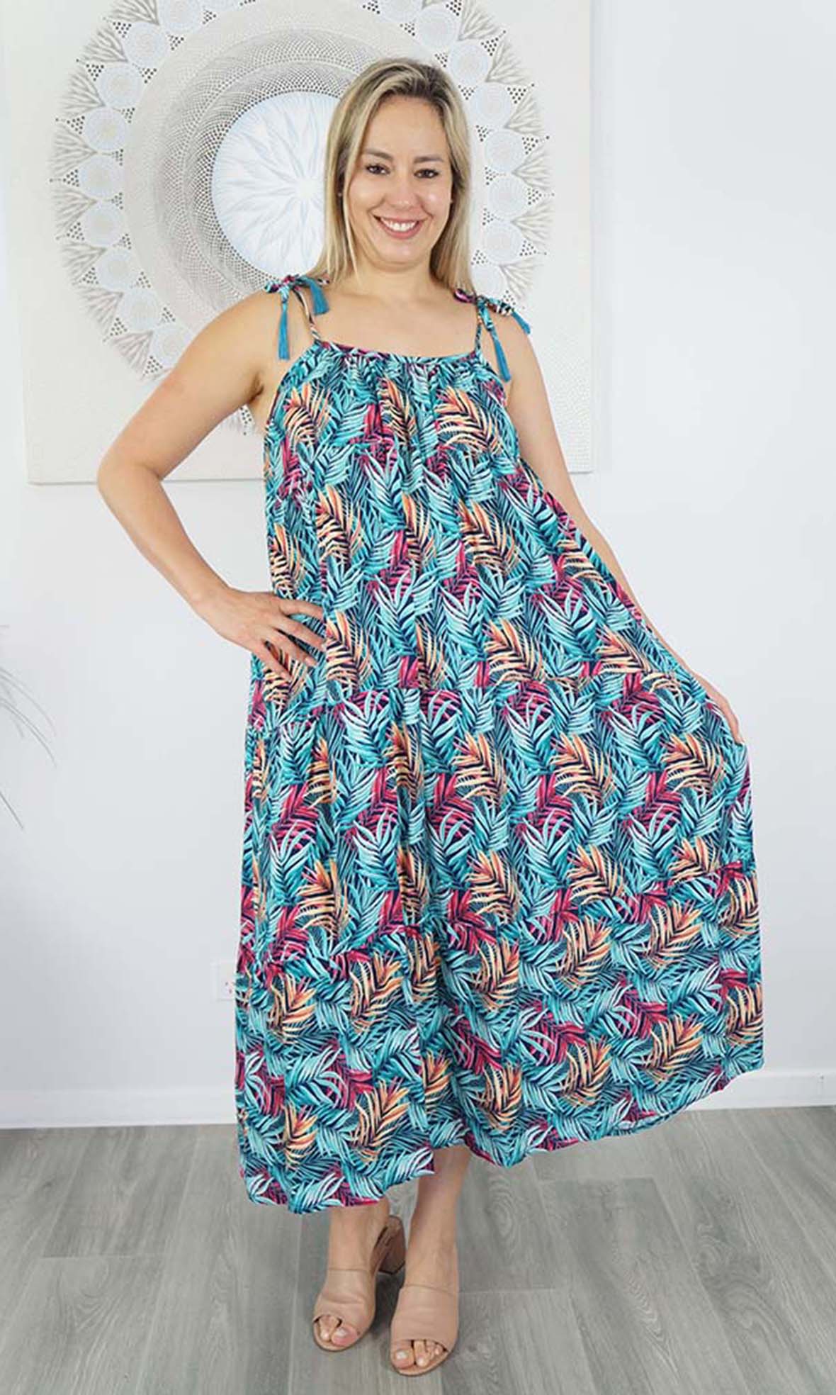 Features include 3-panel construction, elastic underarms for a snug fit for all sizes up to size 18, and side pockets. Tassles on the straps complete this beautifully made dress.