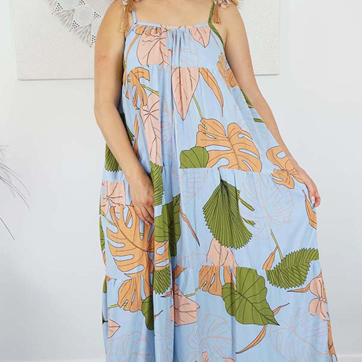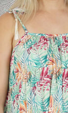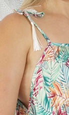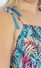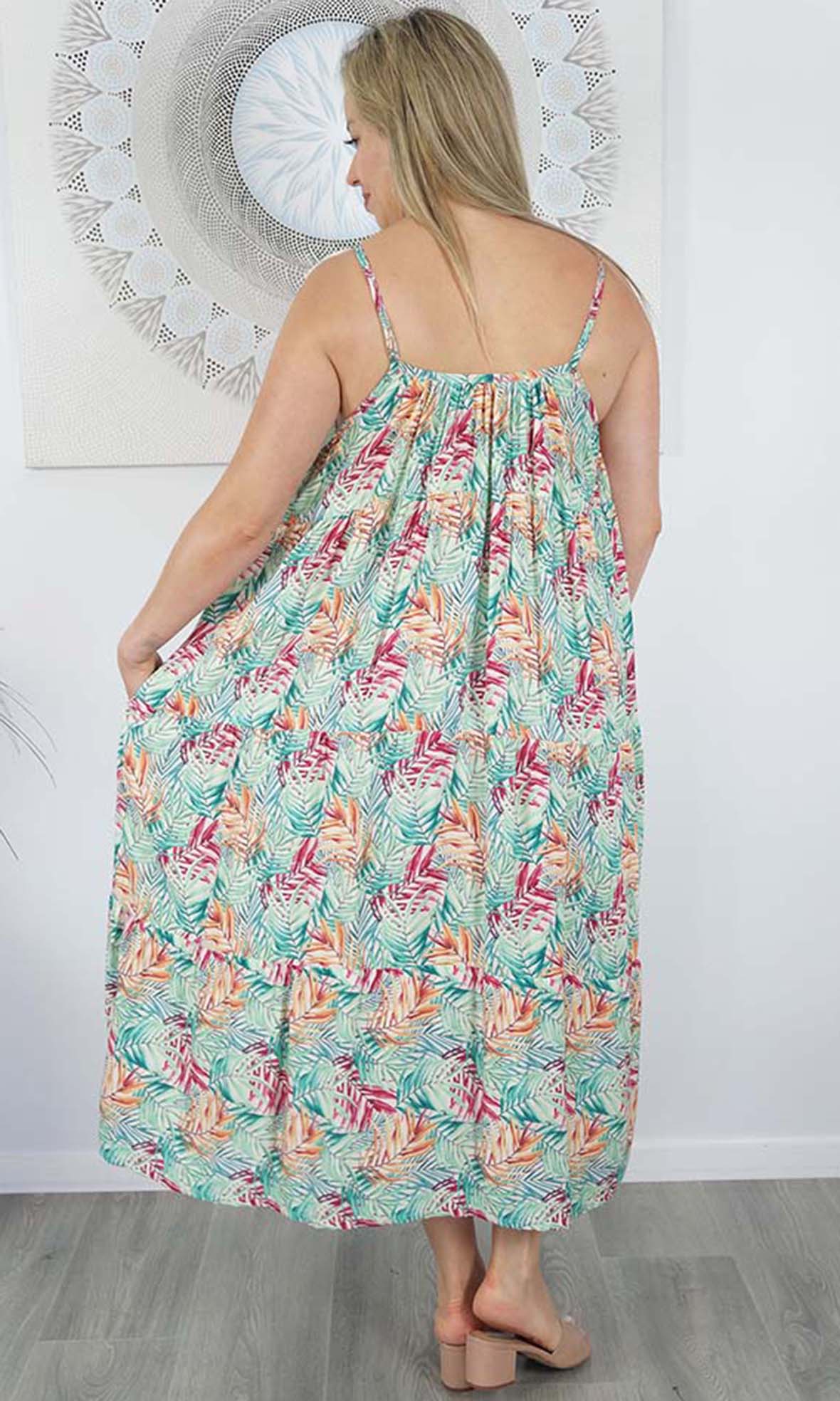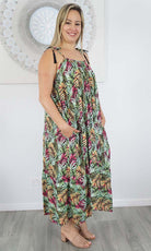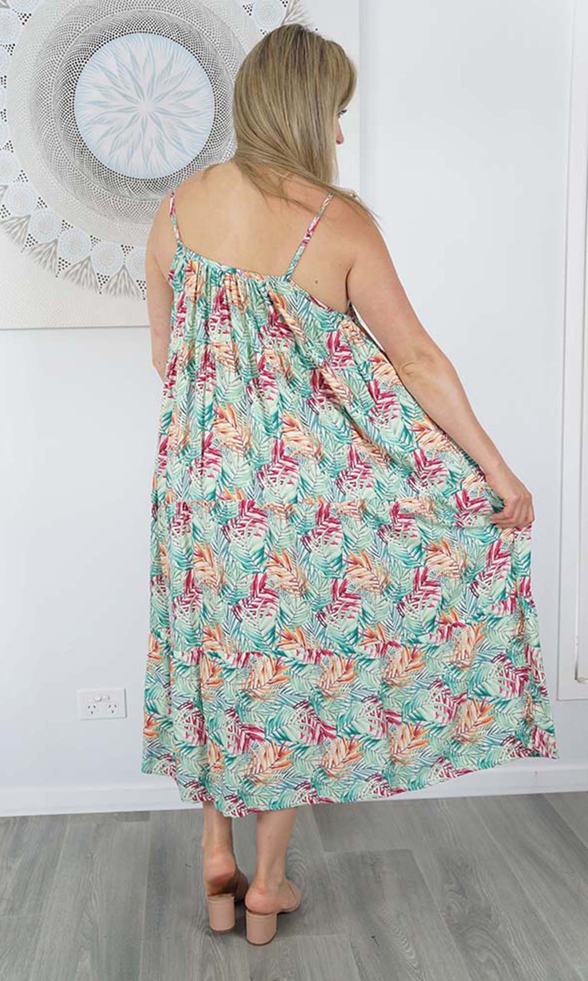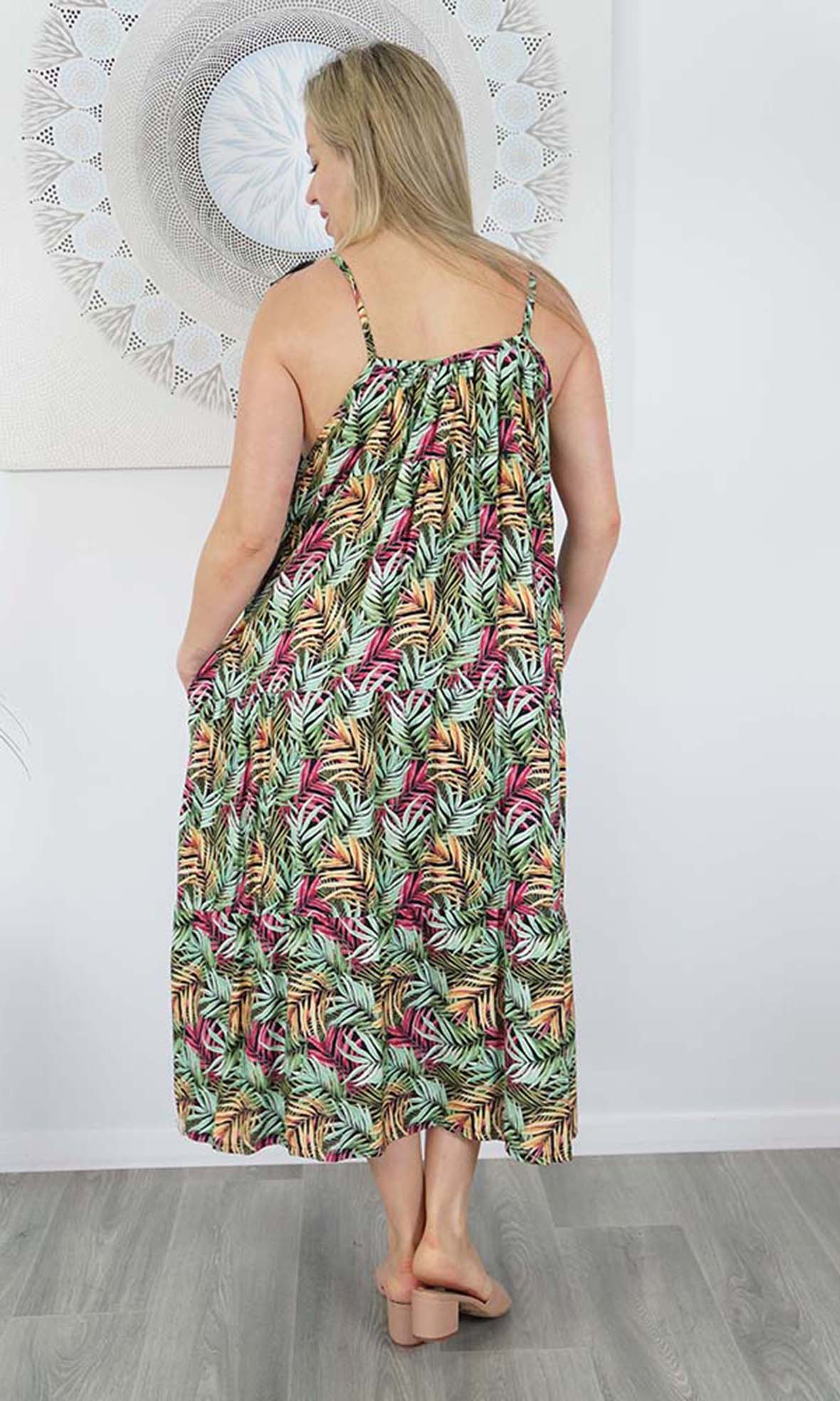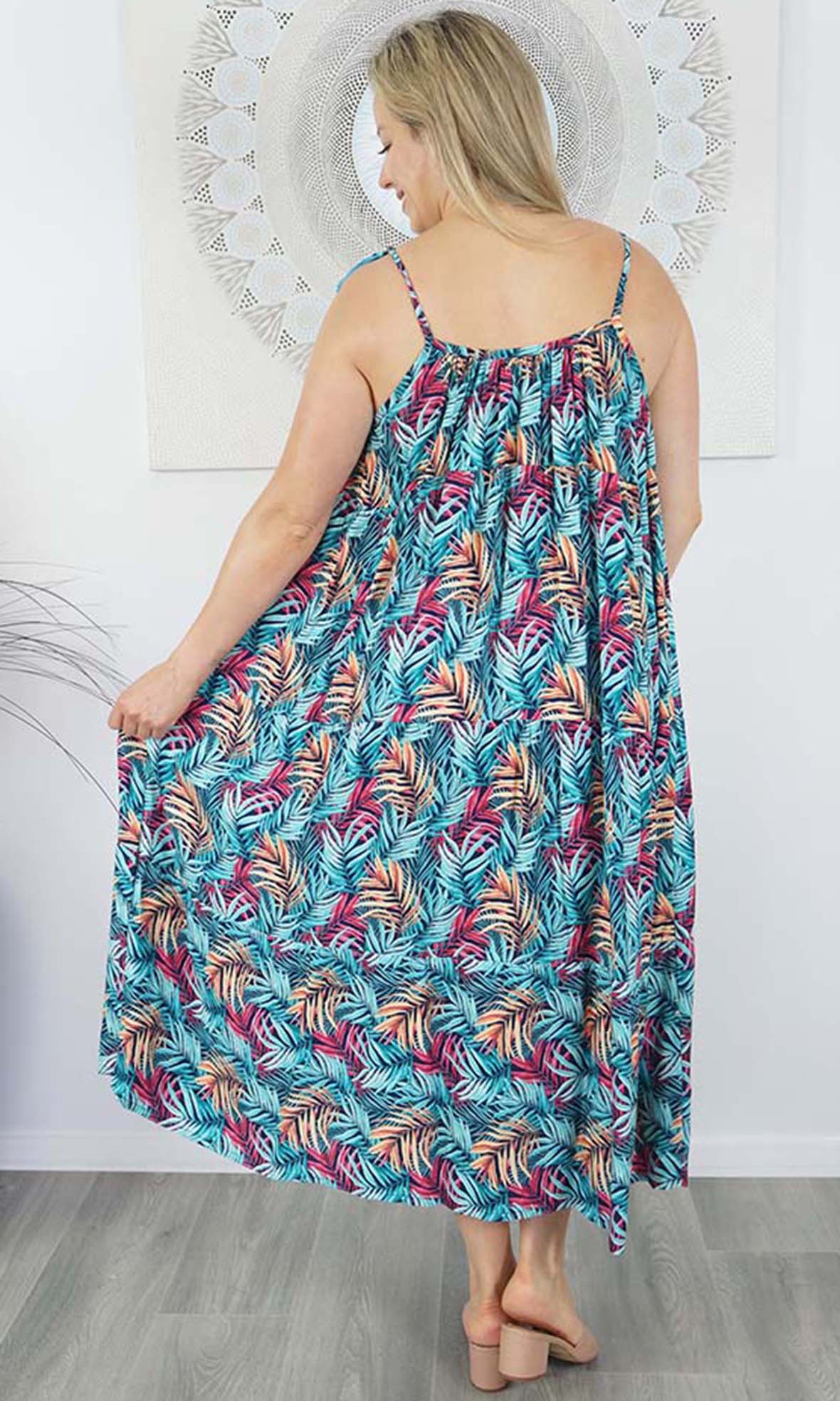 Features include 3-panel construction, elastic underarms for a snug fit for all sizes up to size 18, and side pockets. Tassles on the straps complete this beautifully made dress.