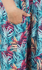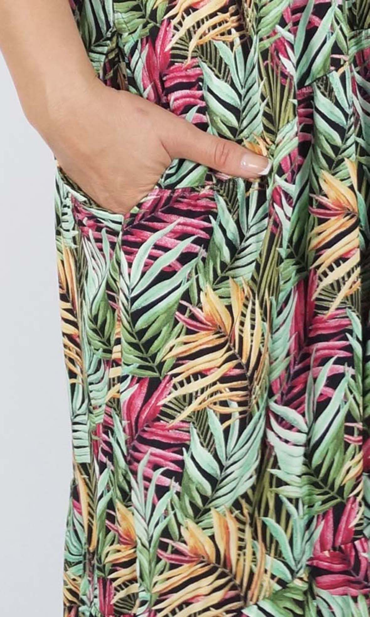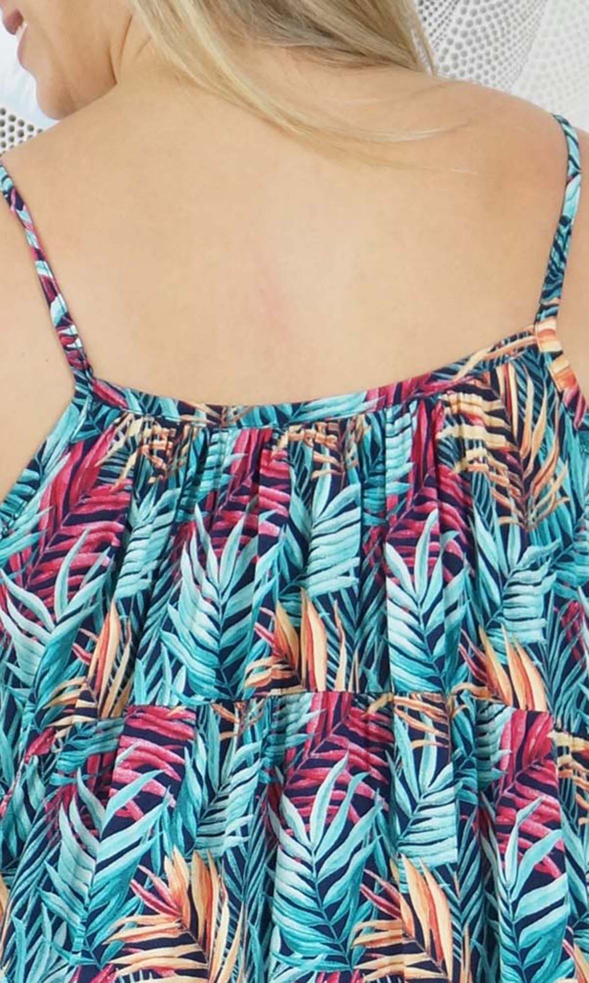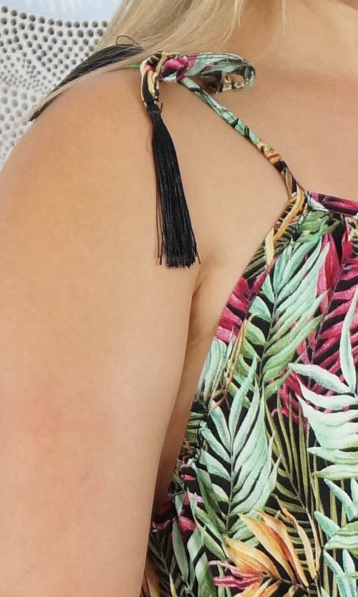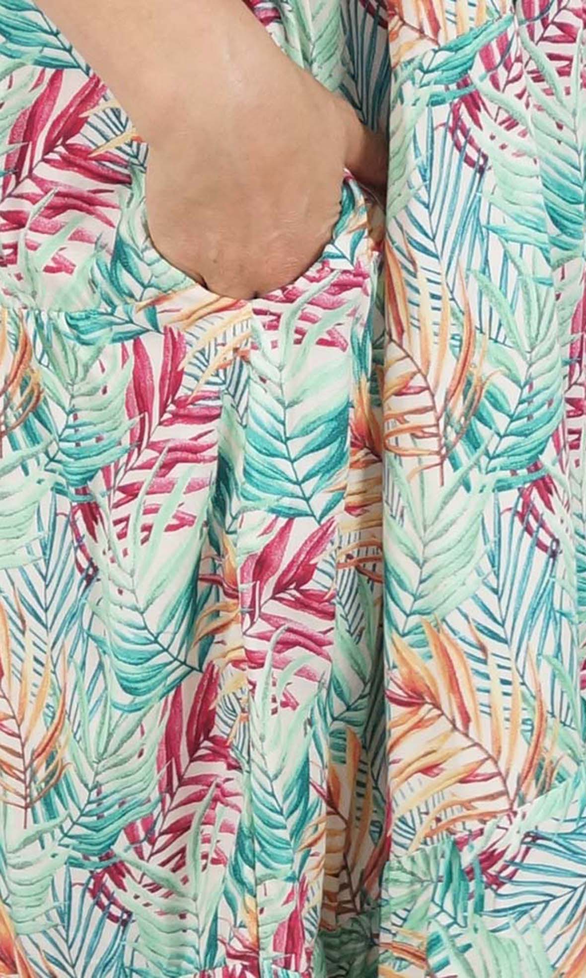 Features include 3-panel construction, elastic underarms for a snug fit for all sizes up to size 18, and side pockets. Tassles on the straps complete this beautifully made dress.