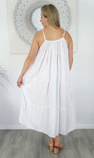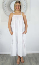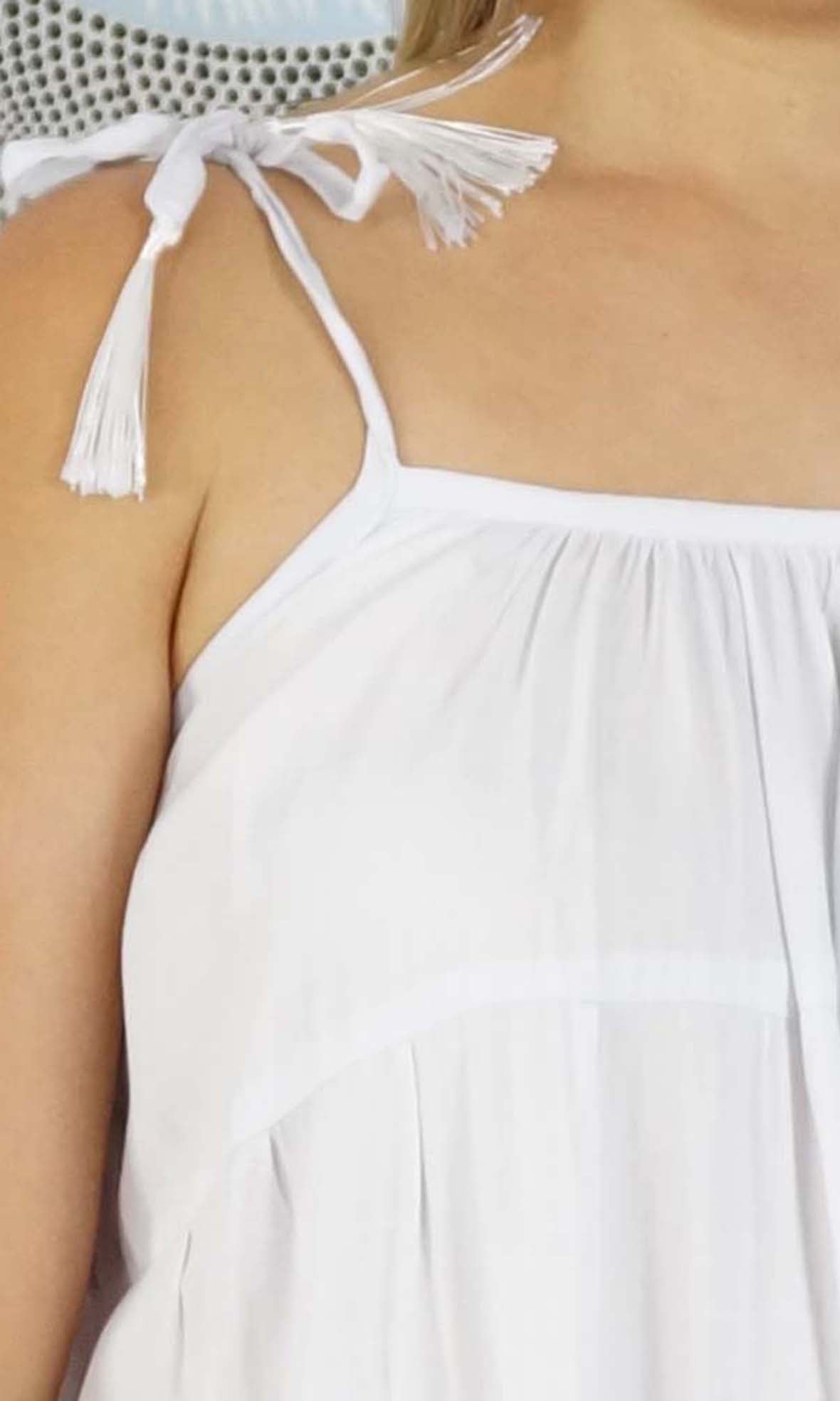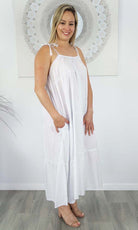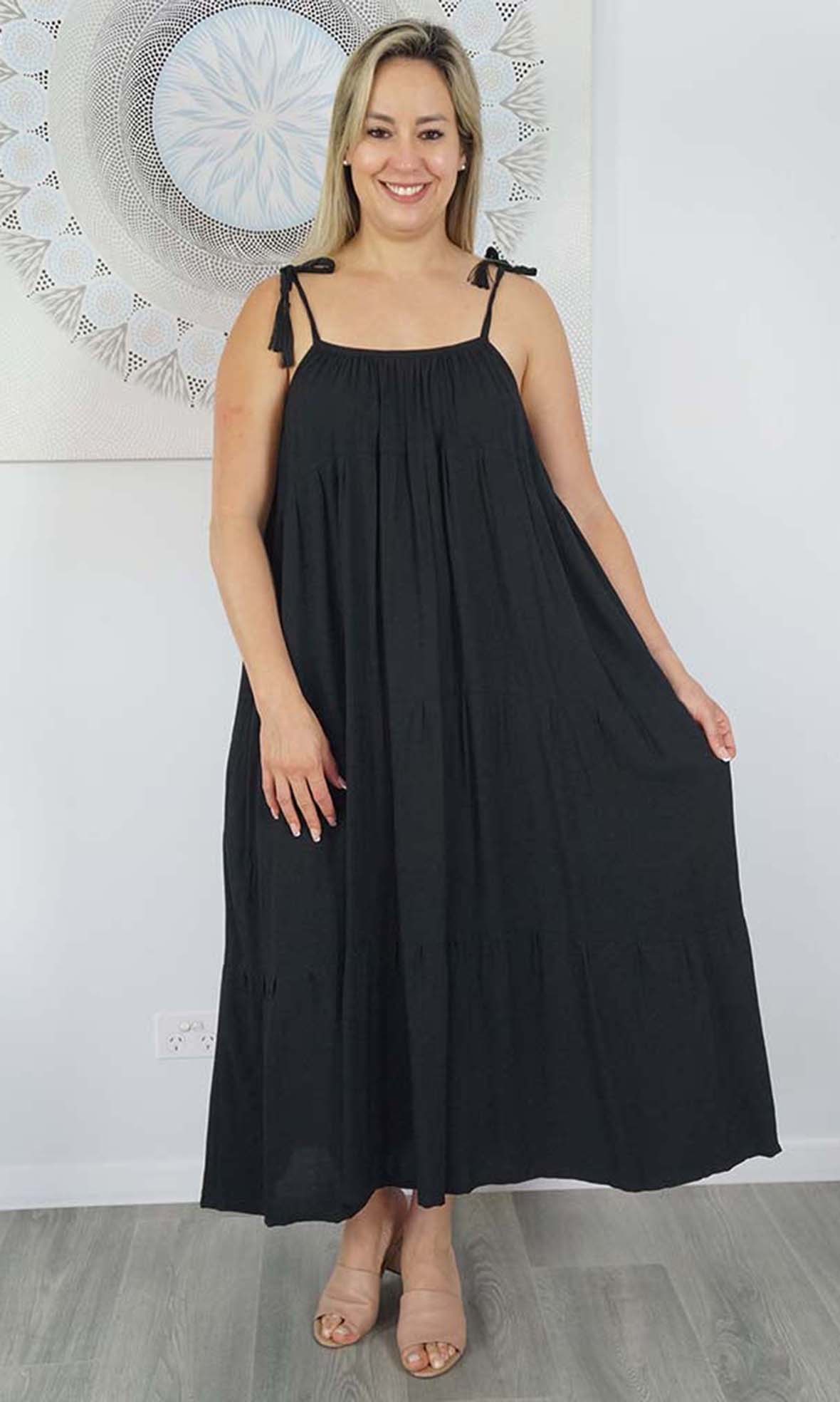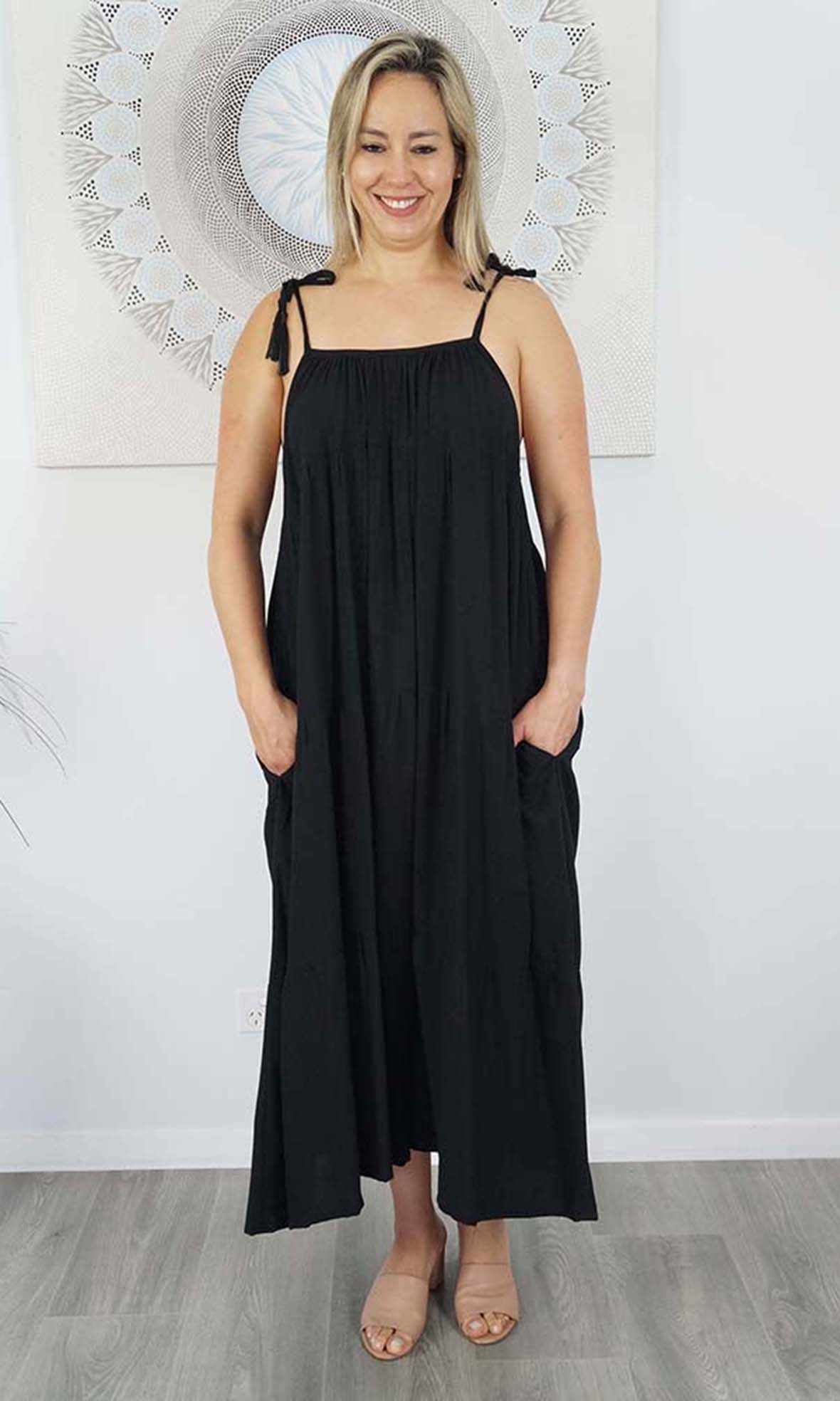 Features include 3-panel construction, elastic underarms for a snug fit for all sizes up to size 18, and side pockets. Tassles on the straps complete this beautifully made dress.