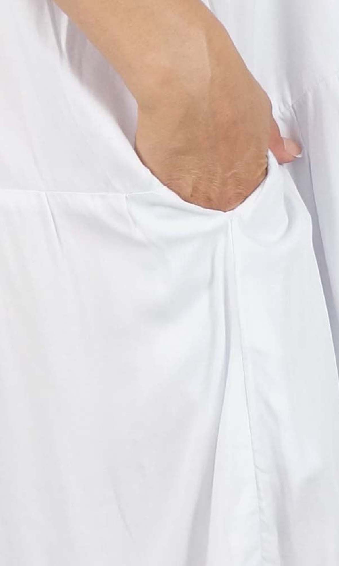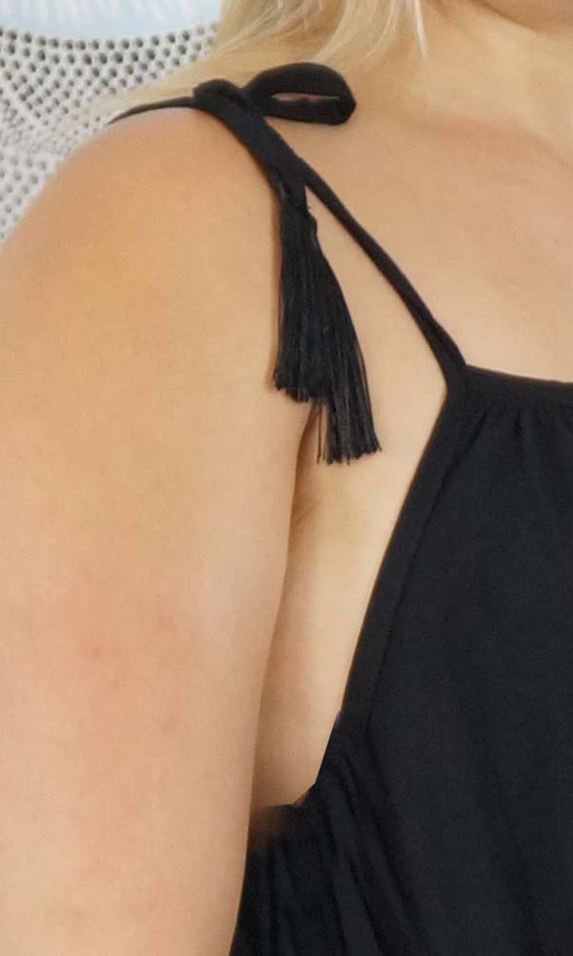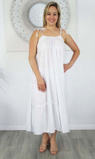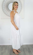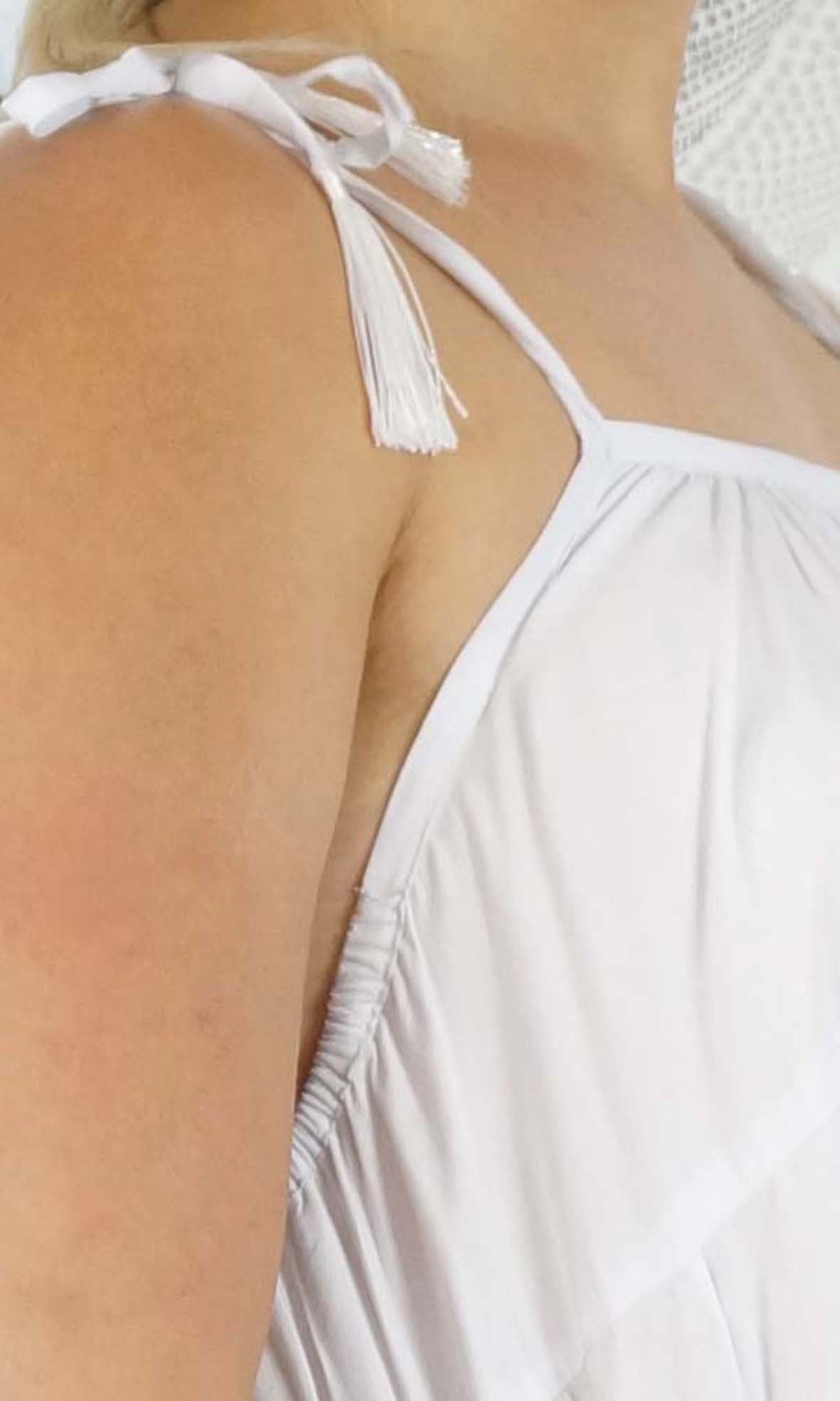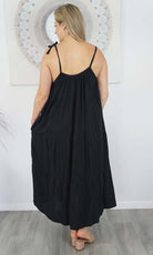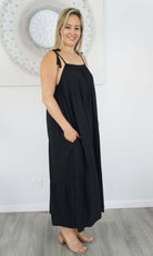 Features include 3-panel construction, elastic underarms for a snug fit for all sizes up to size 18, and side pockets. Tassles on the straps complete this beautifully made dress.