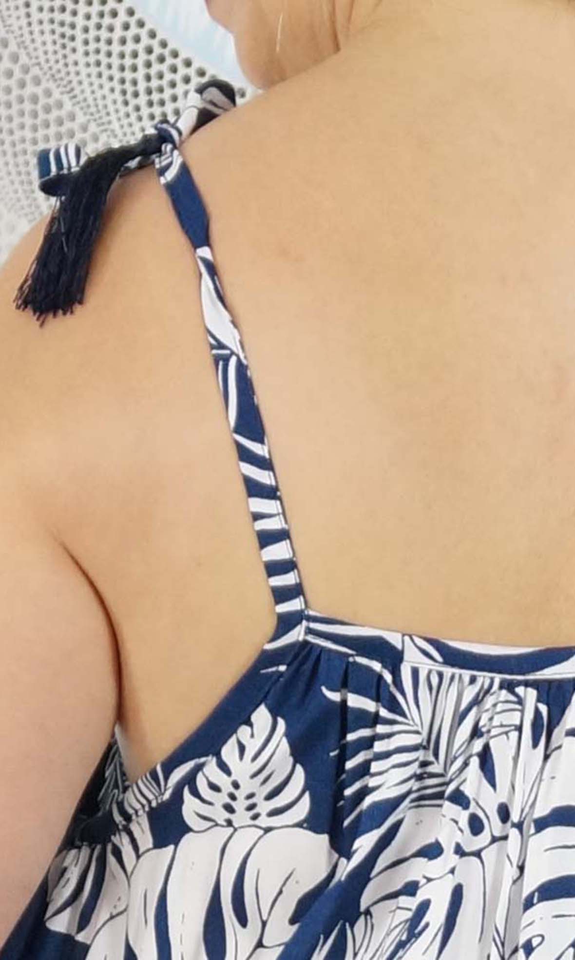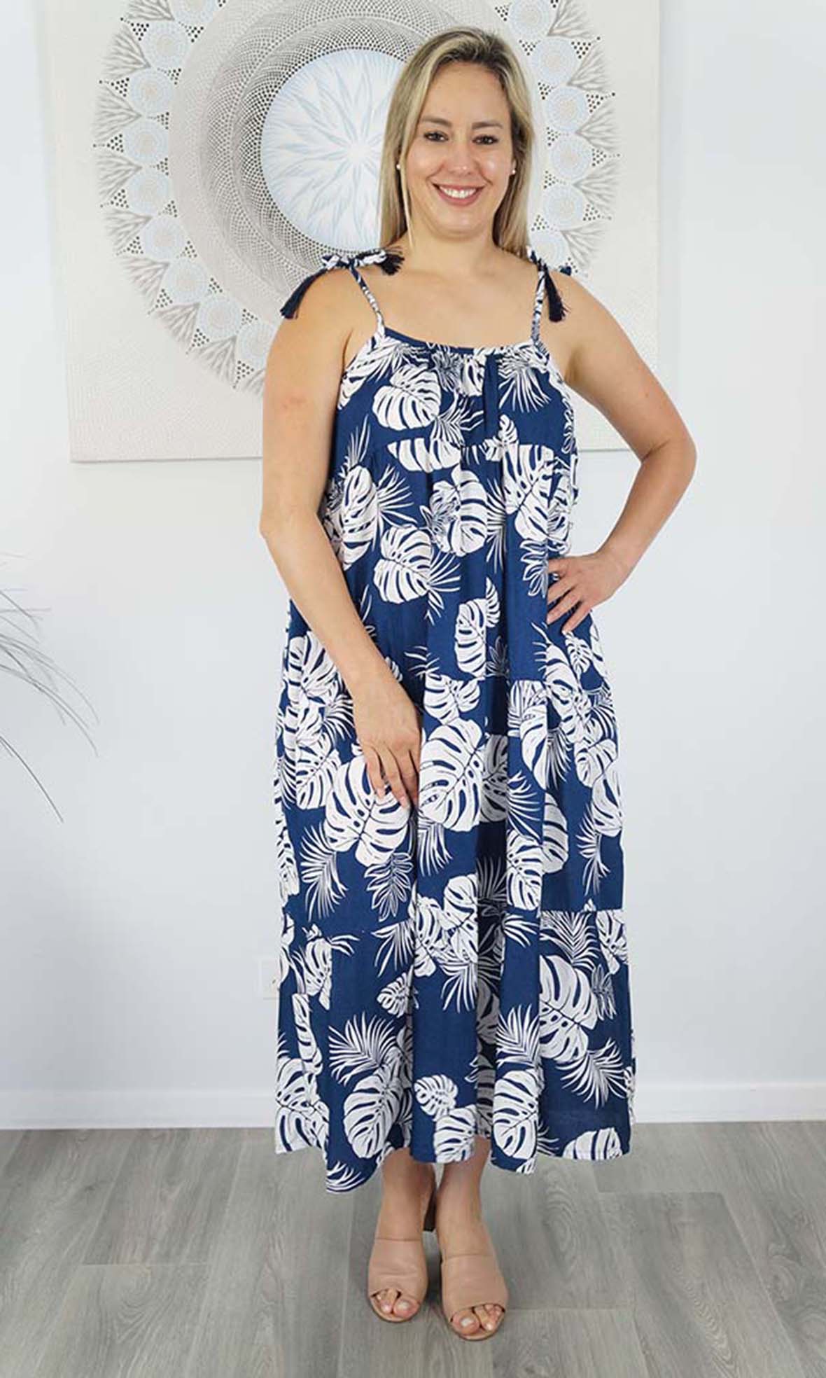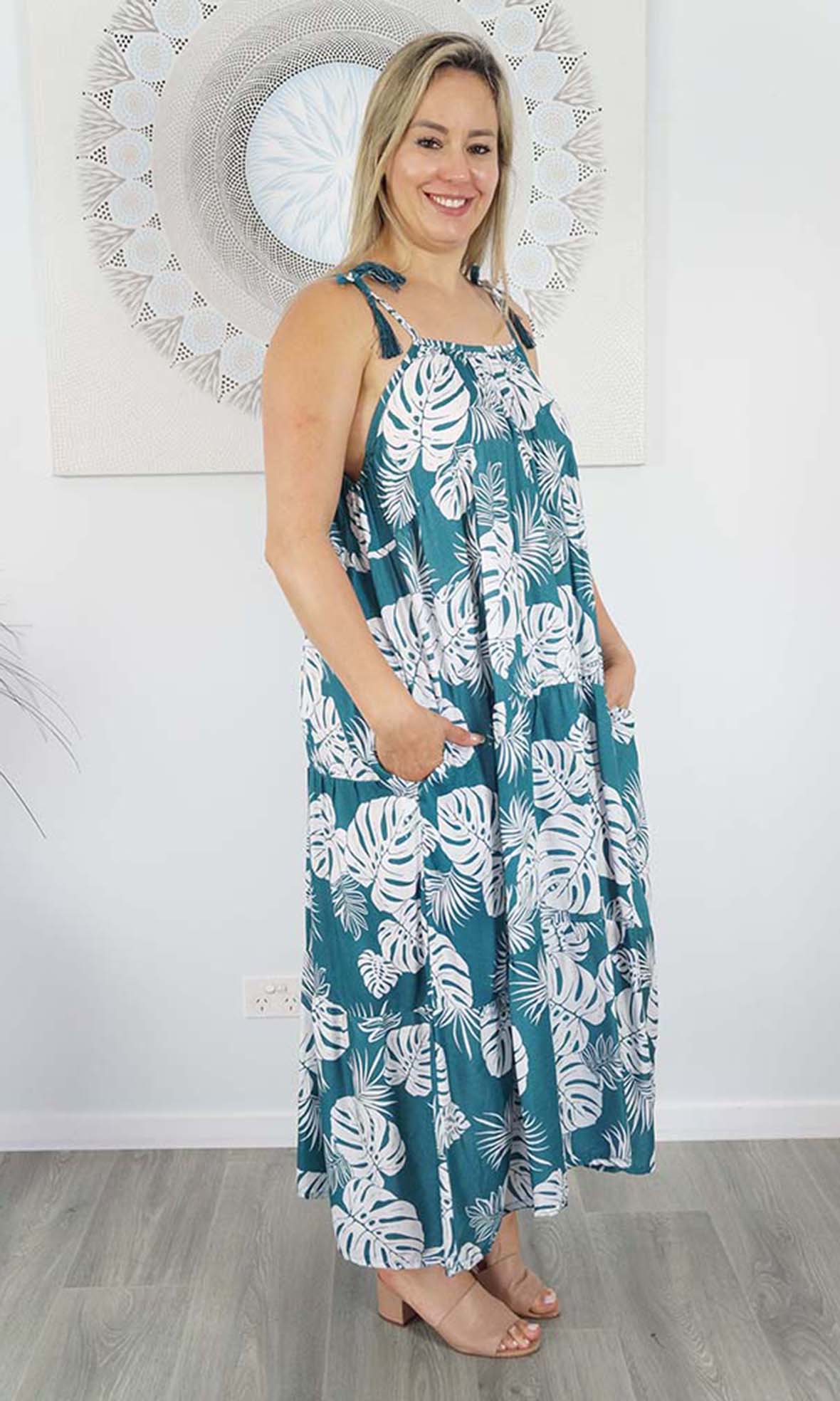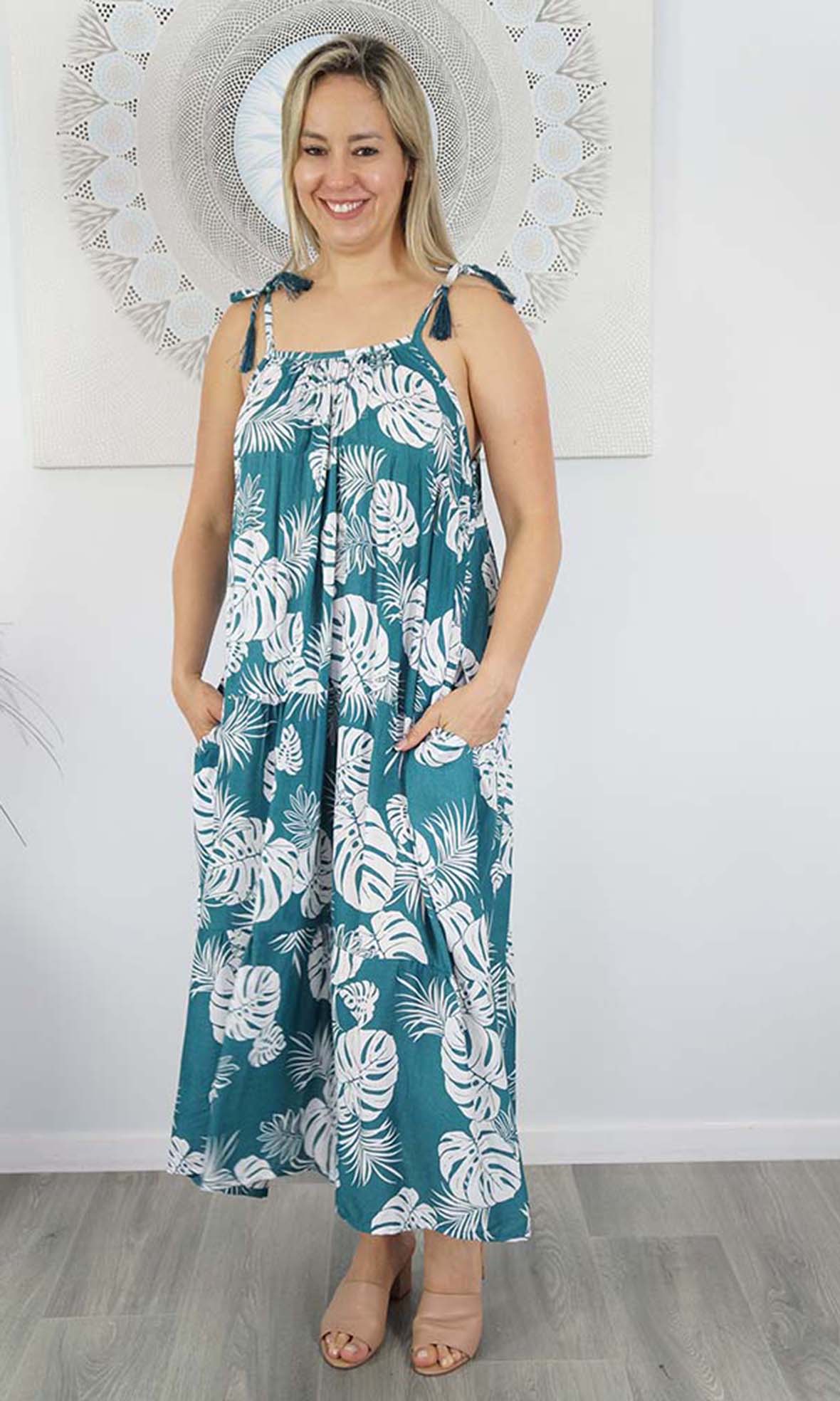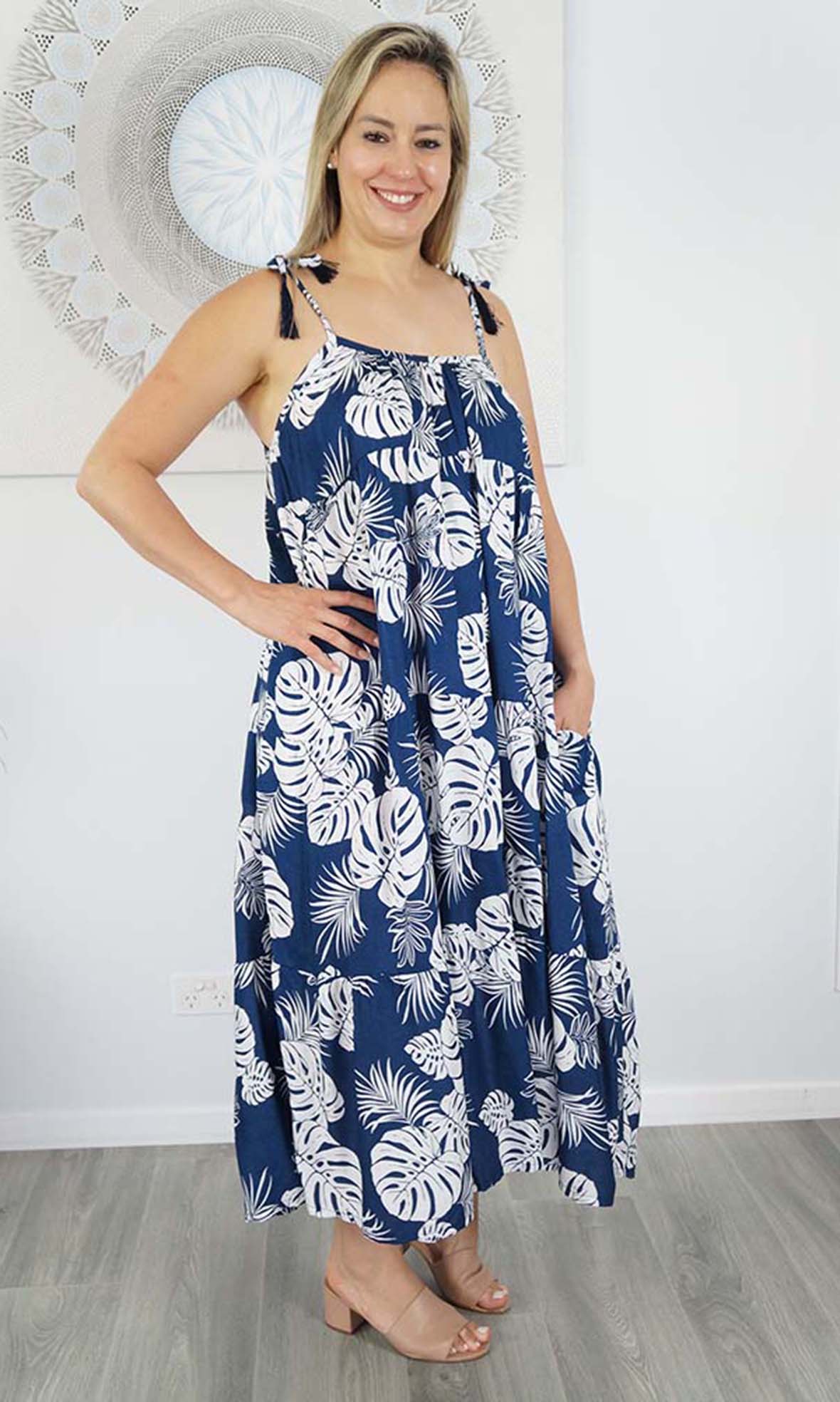 Features include 3-panel construction, elastic underarms for a snug fit for all sizes up to size 18, and side pockets. Tassles on the straps complete this beautifully made dress.