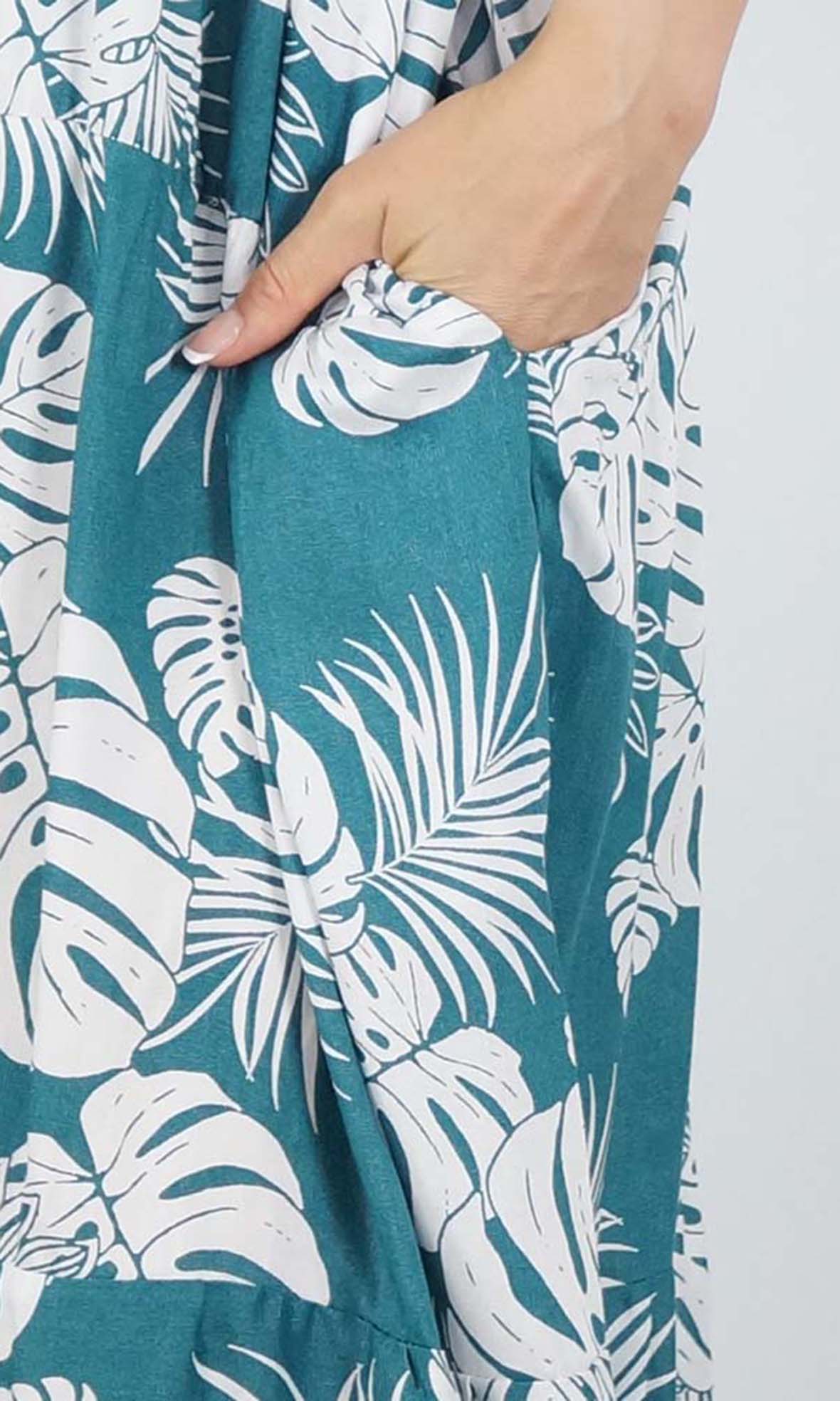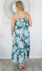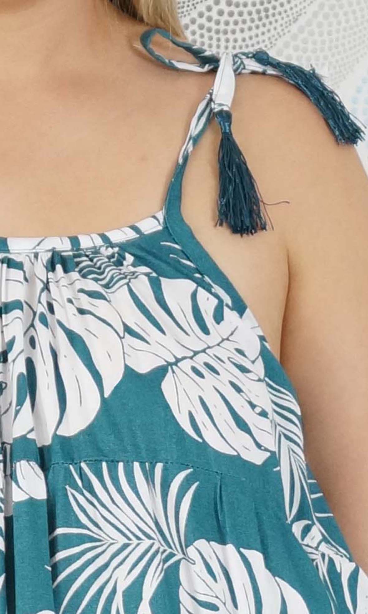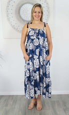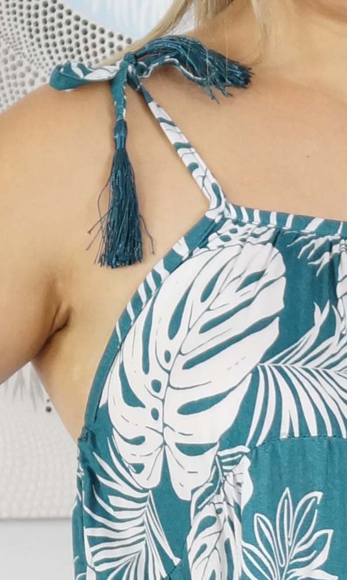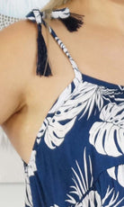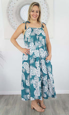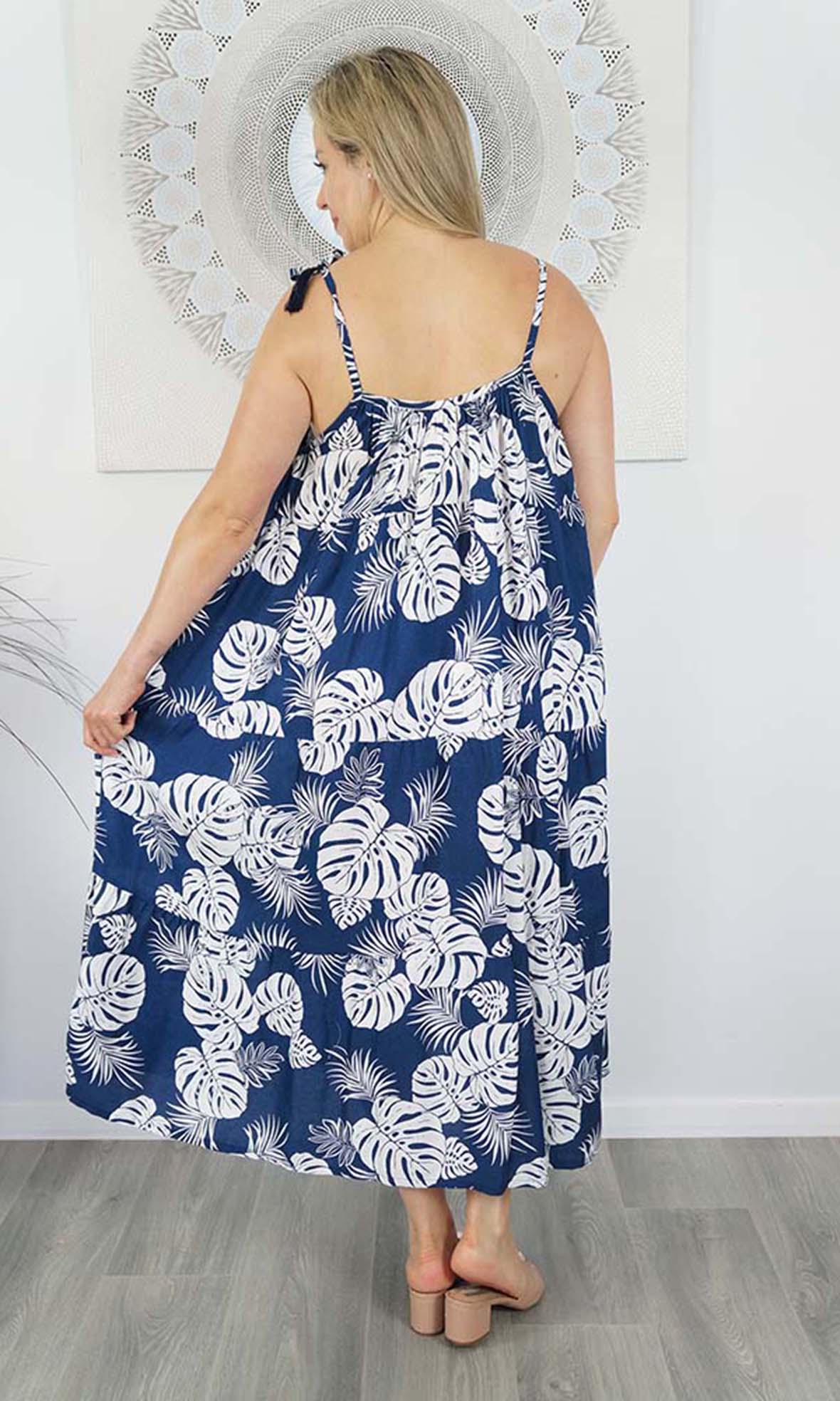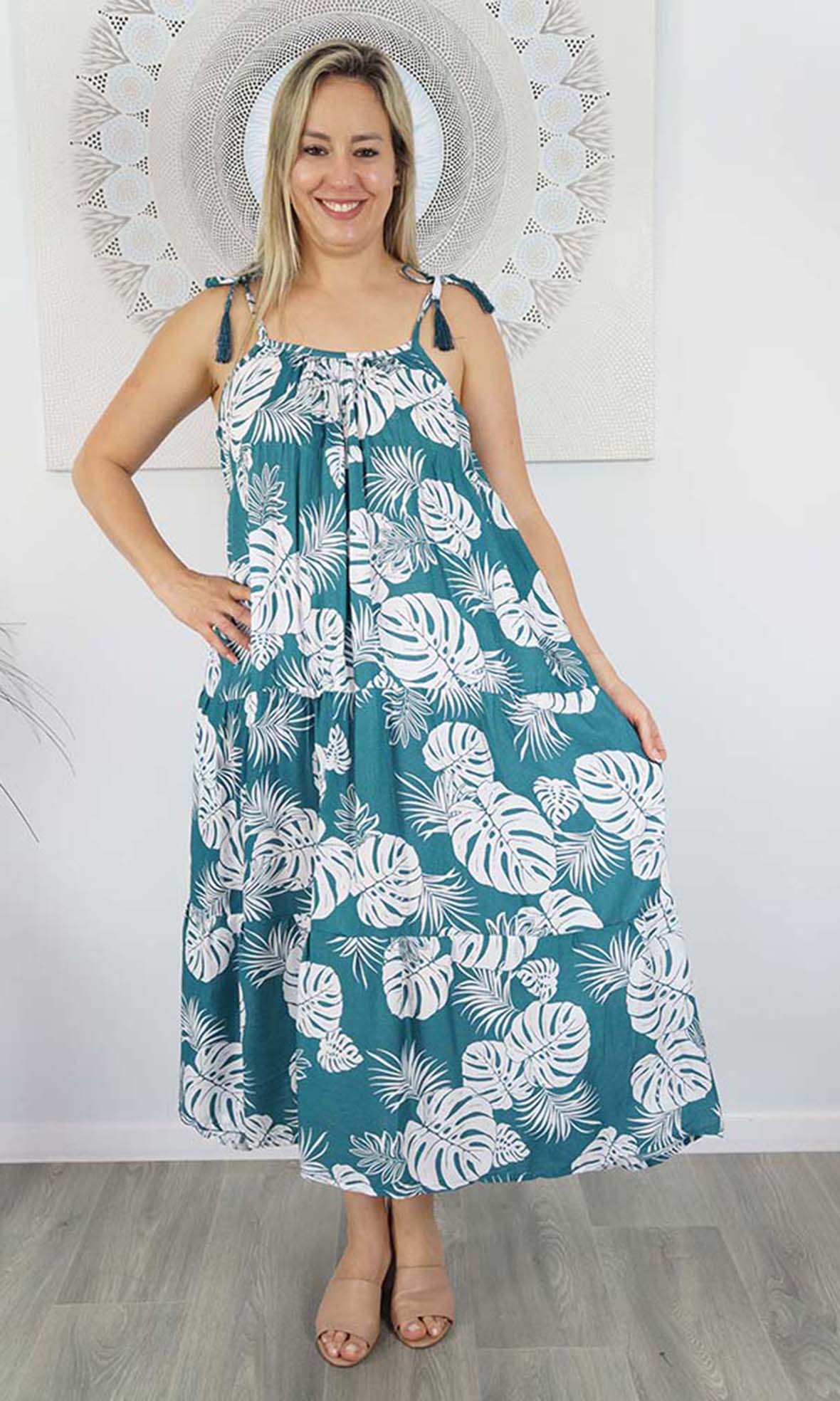 Features include 3-panel construction, elastic underarms for a snug fit for all sizes up to size 18, and side pockets. Tassles on the straps complete this beautifully made dress.