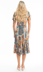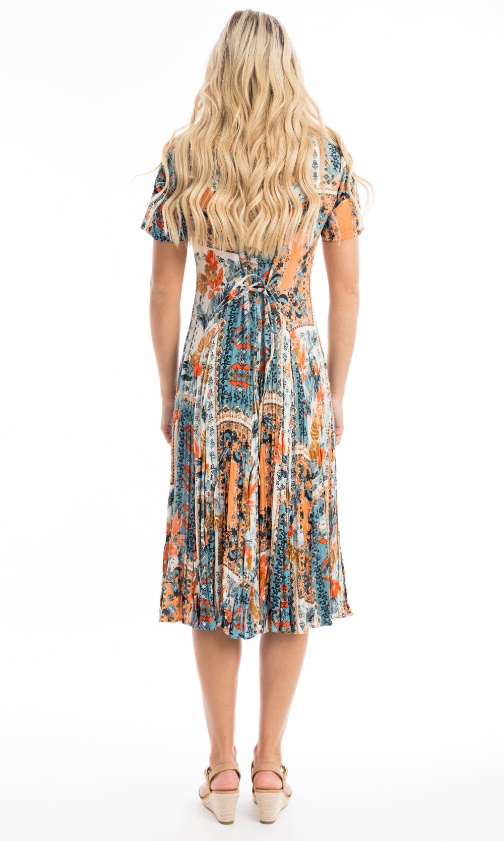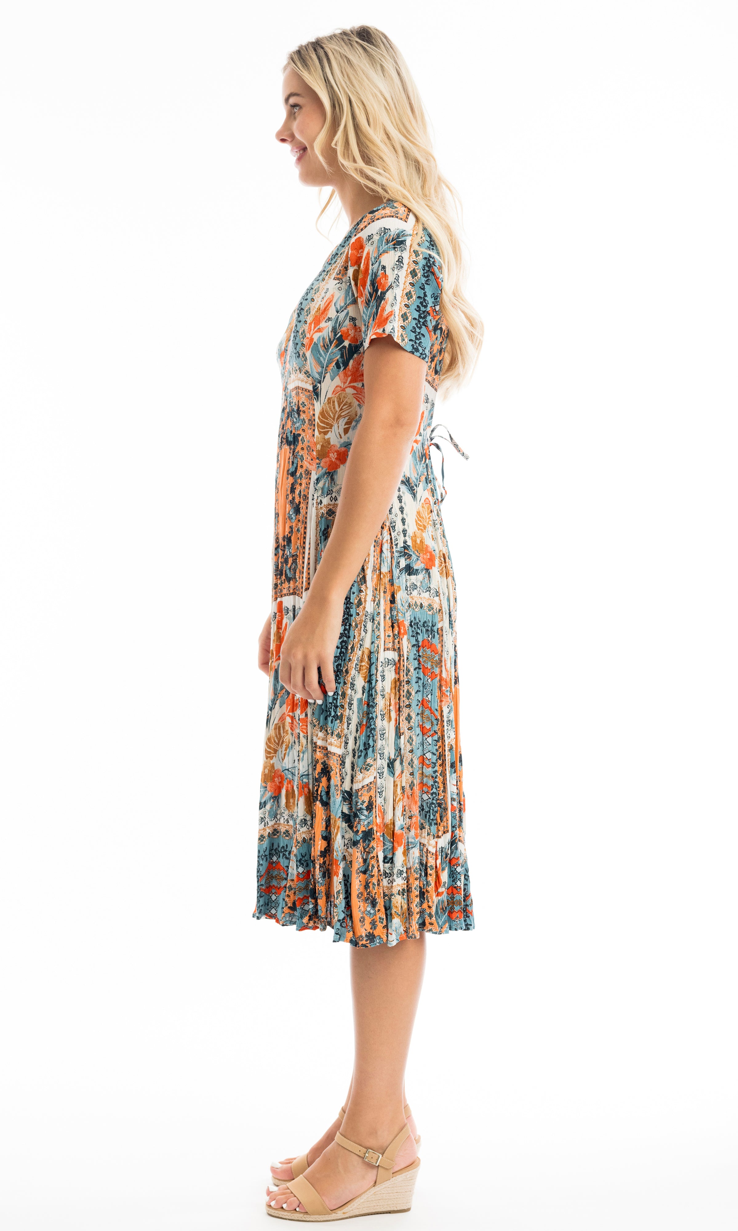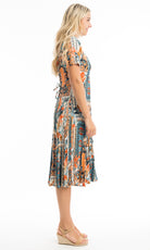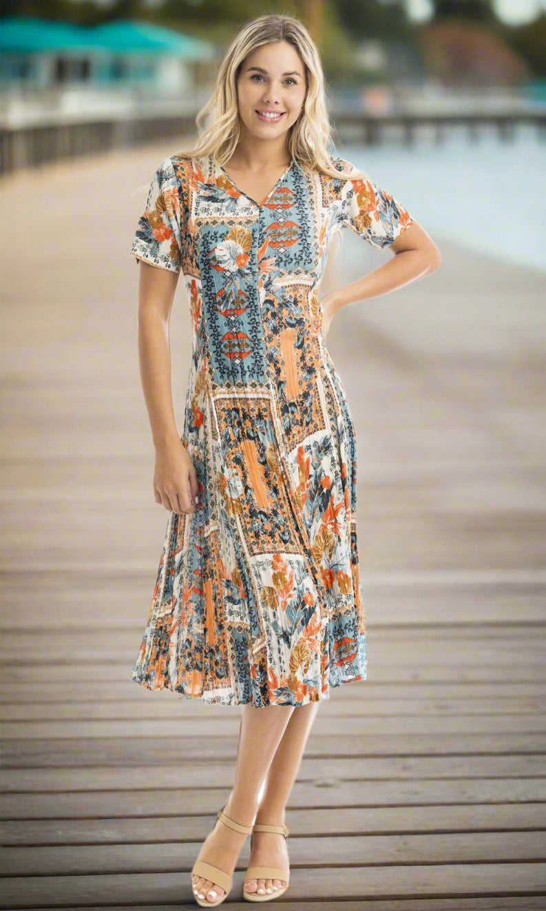 Stay cool and stylish with our colourful Godet dress. Made from natural fibres, it features short sleeves, a flattering v-neckline, stunning colourful print, and godet panels through the skirt that create a beautiful drape and swing in the skirt. Ideal for enjoying warm summer days, this dress combines comfort and style effortlessly.