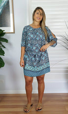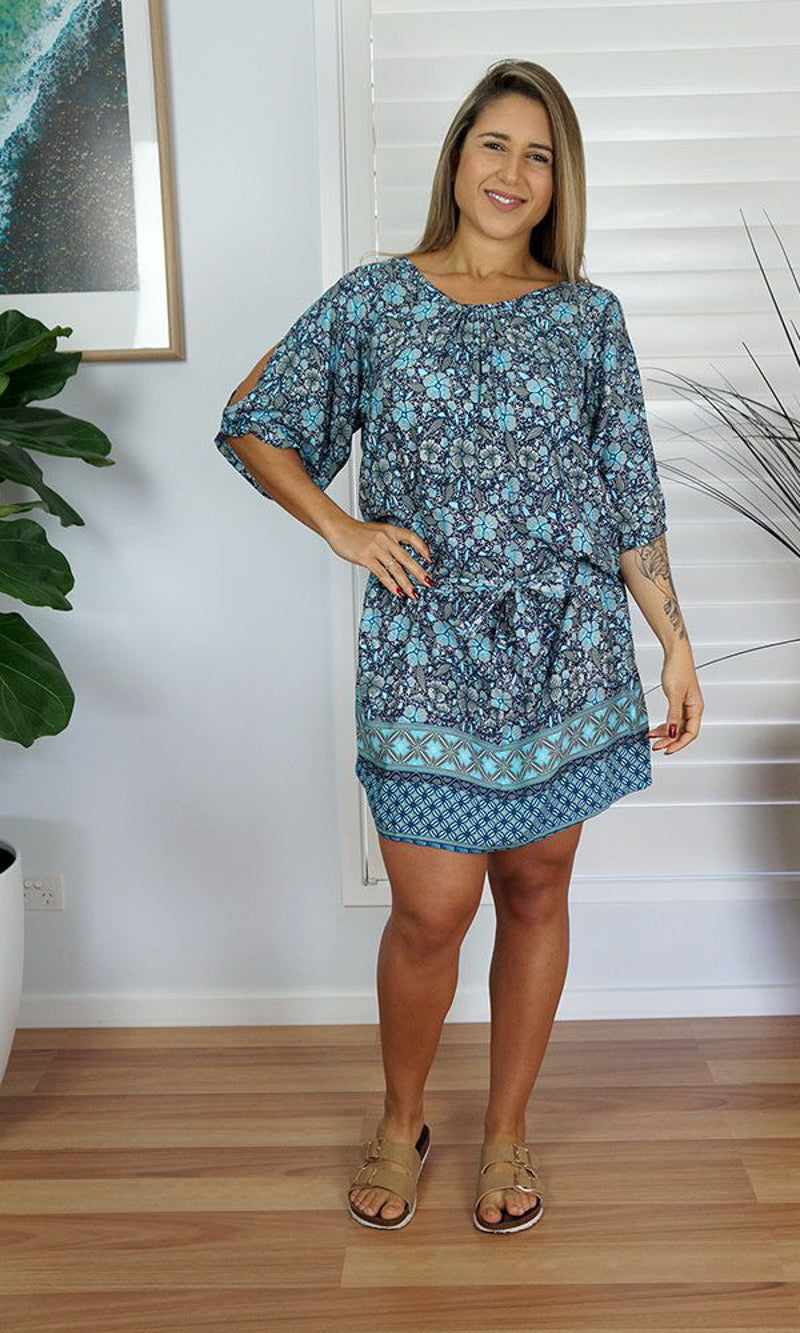 The Hayman Dress is a cool, calm, cold shoulder resort style garment. Made from soft rayon, and a matching fabric belt this can be worn as a dress or tunic over swimwear. Perfect addition to your summer collection!