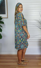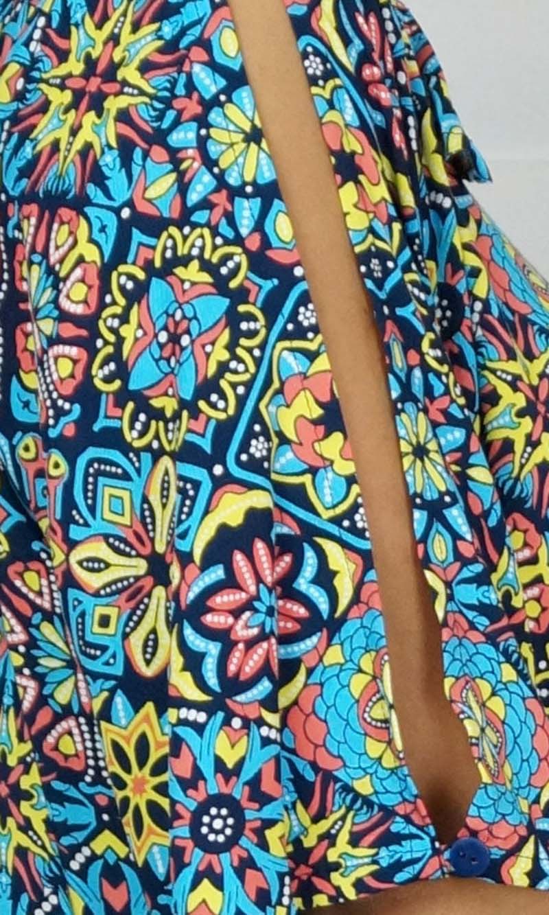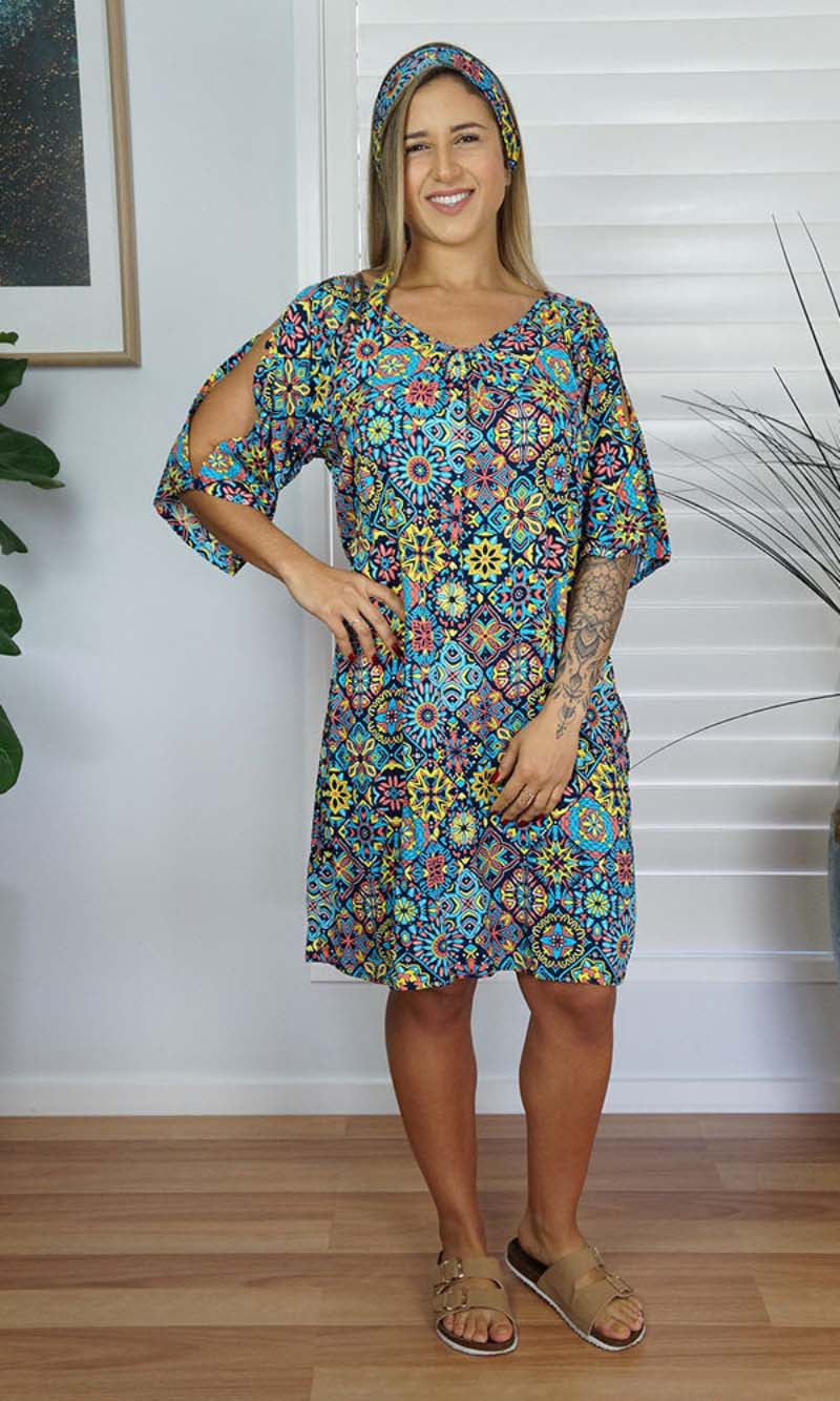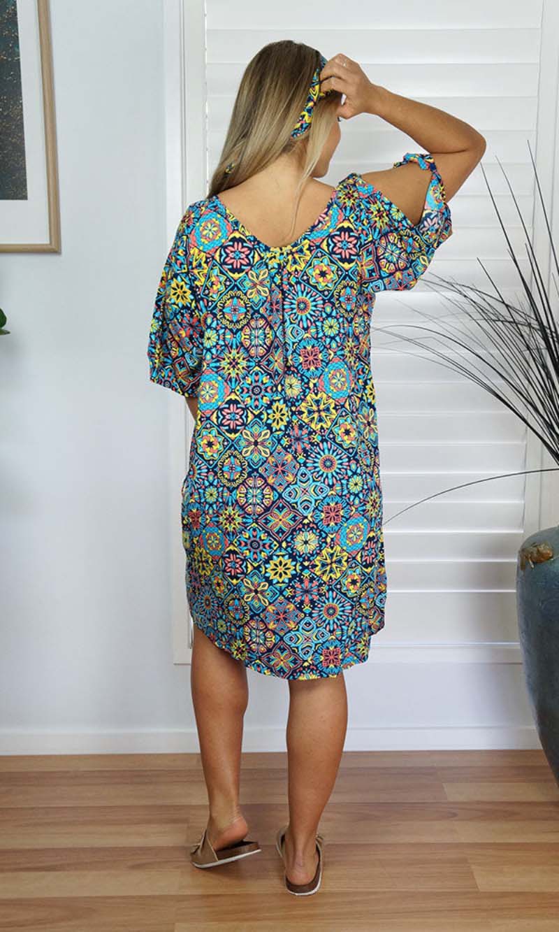 Made from a cool rayon with open sleeves and a matching fabric tie for around the waist this dress is perfect for summer.