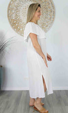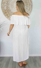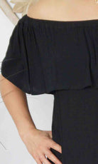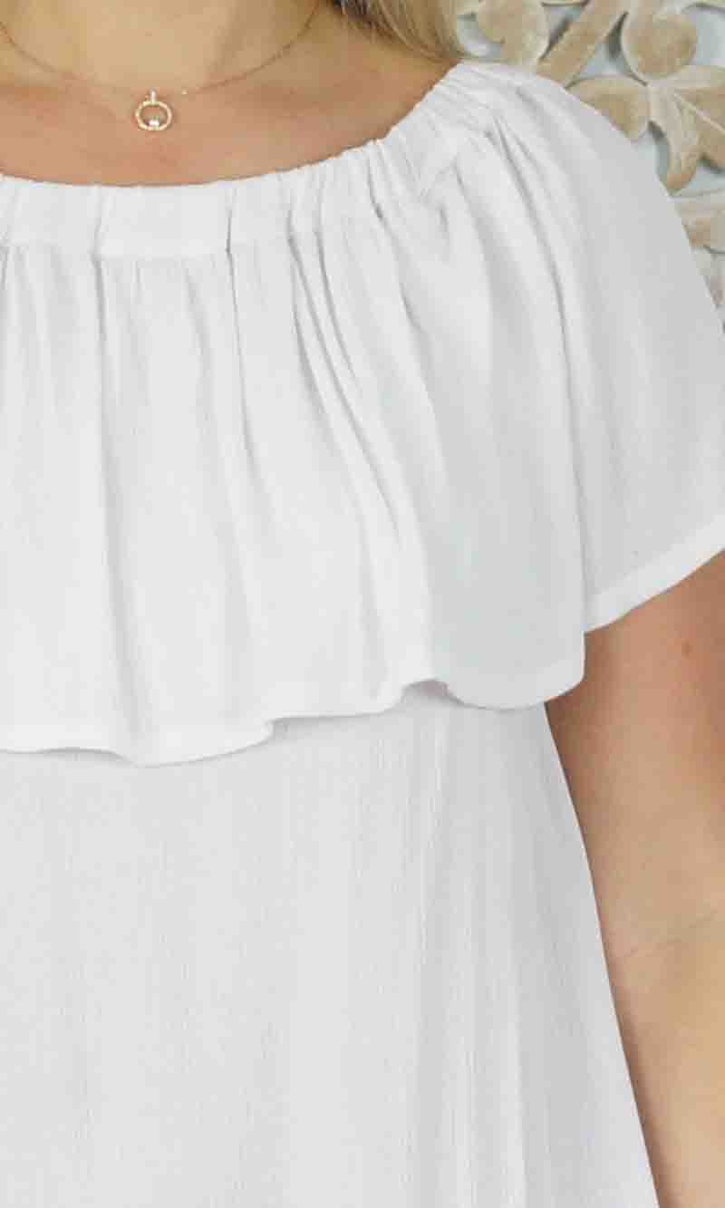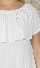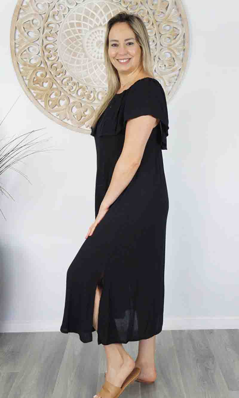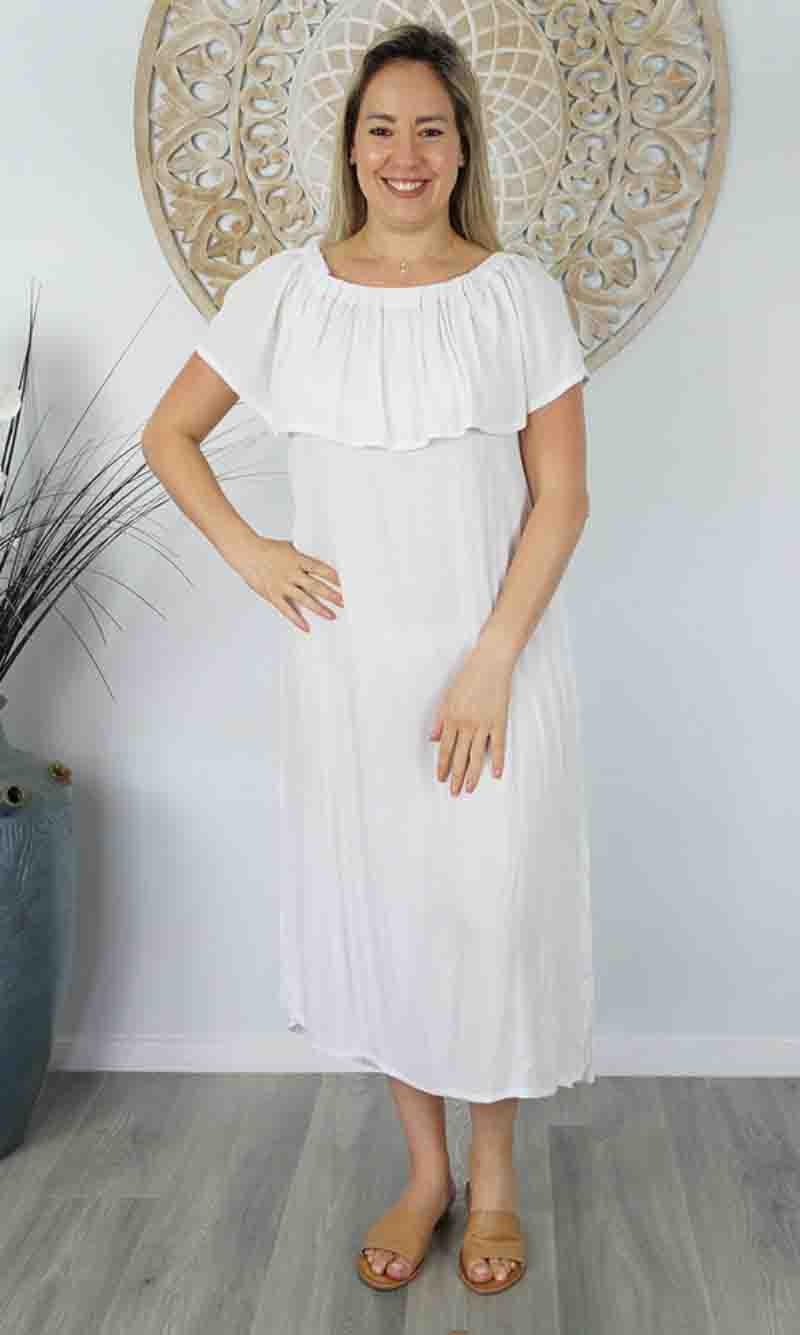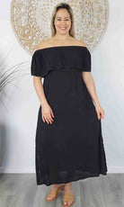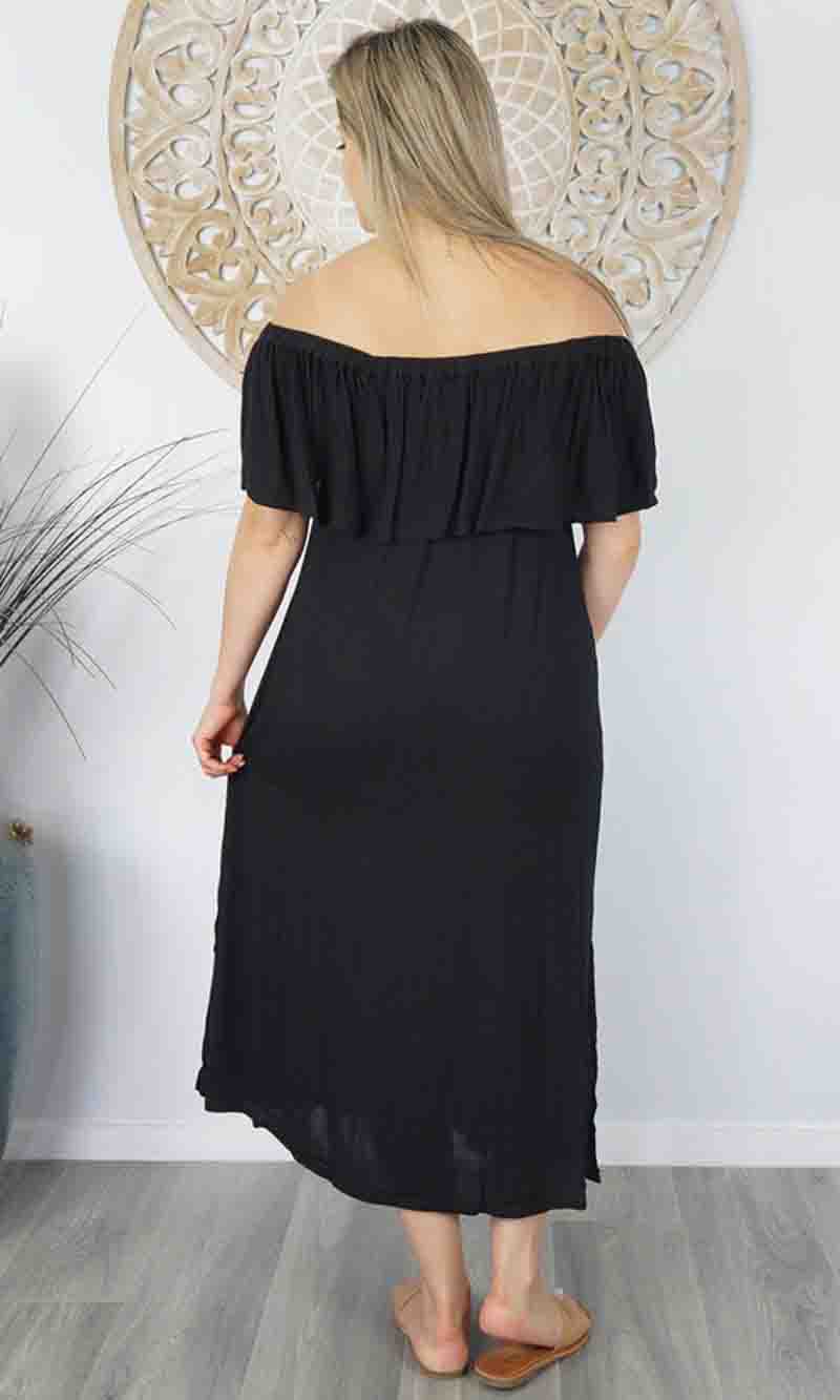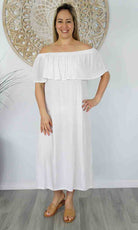 Cool and comfortable off the shoulder dress with frill detail in a lovely pre shrunk crinkle rayon. Free Sizing 8-16