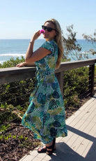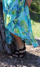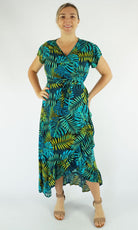Features V neckline and capped sleeves. A waist side seam keyhole opening to feed tie through to give an extra flattering look, along with the ruffled skirt hem.