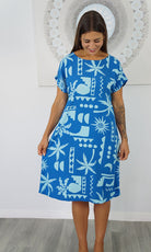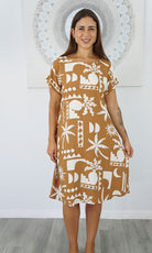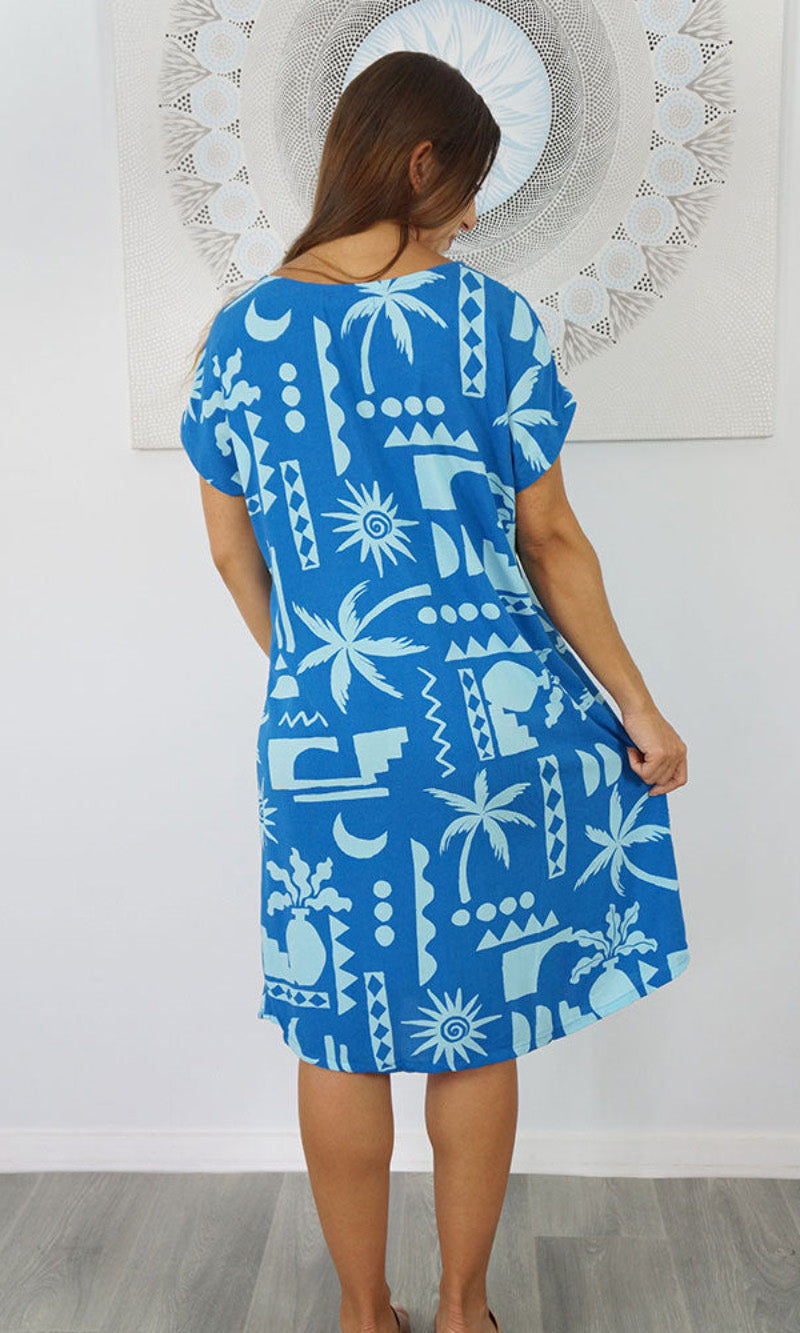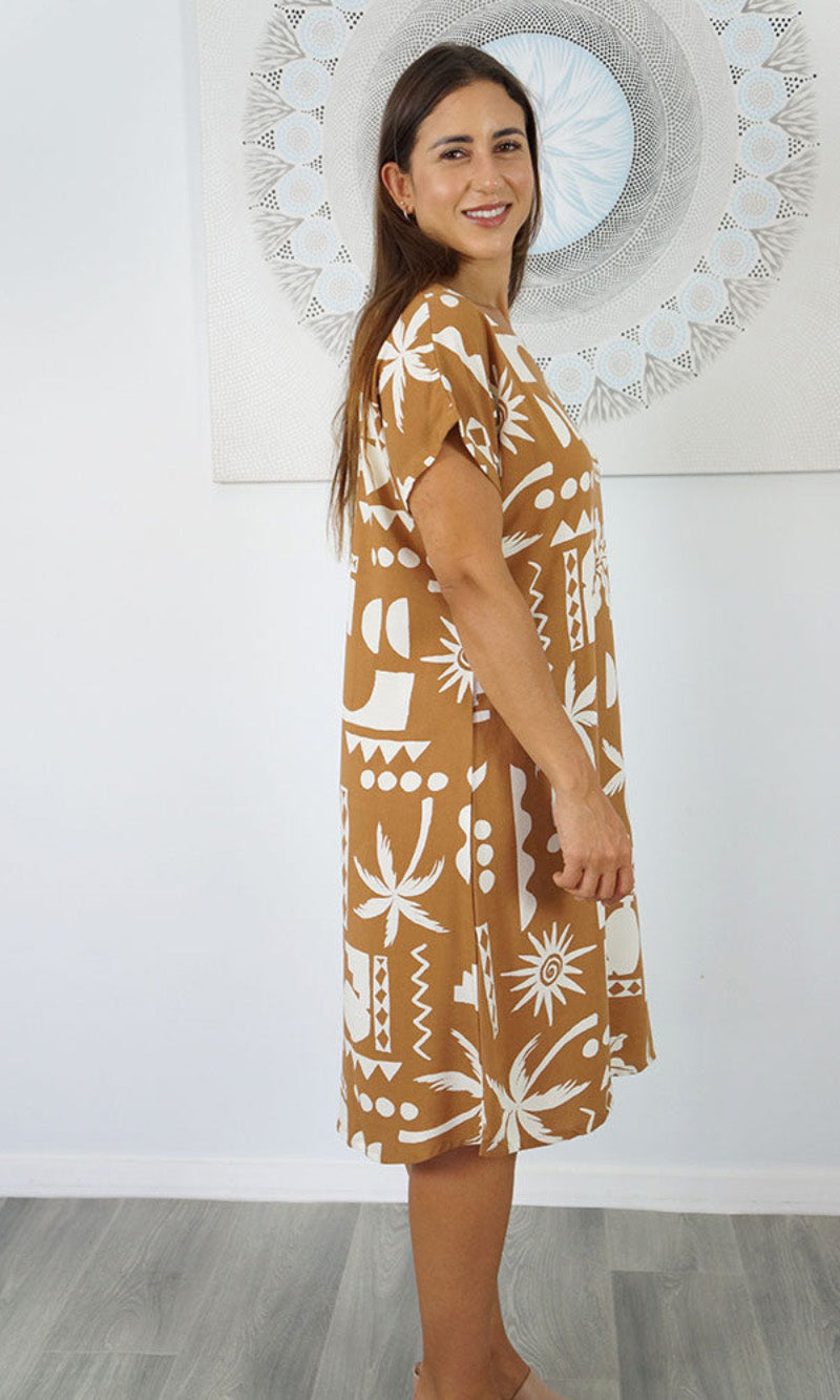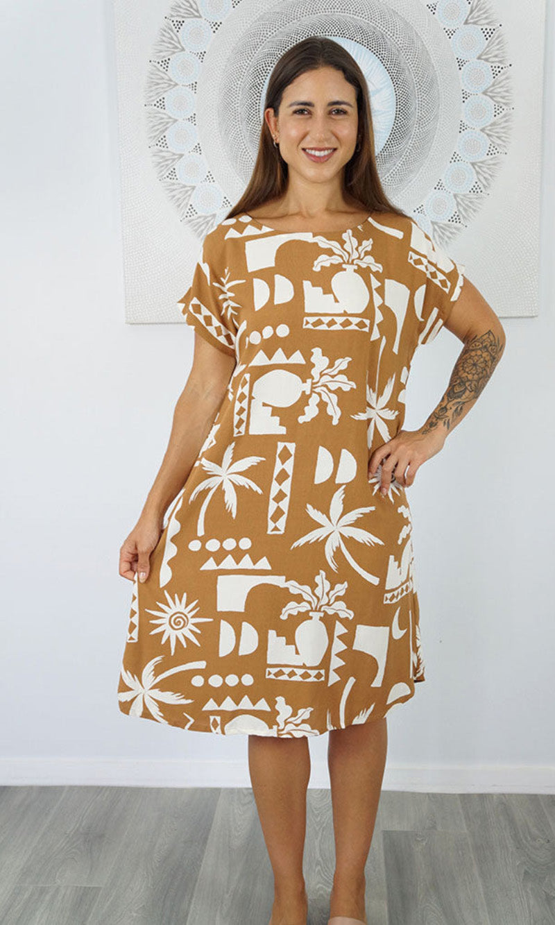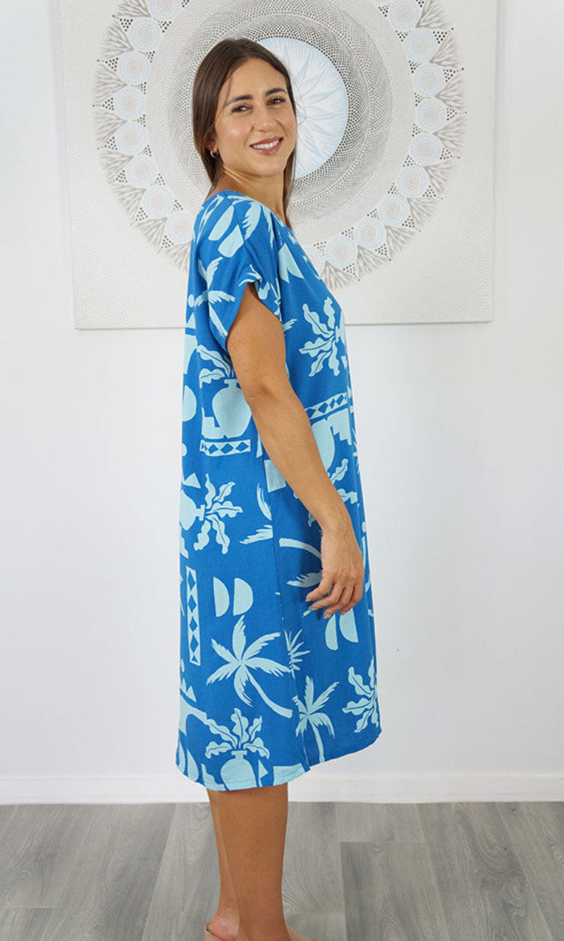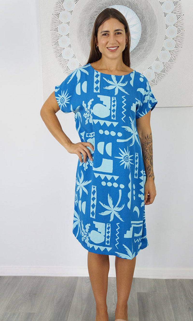 The Michelle Dress is a tried and true favorite. The simple t-shirt shape is made elegant with soft and smooth rayon material and added length on the bottom so you can wear the Michelle to work or over bathers. Versatile and comfortable, the Michelle Dress is a timeless style. Available in sizes 8-10, 12-14, 16-18.