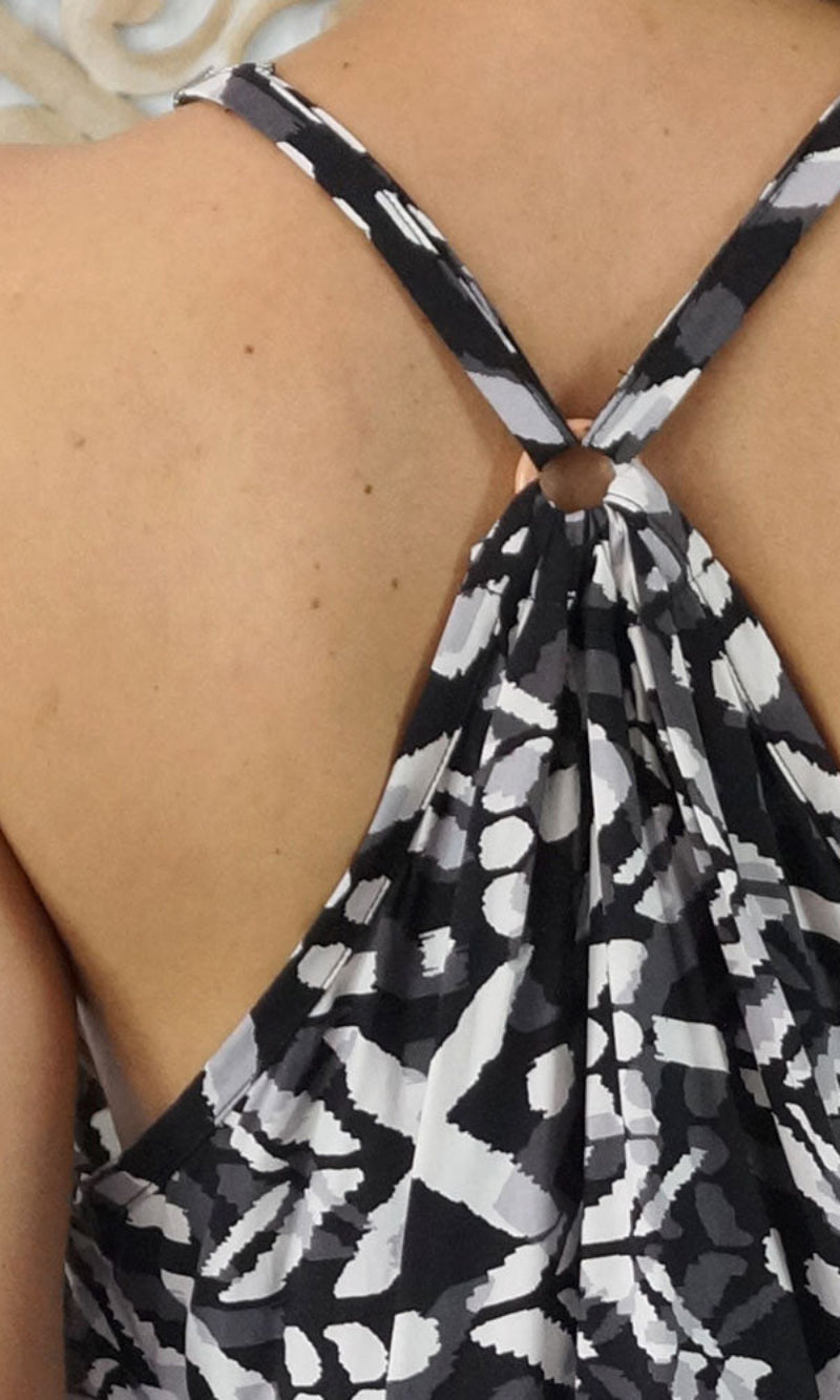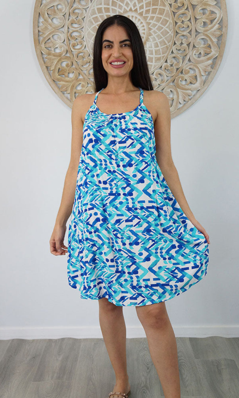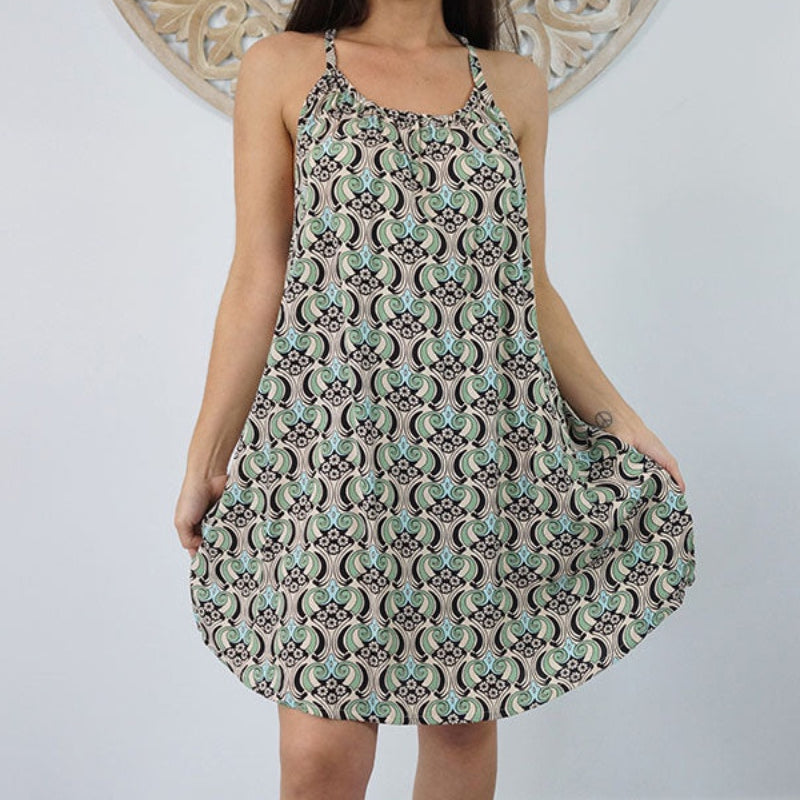 The Short Sherbet dress offers a comfortable and stylish option for warm weather. Made from soft, lightweight rayon, it helps keep you cool, while its loose, flowing silhouette allows for easy movement. Featuring adjustable straps and a distinctive wooden ring at the back, it showcases a trendy racerback design with an elegant touch.