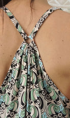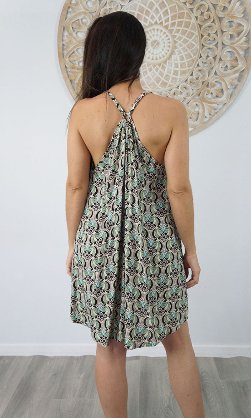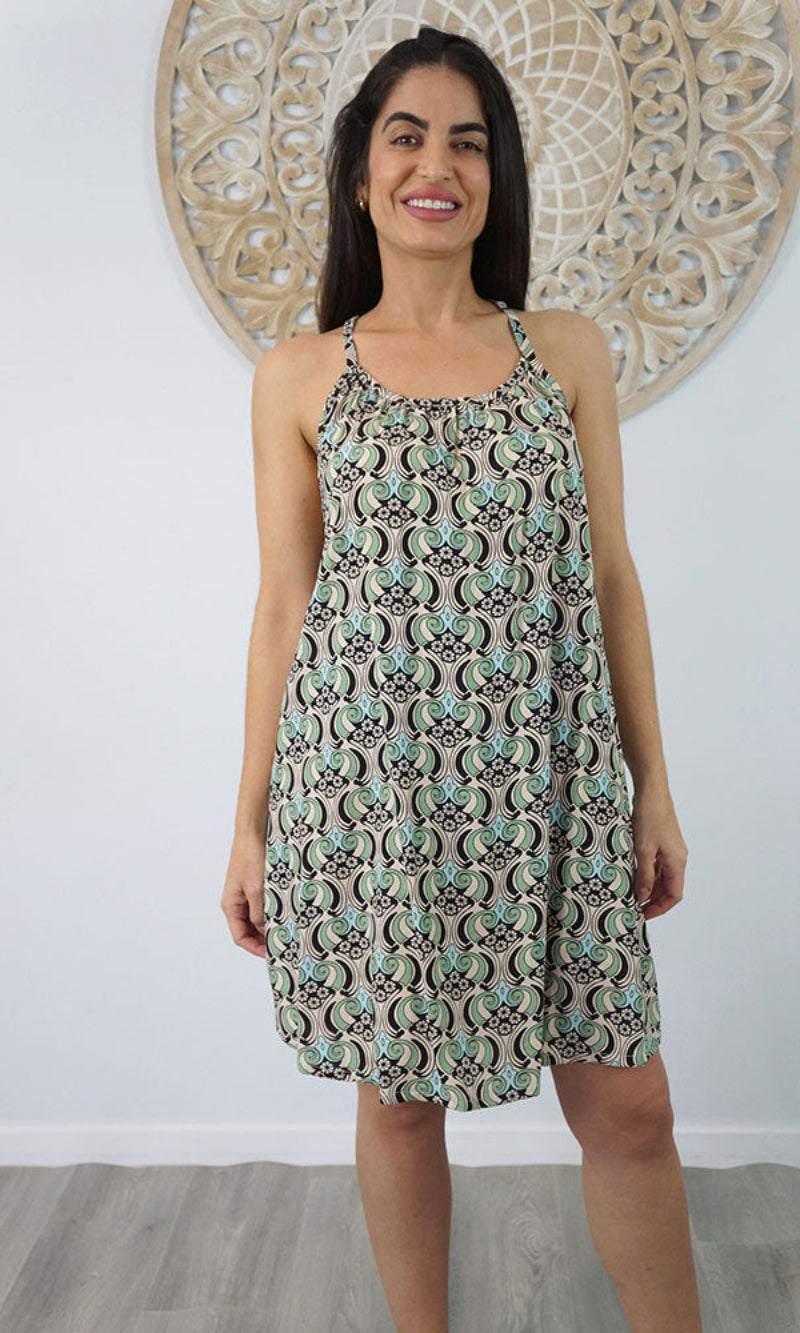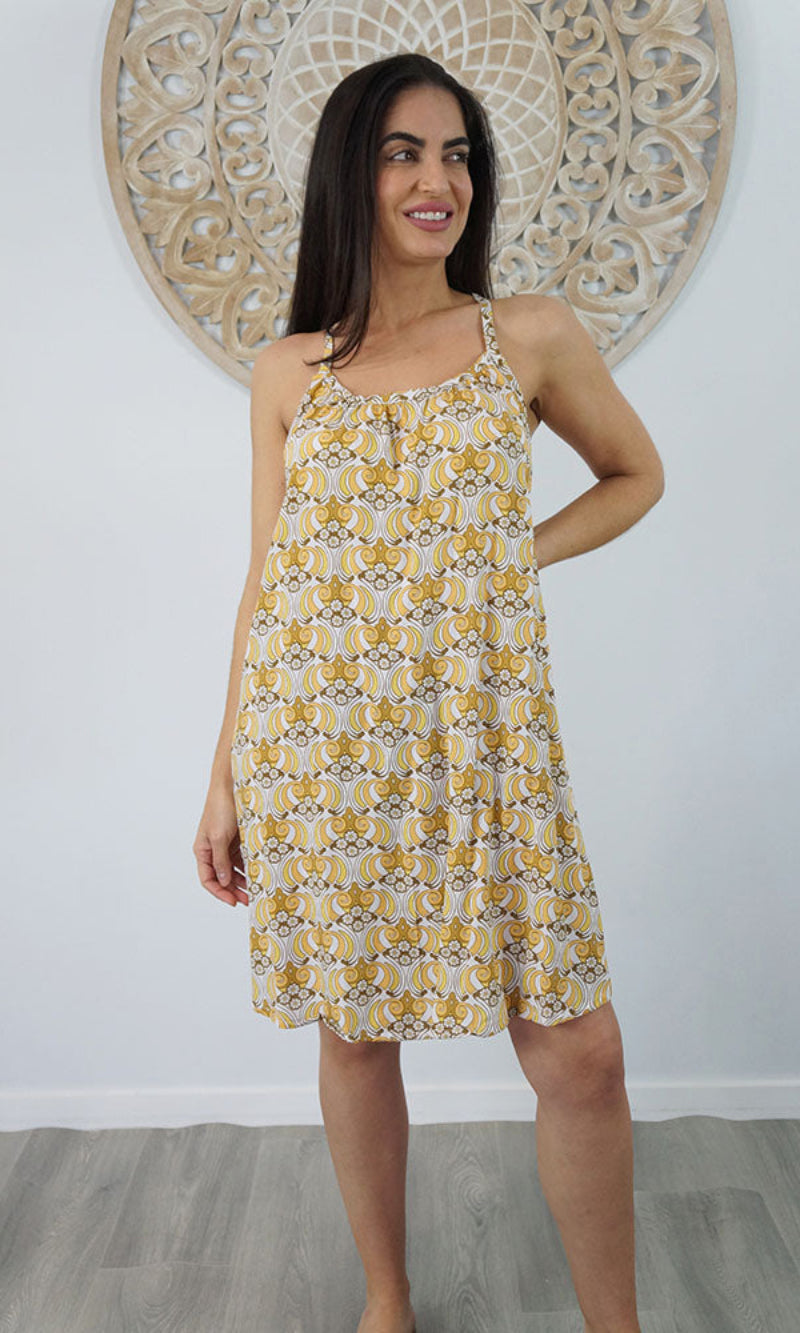 The Short Sherbet dress offers a comfortable and stylish option for warm weather. Made from soft, lightweight rayon, it helps keep you cool, while its loose, flowing silhouette allows for easy movement. Featuring adjustable straps and a distinctive wooden ring at the back, it showcases a trendy racerback design with an elegant touch.