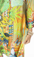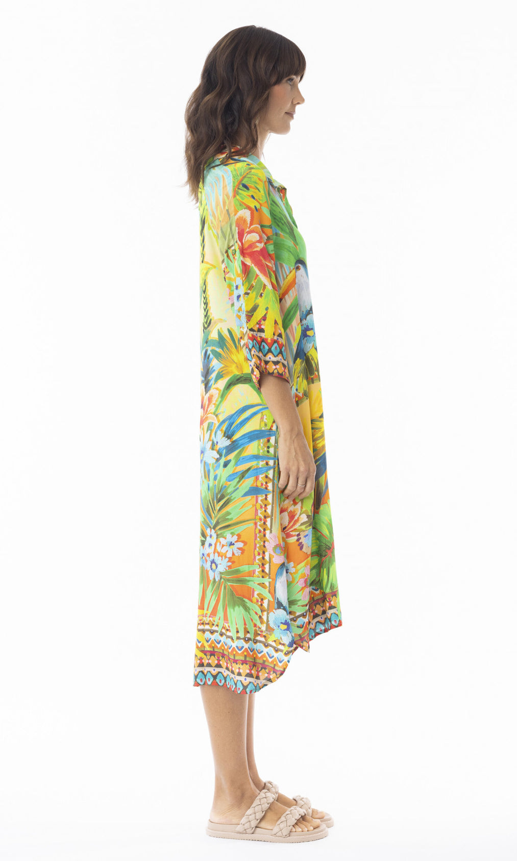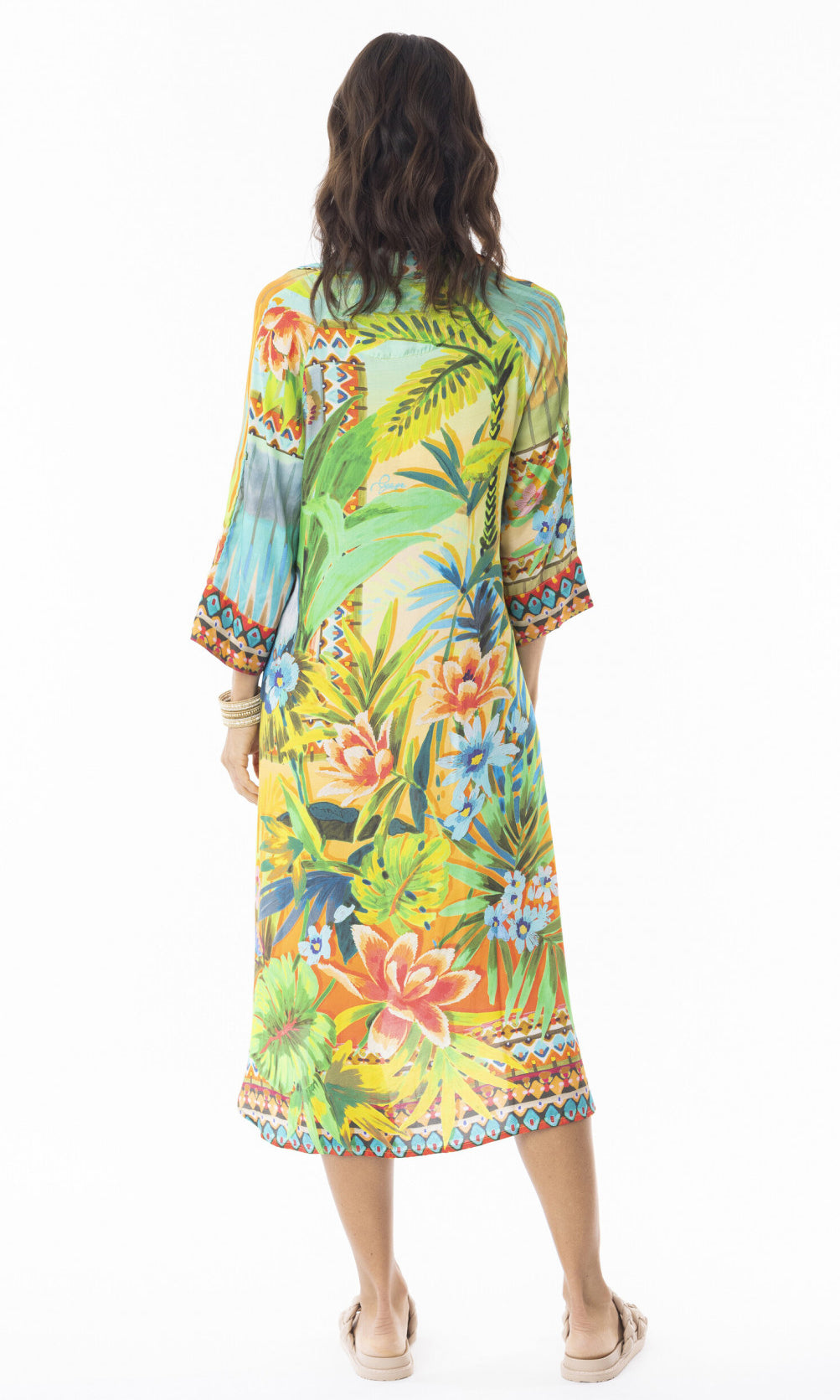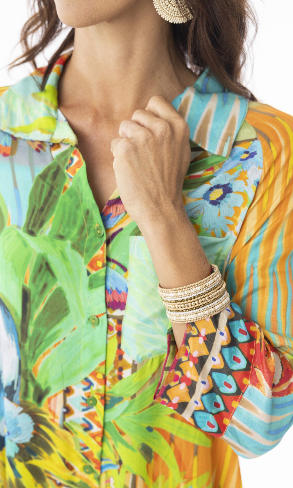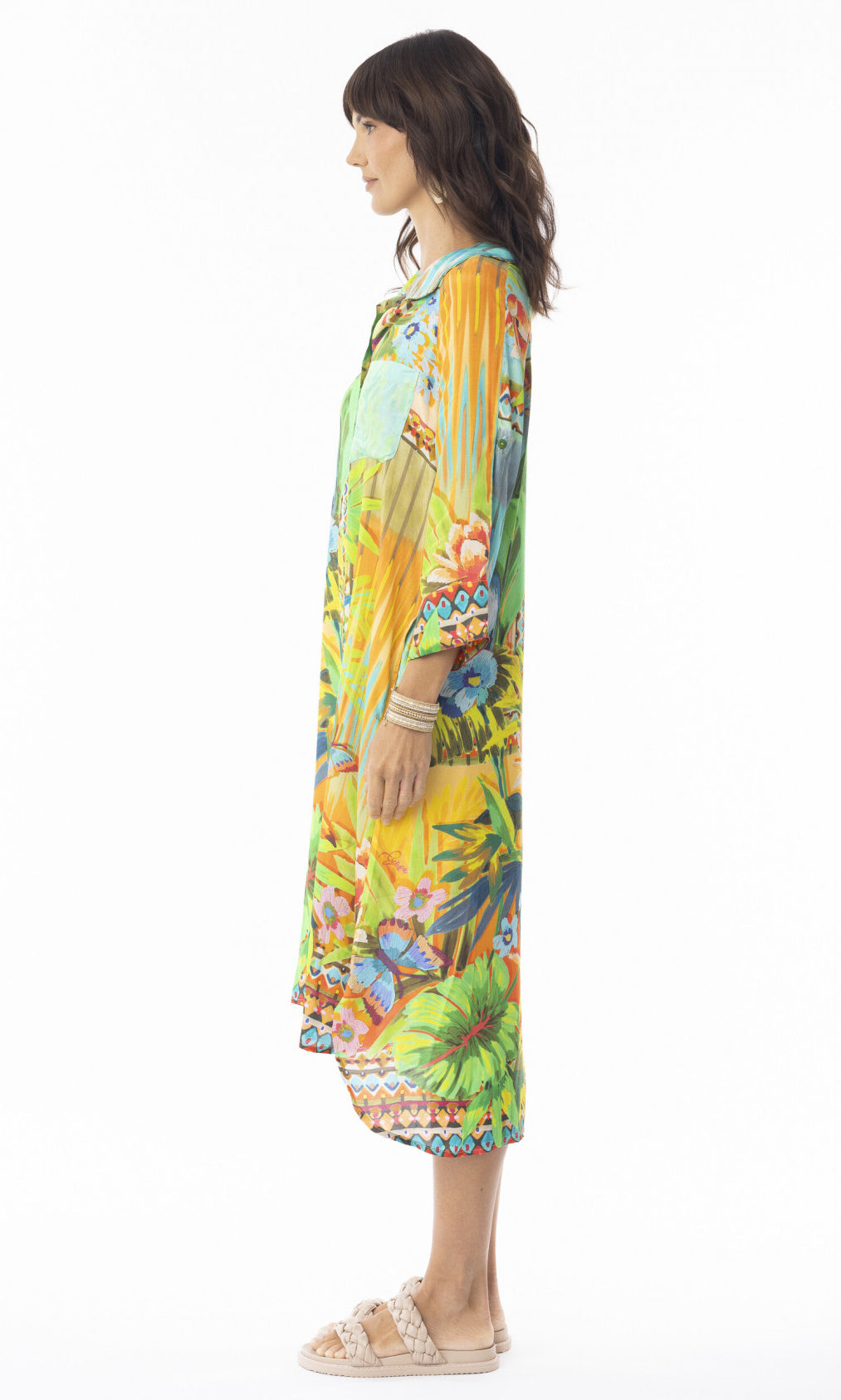 Answer the call of adventure in the celestial Georgia Collar Shirt Dress. Crafted from breathable linen, this versatile piece features a crisp collar, full-length button placket, and practical side pockets. Perfect for any occasion, with its bejewelled turquoise accents and wild escape print, it transitions seamlessly from day to evening, ensuring you look effortlessly chic wherever you go.
