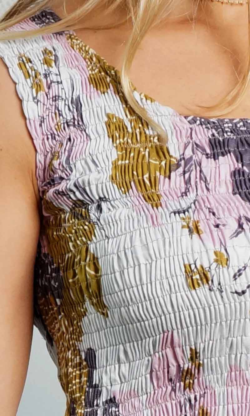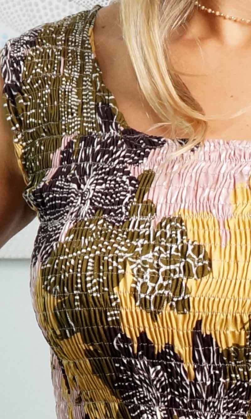 With its shirred bodice, this dress looks great no matter what size you are. Works well both with small or large bust.