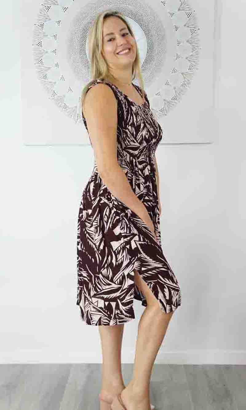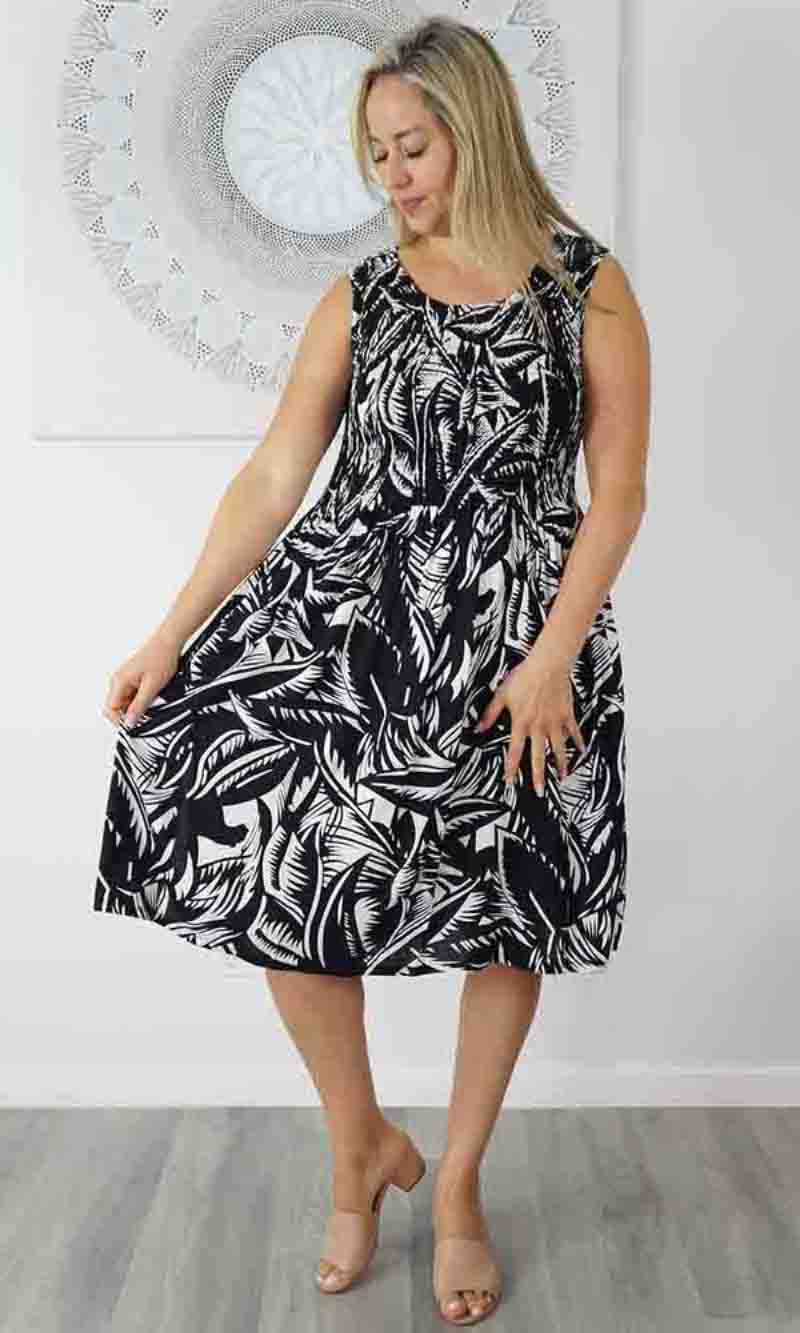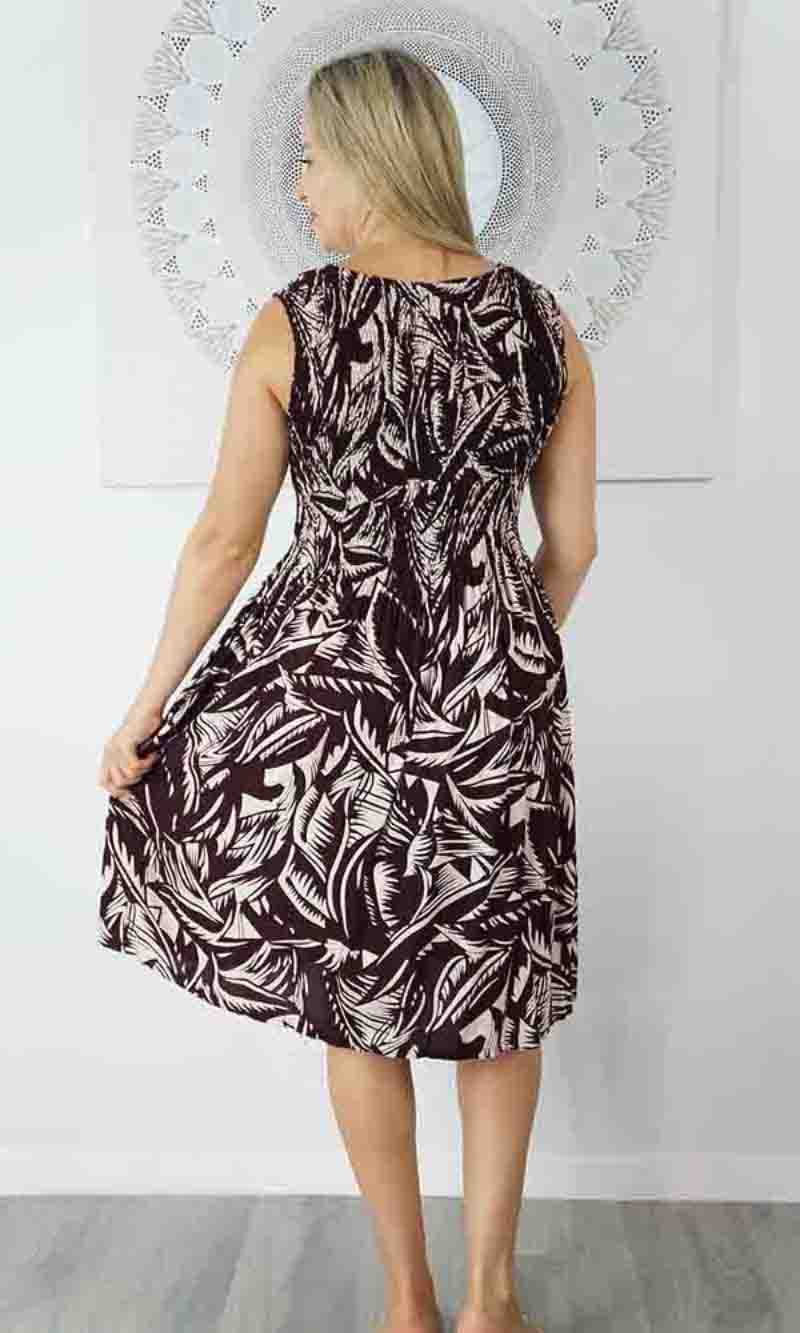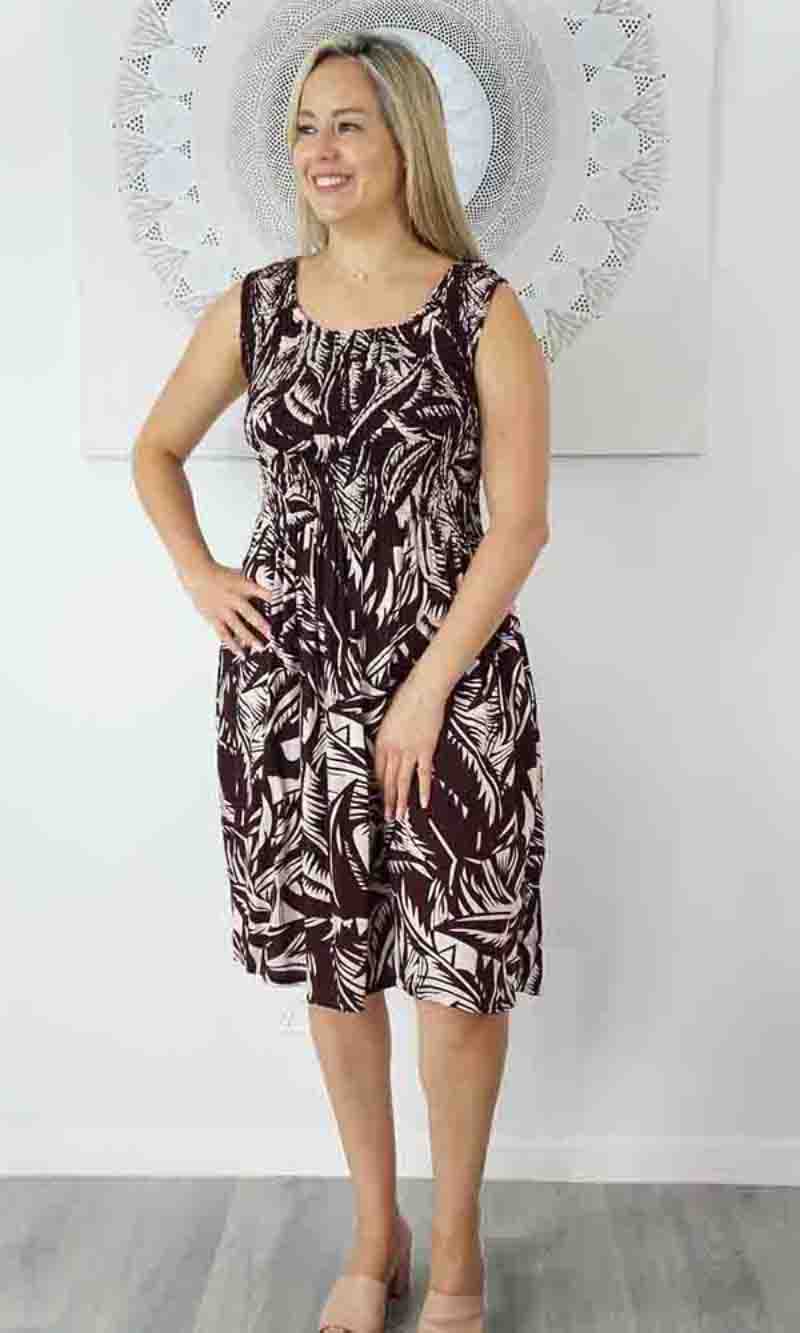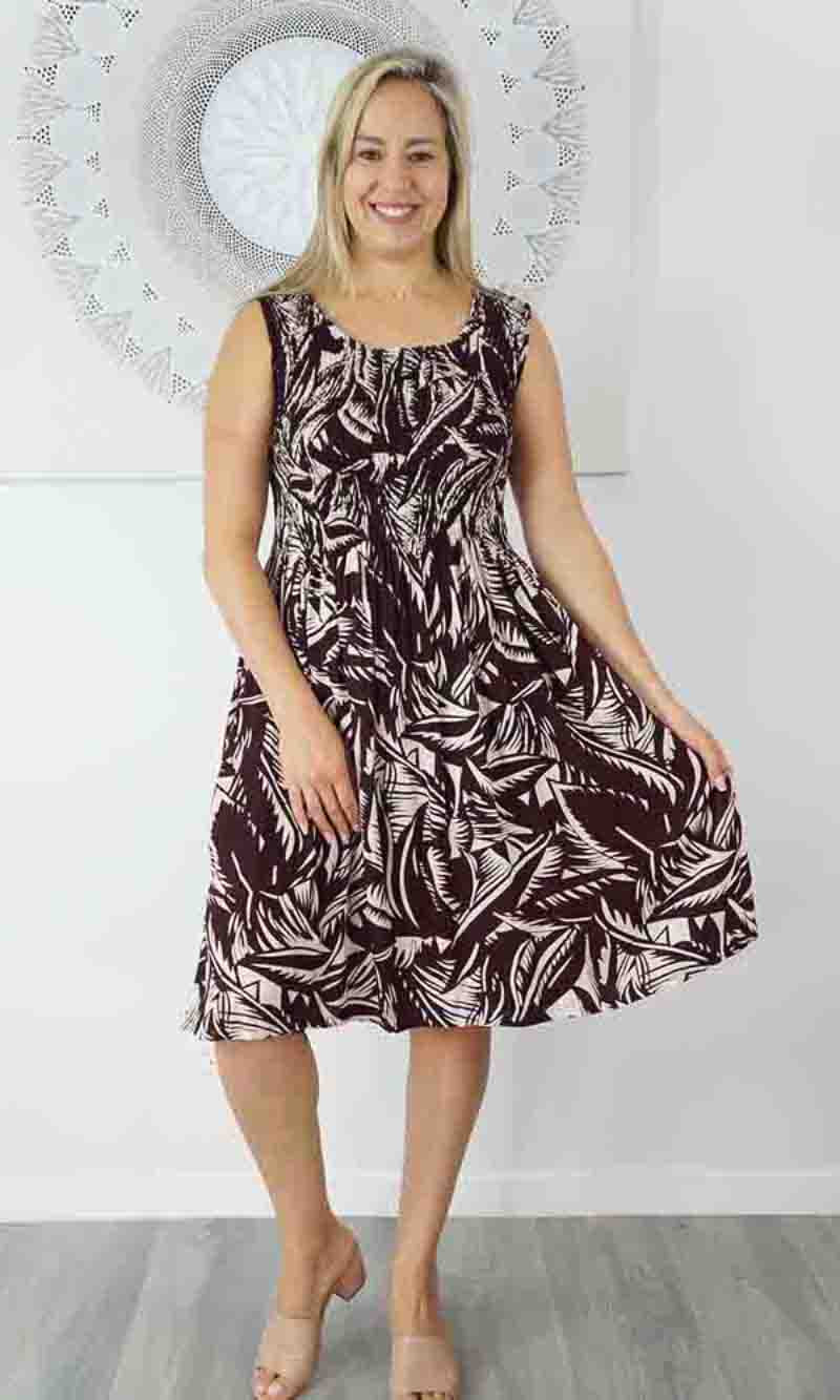 Abstract Leaf design singlet shirring dress. To suit most sizes 8-18. Lovely and cool rayon fabric.