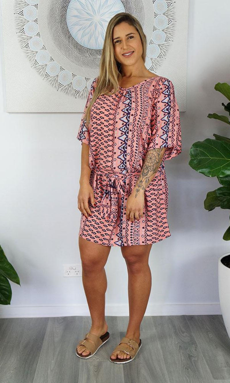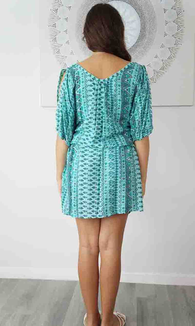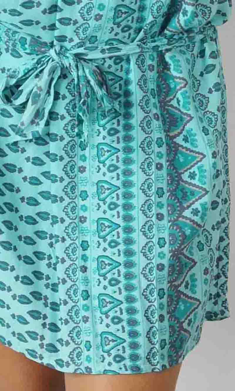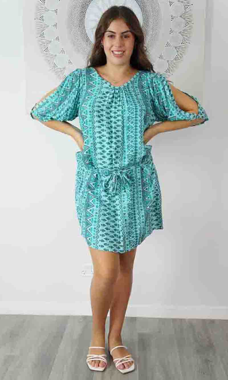 Made from a cool rayon with open sleeves and a matching fabric tie for around the waist this dress is perfect for summer.