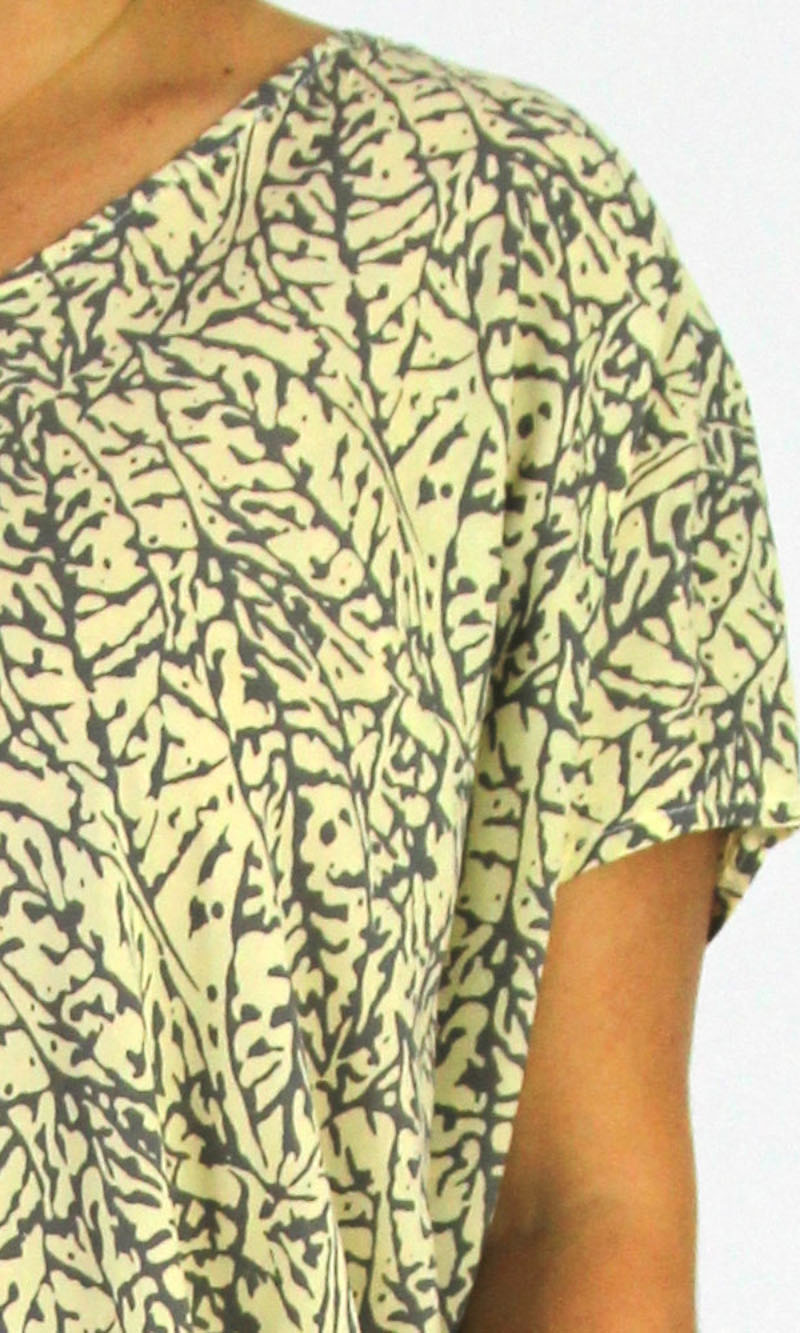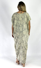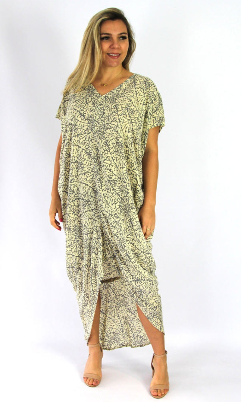 Comfortable day dress with short sleeves. Rising up in the front to a comfortable knee length. Free falling style to suit most body shapes.