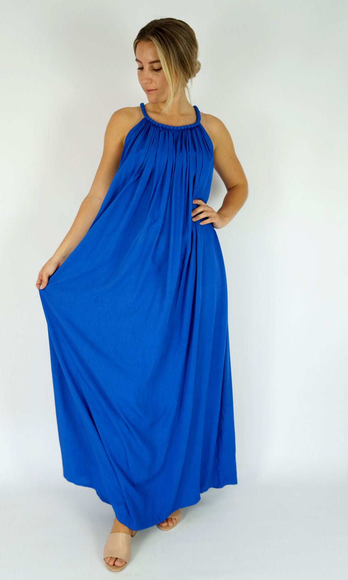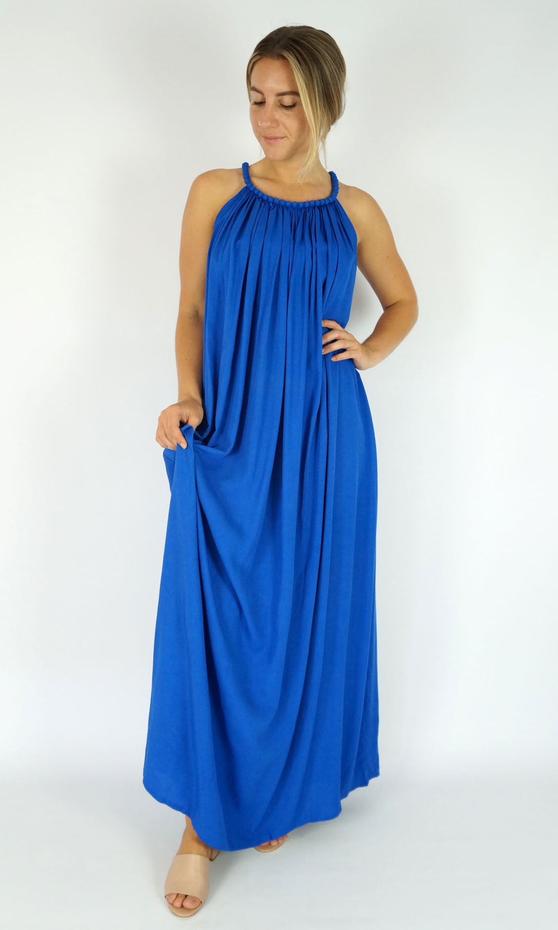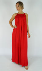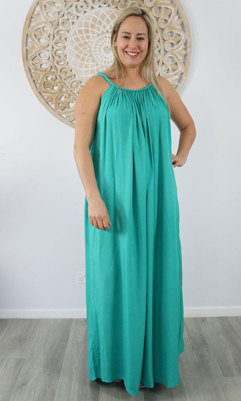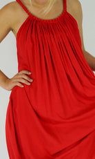 A great summers flowing dress with a bobble neckline. Many colours. Also available in knee length.
