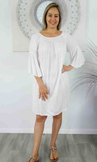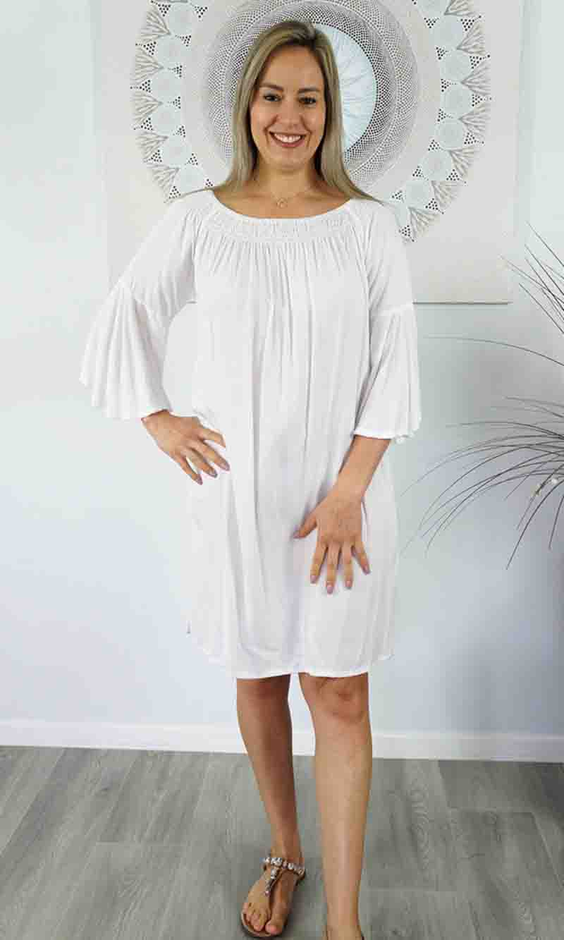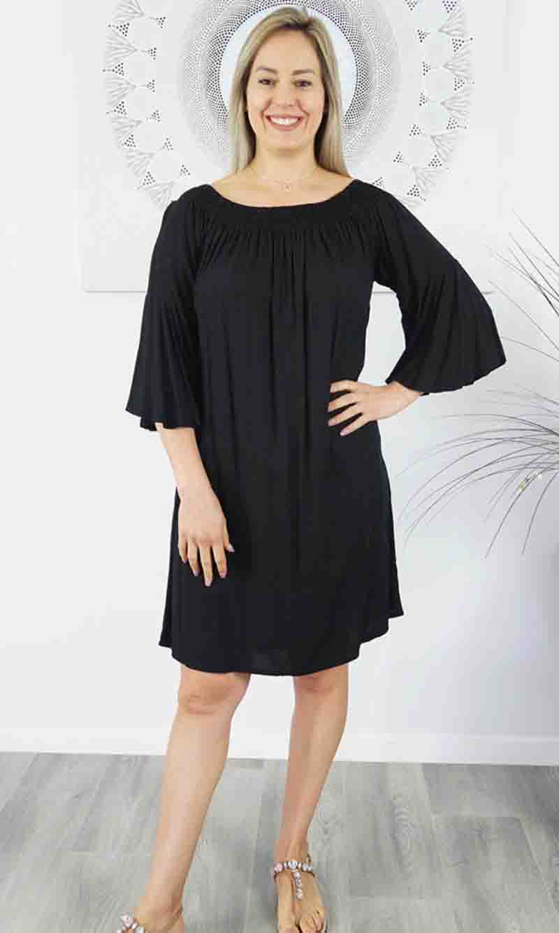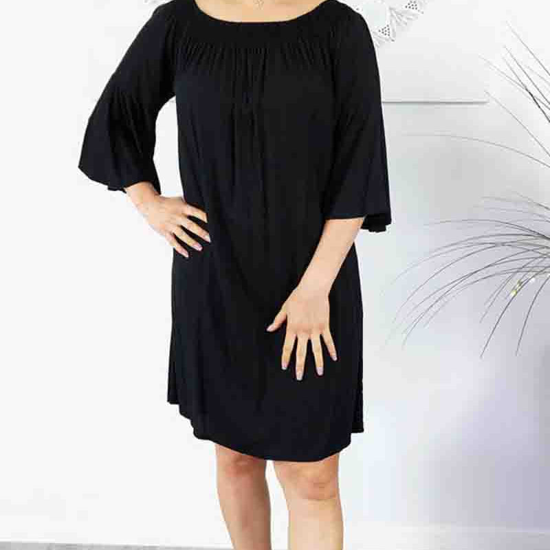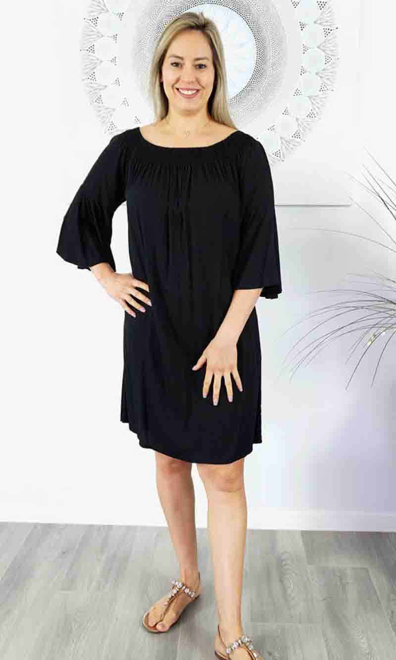This Malibu dress is suited to those who want comfort and class. Elastic around the top of the dress to wear on or off the shoulders to suit your mood. "Bell" style arms for a bit of flair. Available in 3 sizes.