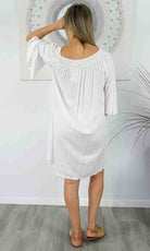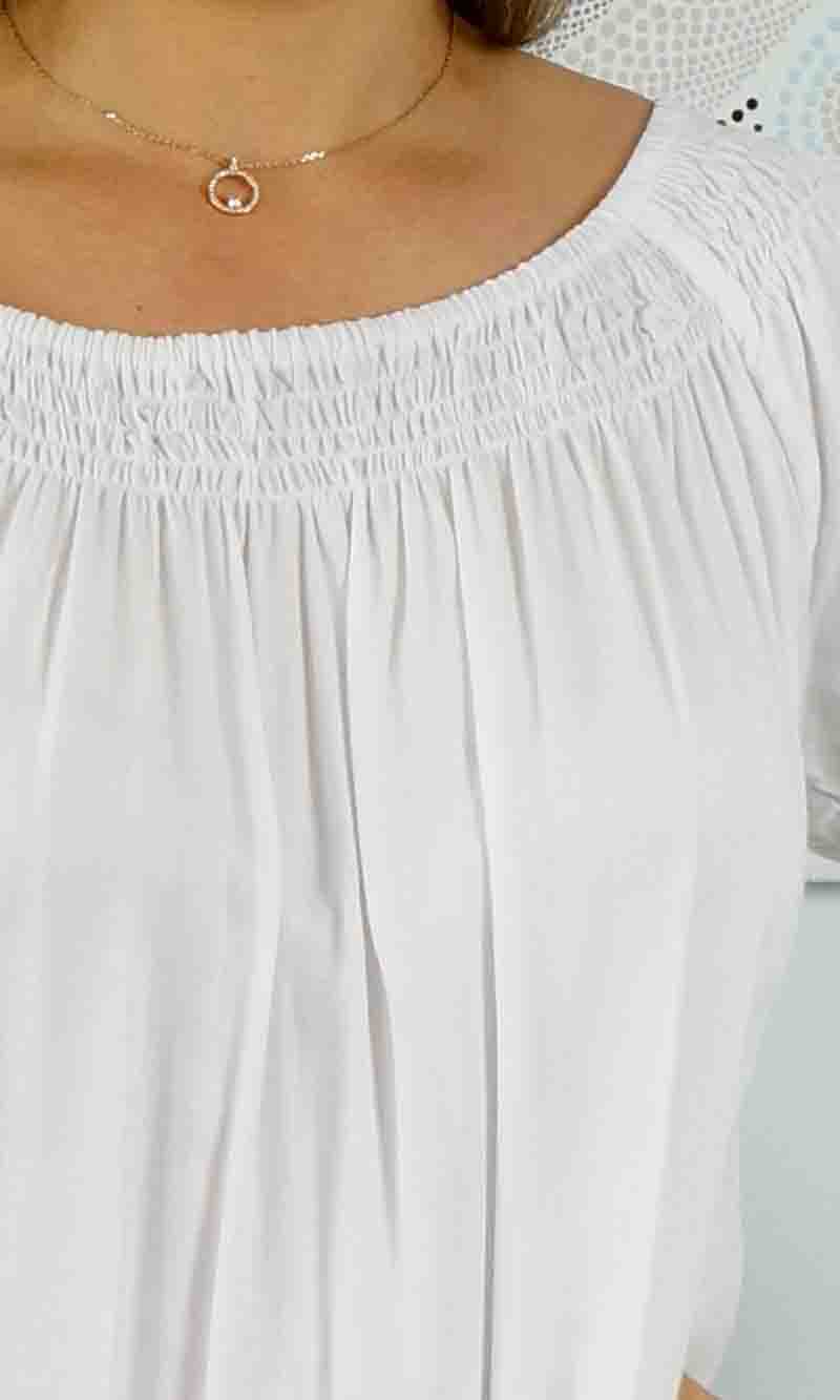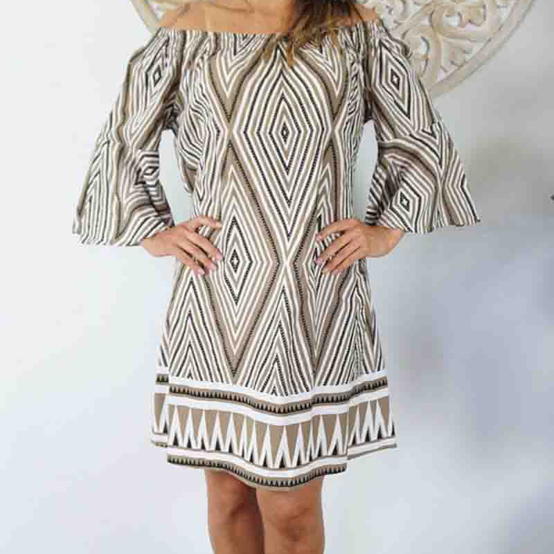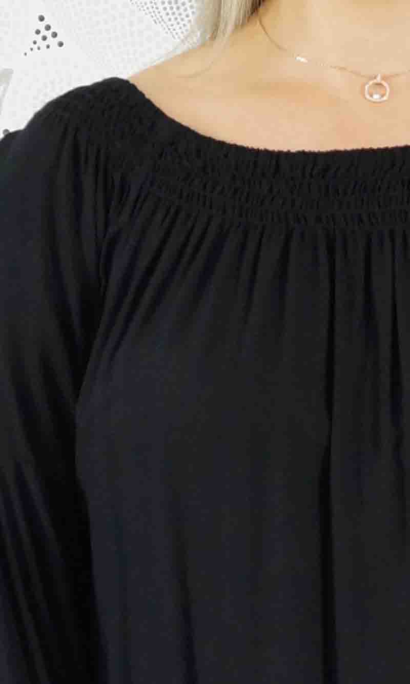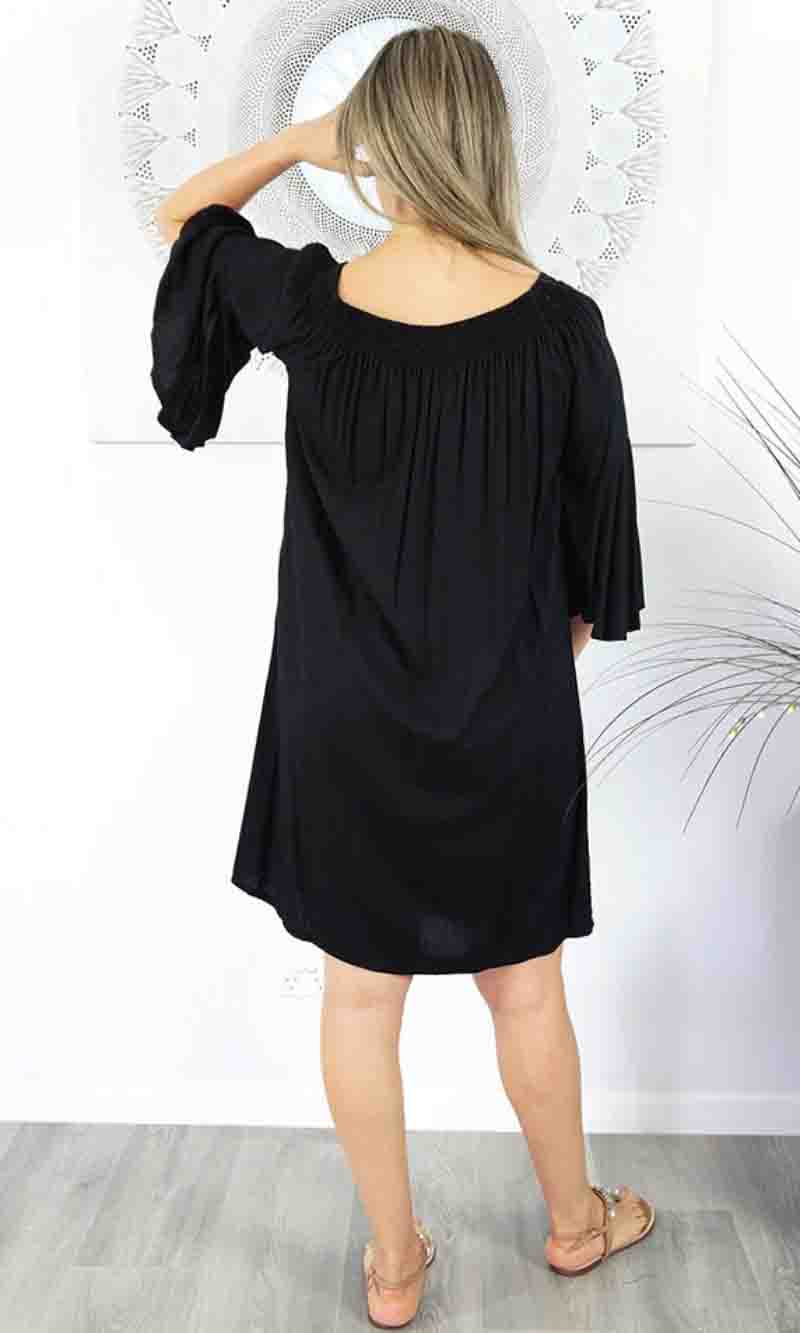 This Malibu dress is suited to those who want comfort and class. Elastic around the top of the dress to wear on or off the shoulders to suit your mood. "Bell" style arms for a bit of flair. Available in 3 sizes.