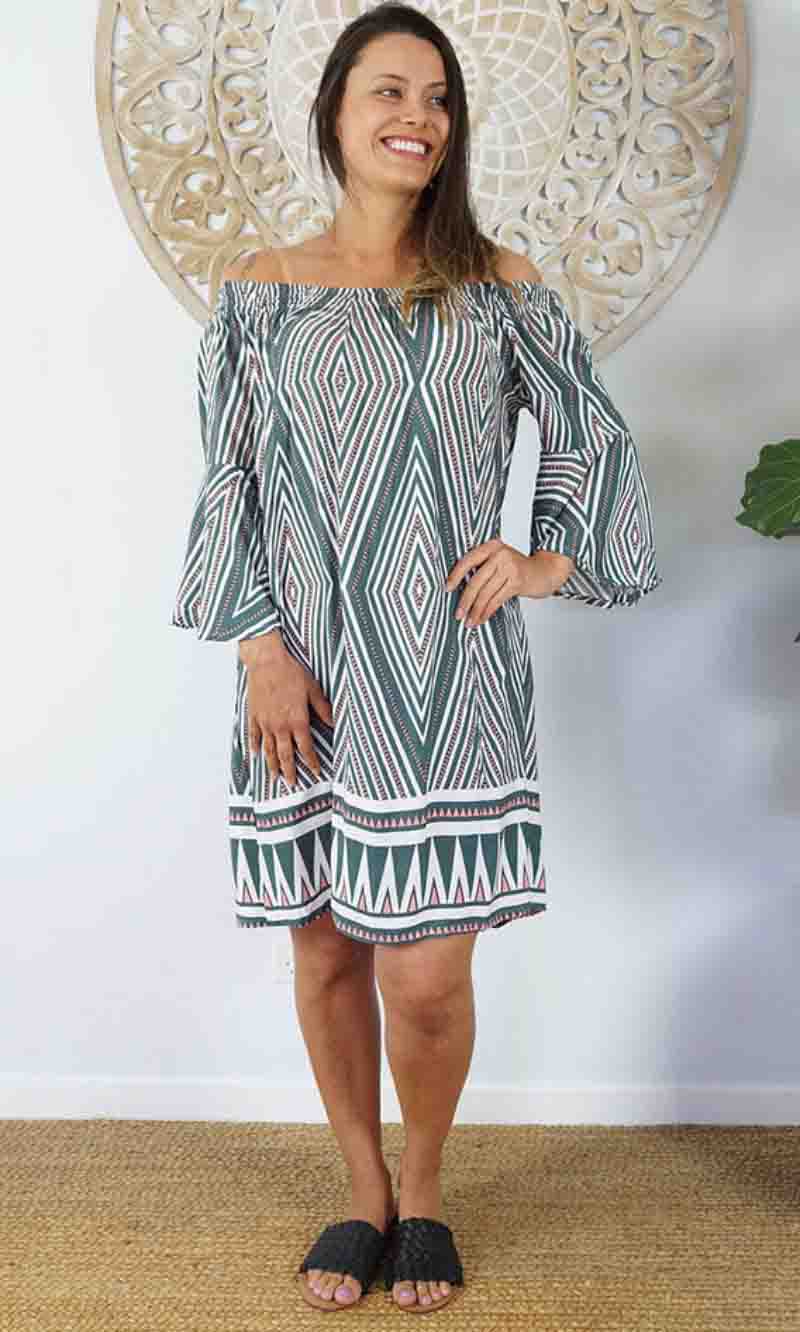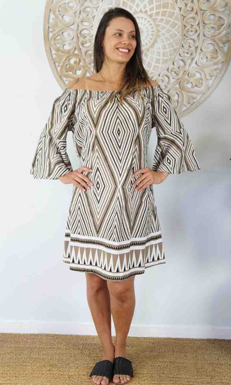 This Malibu dress is suited to those who want comfort and class. Elastic around the top of the dress to wear on or off the shoulders to suit your mood. "Bell" style arms for a bit of flair. Available in 3 sizes.
