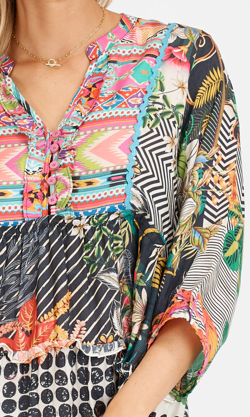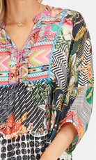 Look your best in this beautiful 3/4 length sleeve blouse. You will love the flattering V-neck with frill and the stylish ric-rac braid trim. Enjoy the convenience of the easy-to-use loop and button opening. Refresh your wardrobe with this chic and unique design!