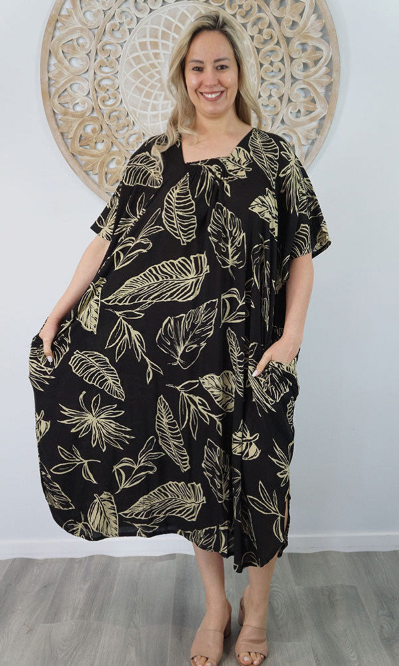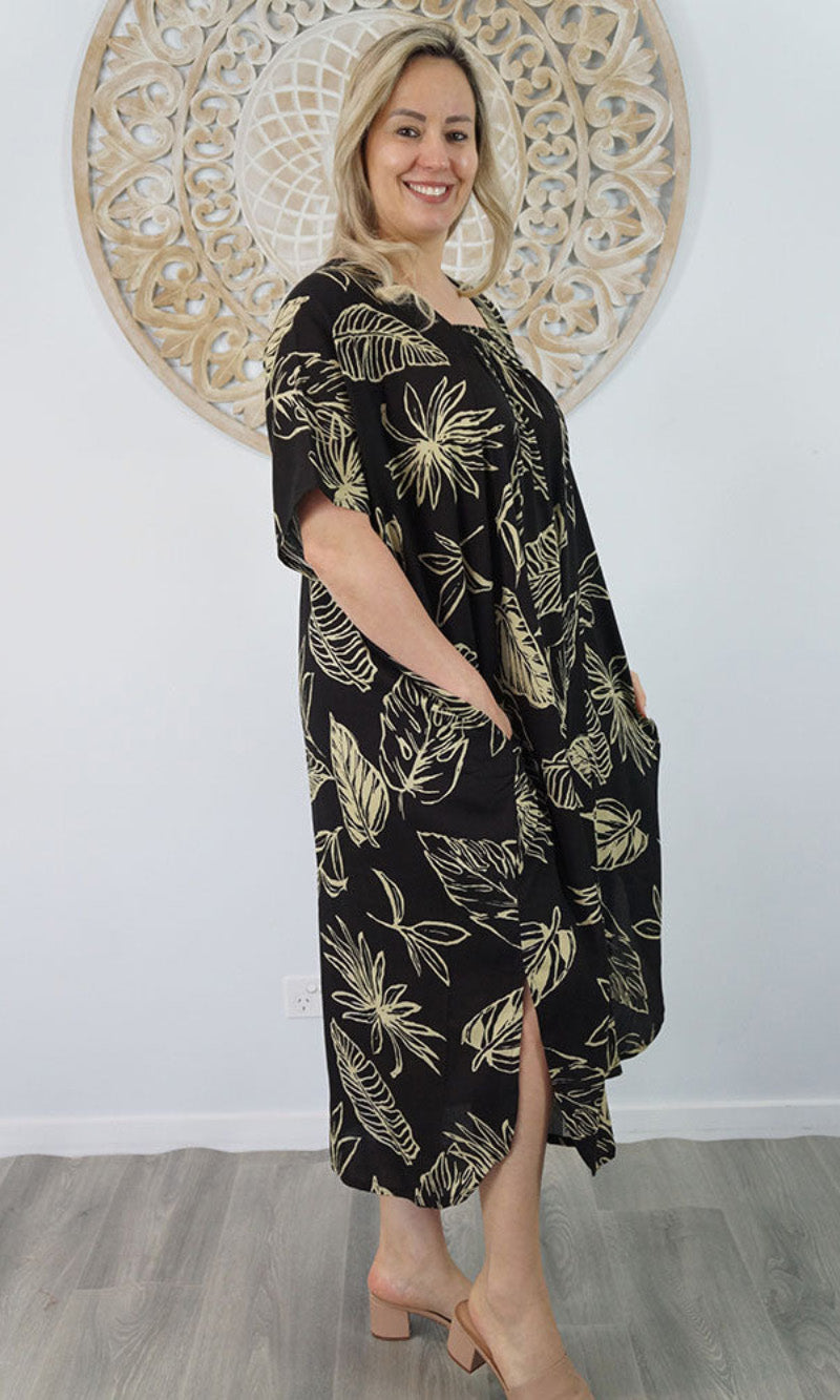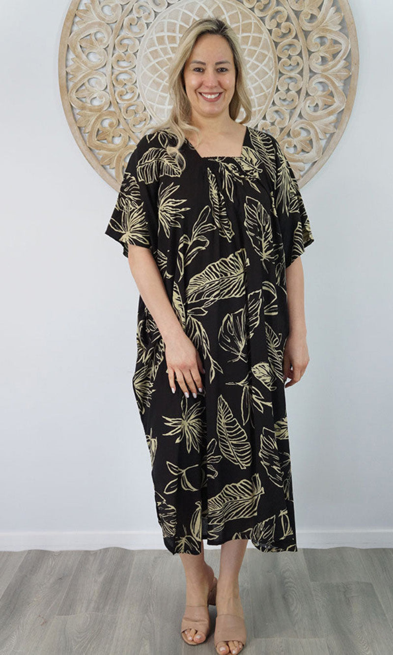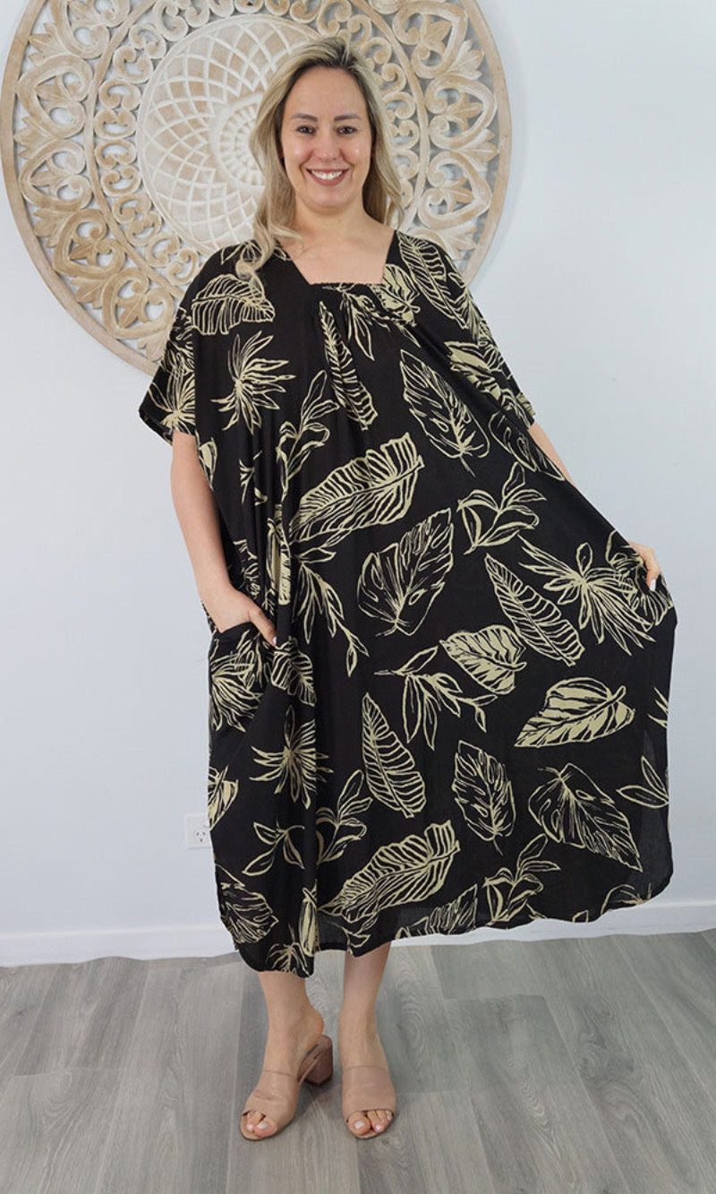 Introducing the Bermuda Kaftan in our "Kerala" print. This is a long, plus size kaftan featuring front shirring, side pockets and splits.
