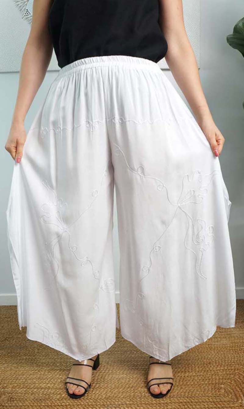 A comfortable embroidered pant with a below knee length split on each leg and a elastic waist to fit sizes 10-16.