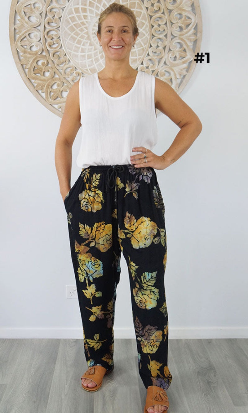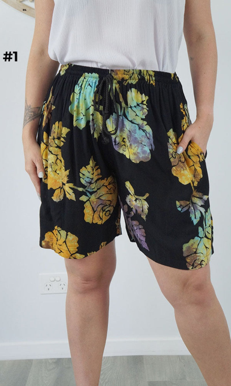Cool and bright 100% rayon Happy Shorts. Free size to fit most sizes 8-18. Printed using traditional Batik methods.