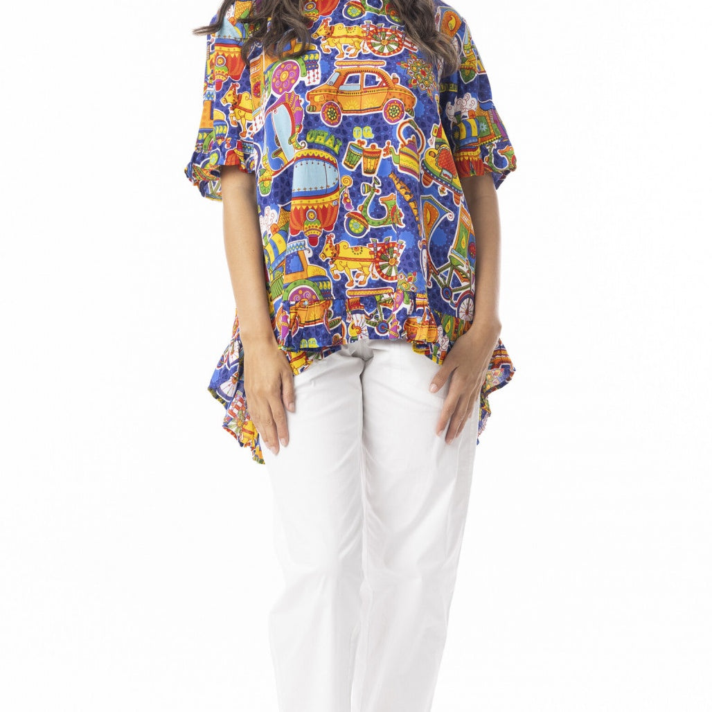 The Orientique frill sleeve top is a round neck top with a scalloped hemline and elbow length sleeve. It has placket and buttons below the yoke down the back.
