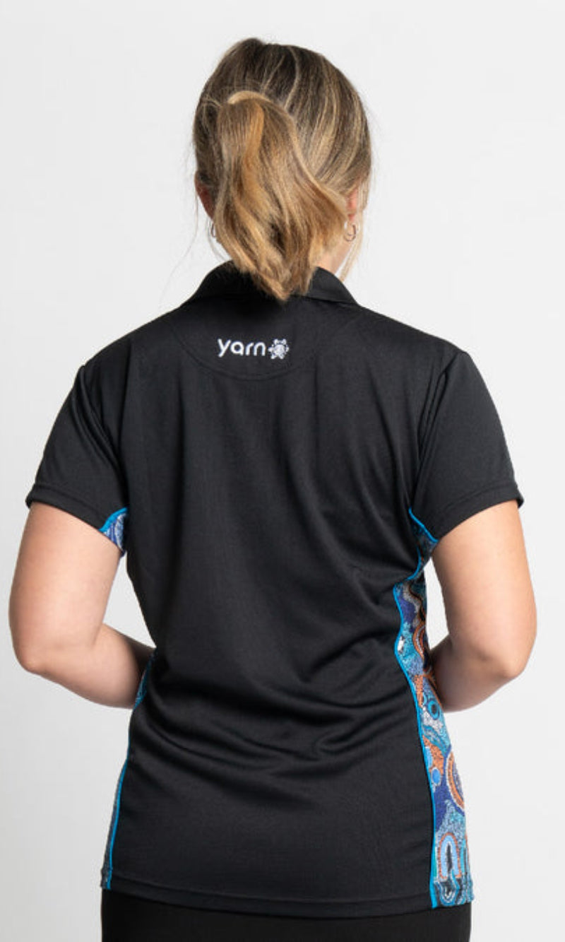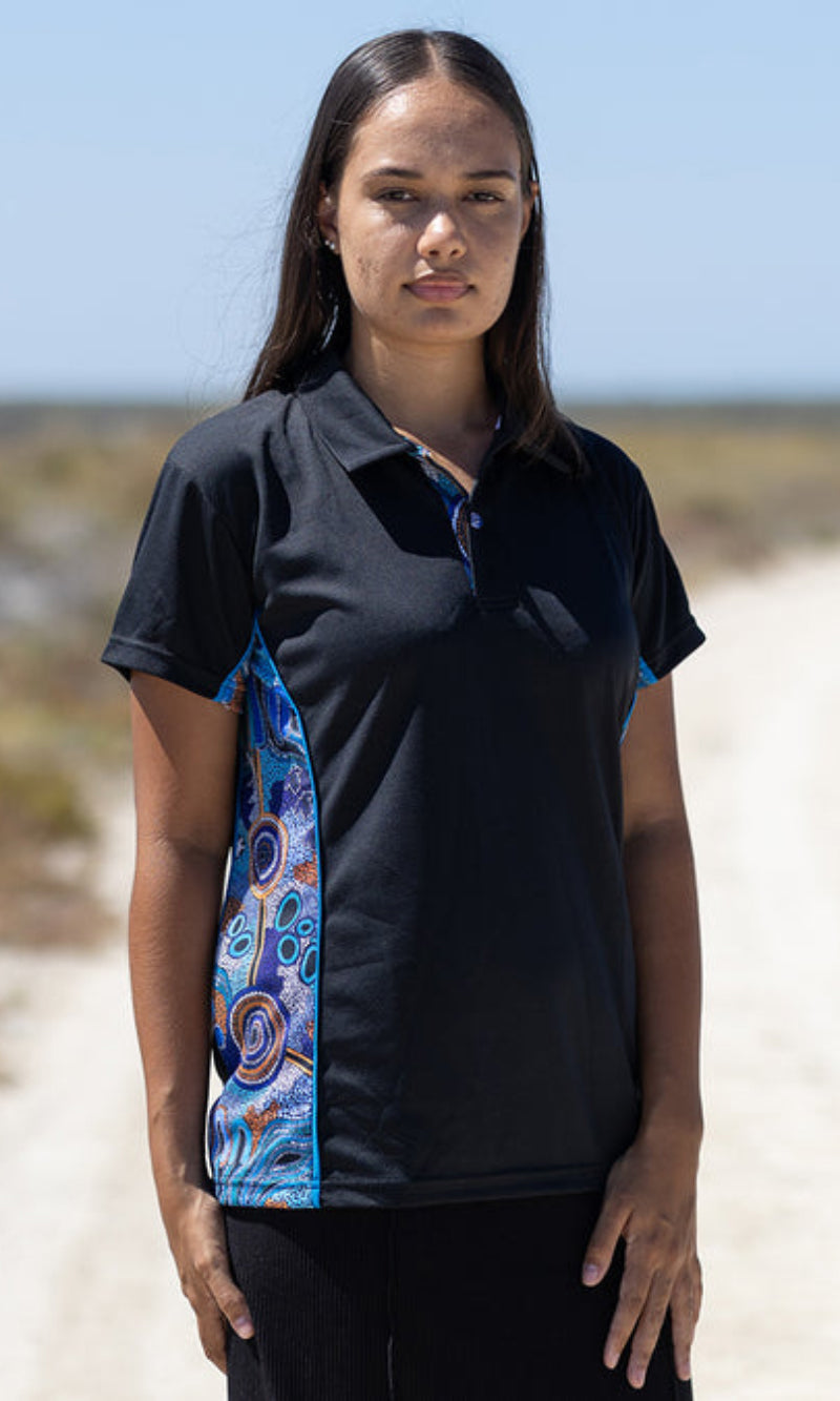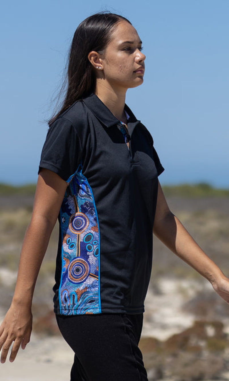 Aboriginal Art Ladies Fitted Bamboo (Simpson) Polo Calm Place