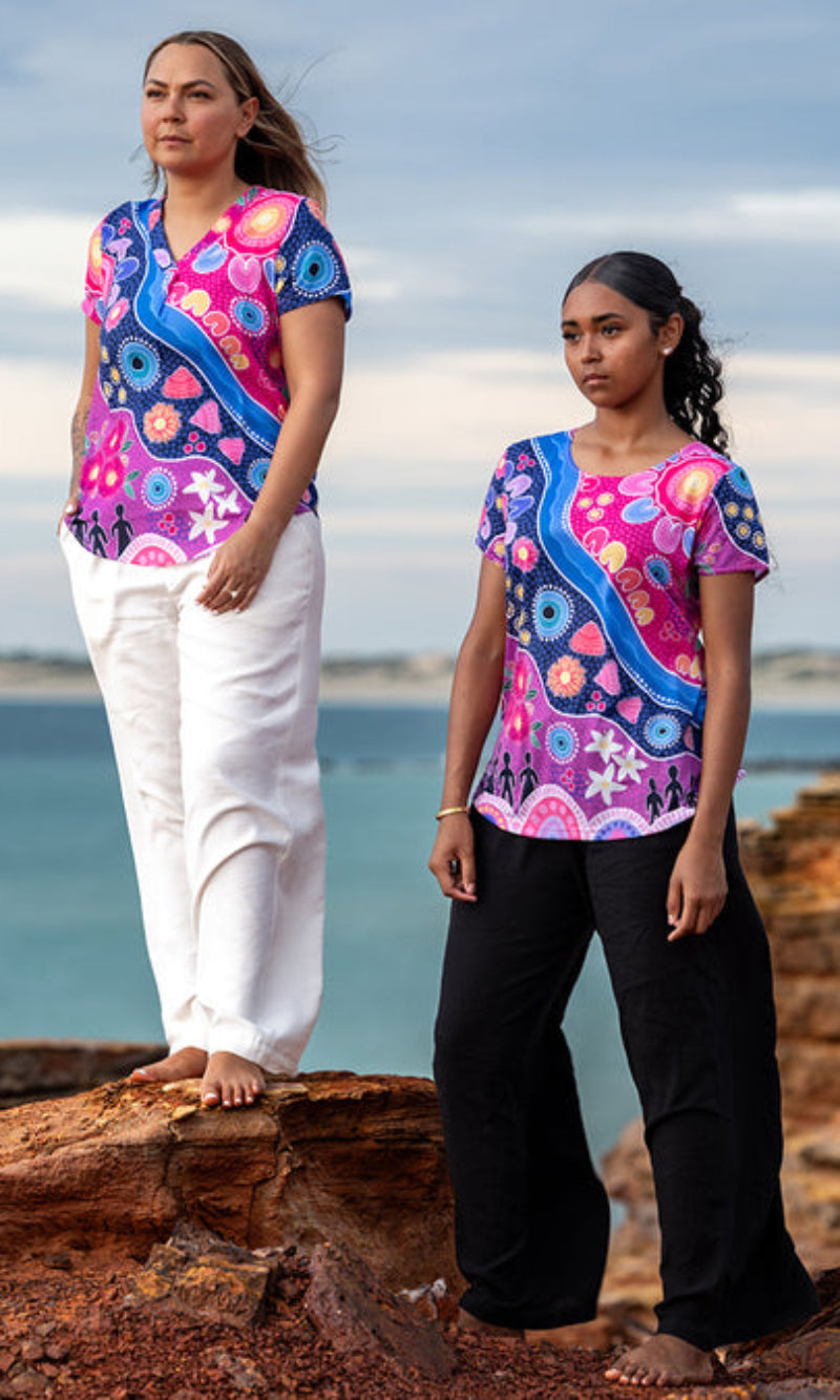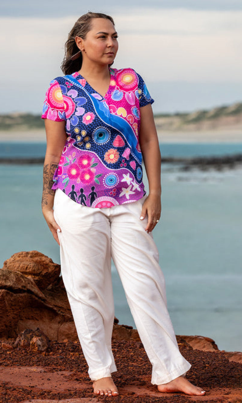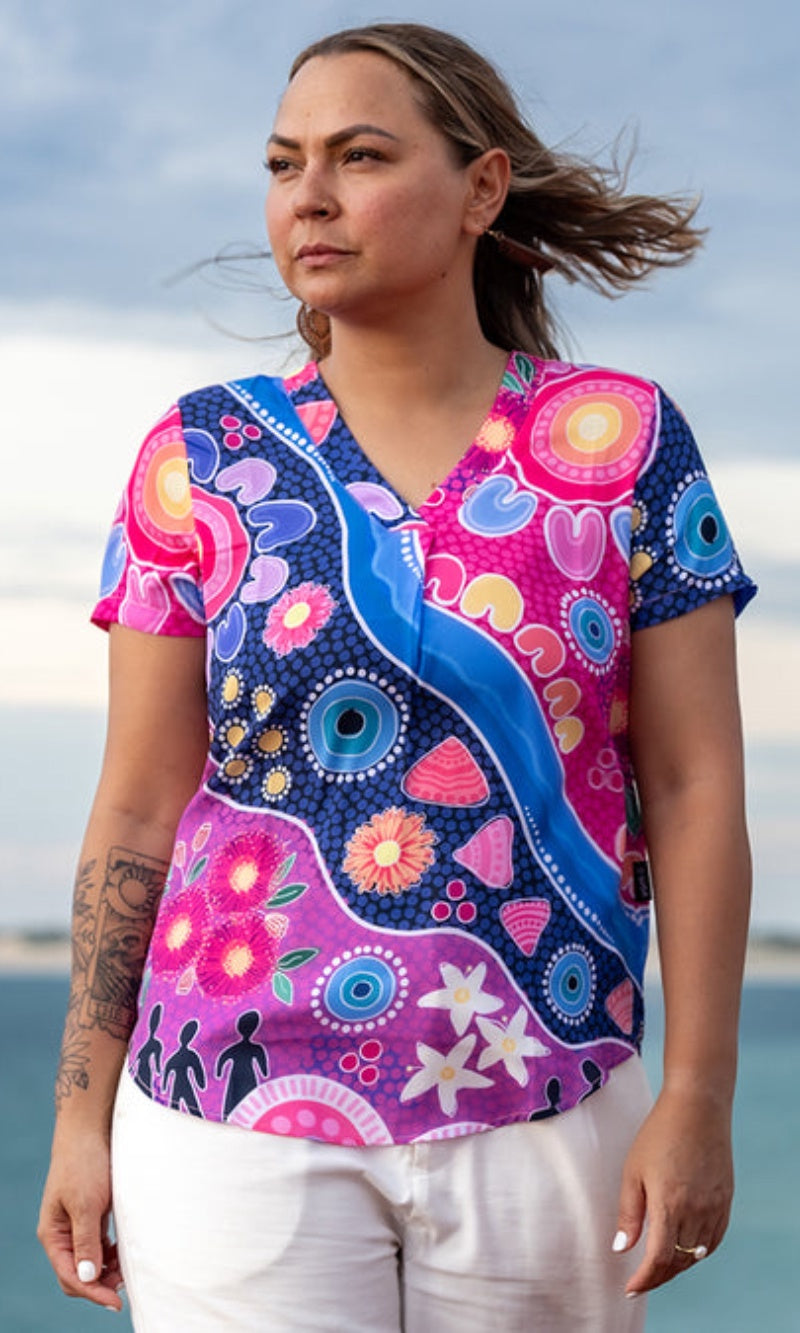 I have included bush foods and bush medicines (flowering gum, wattle, lilli pilli, lemon myrtle, pippi shells) which are sustained through the flowing river and waterholes. We live in harmony with Country, we care for Country and Country provides for us in return.