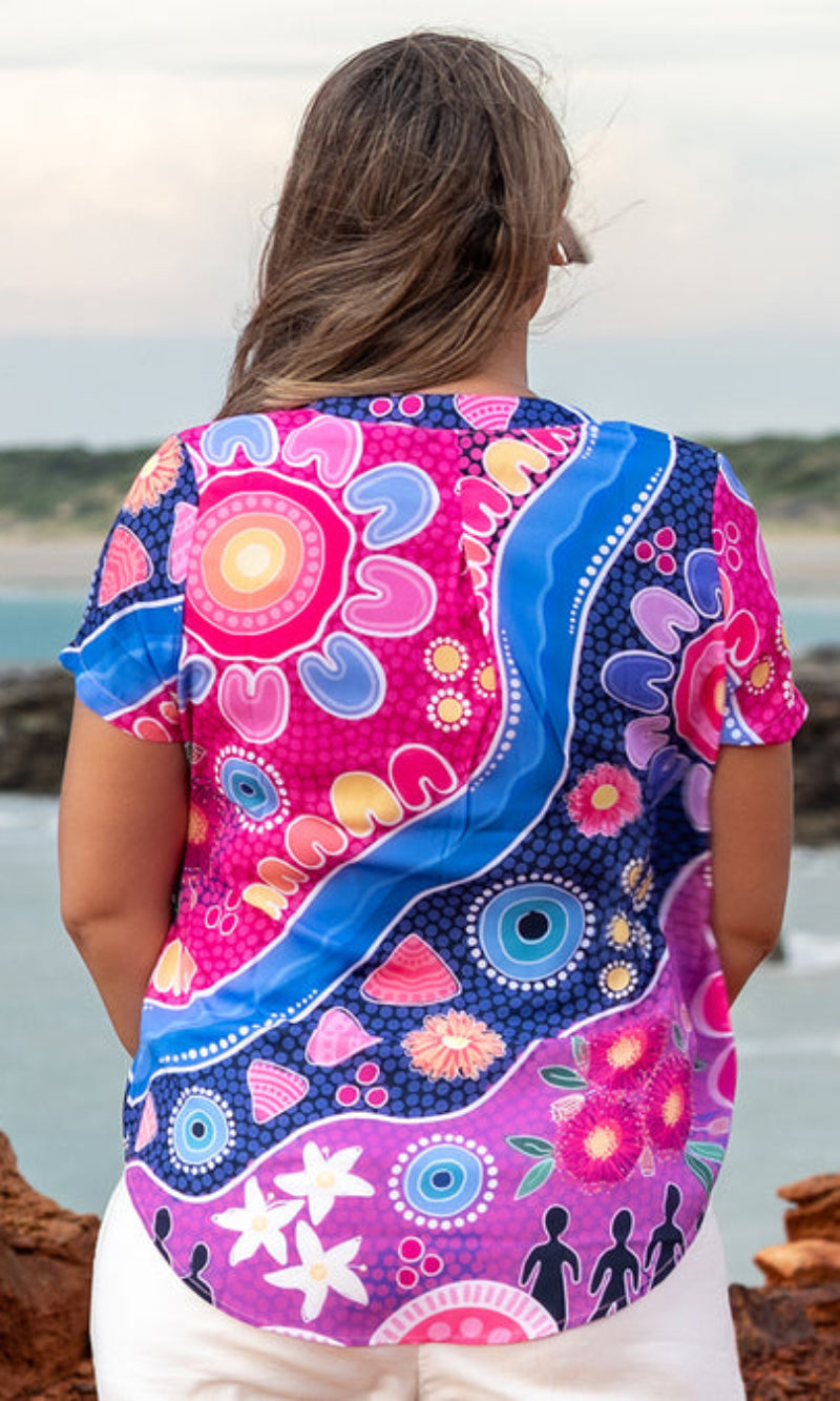 Aboriginal Art Women's V Neck Blouse Short Sleeve Thriving Together