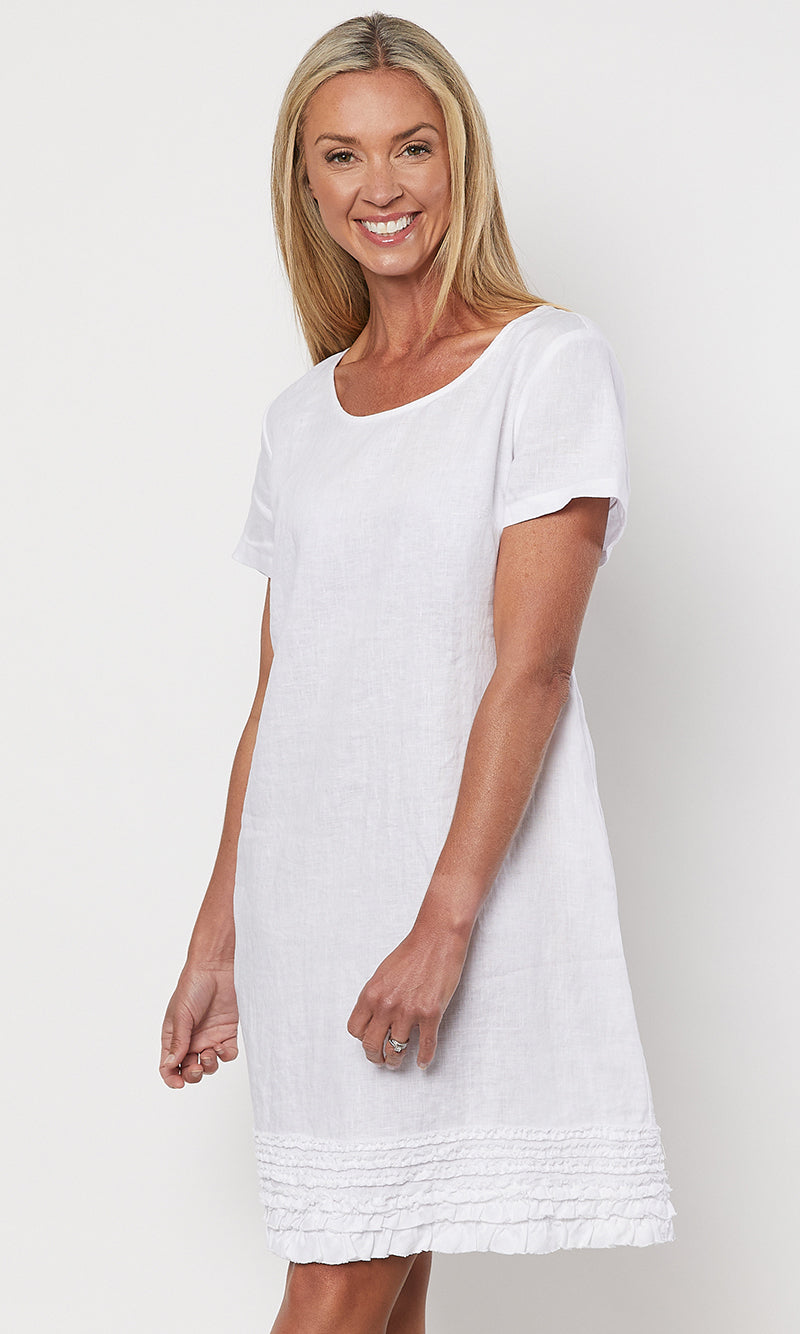The Ruffle Hem Linen dress by Gordon Smith is a best seller and must- have for any wardrobe. Styled in our signature washer finish linen. Easy care and easy wear style make this the perfect pop on and go dress for any occasion. Style that fits the way you live.