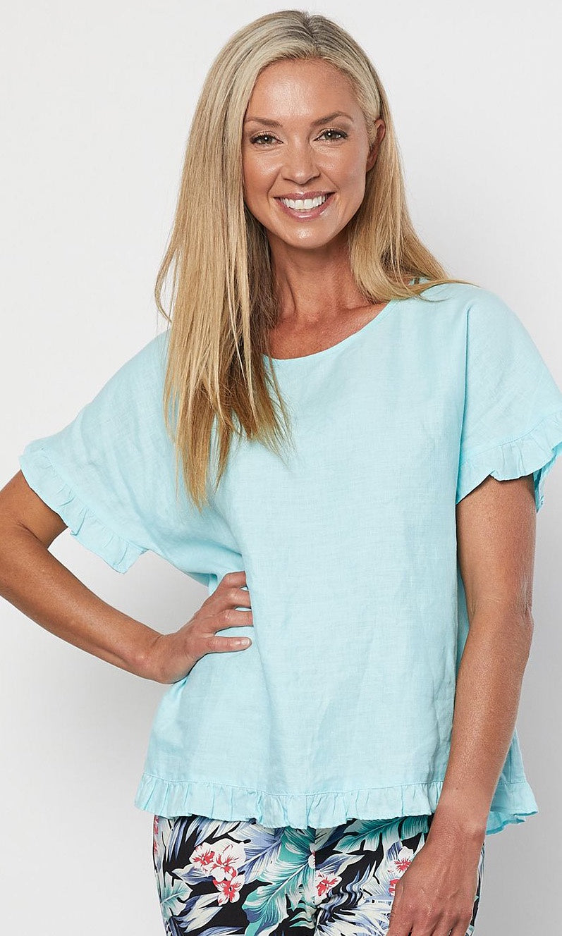 The Julie Frill Trim Linen Top by Gordon Smith is one of our best selling style!